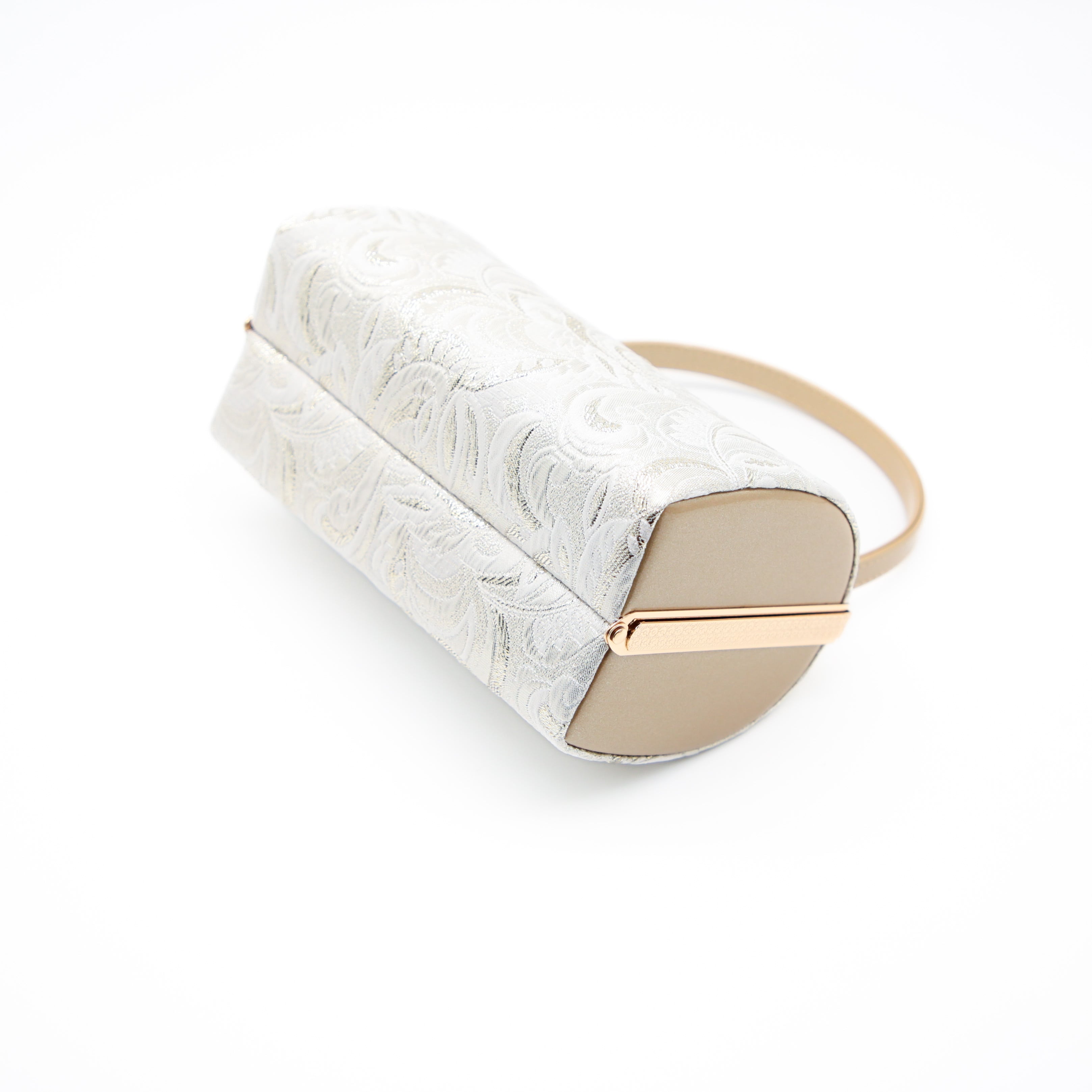 バッグと鼻緒には、光沢のある銀糸の織り生地を使用しており、洋風も感じさせるモダンな唐草文様は、どんな色柄のお着物にも馴染みが良く、上品な印象を与えます。