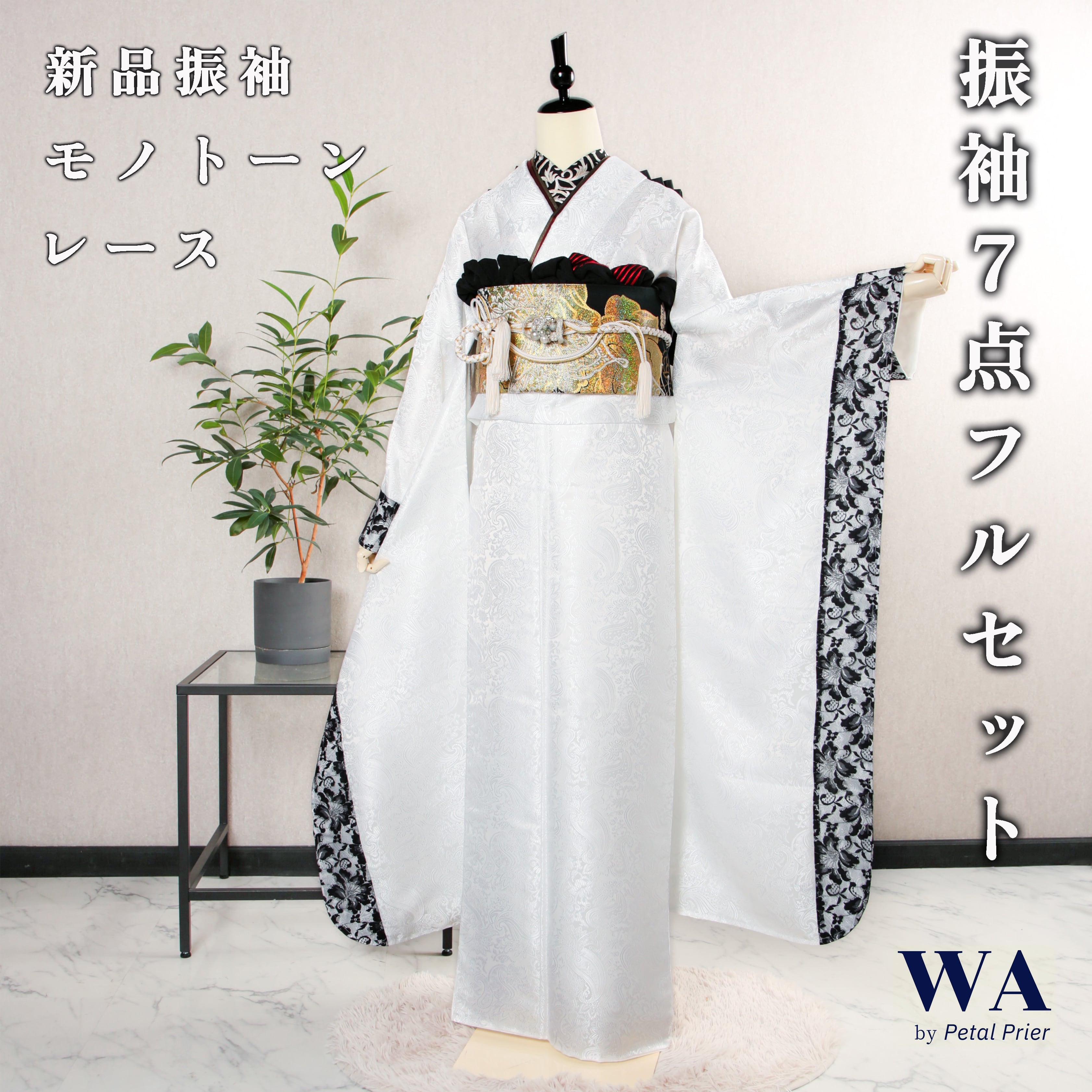 振袖フルセット 振袖セット 振袖 新品+USED品 LLサイズ レース×モノトーン 白 黒 ゴージャス 成人式 着物 晴れ着 7点フルセット FWRT-4