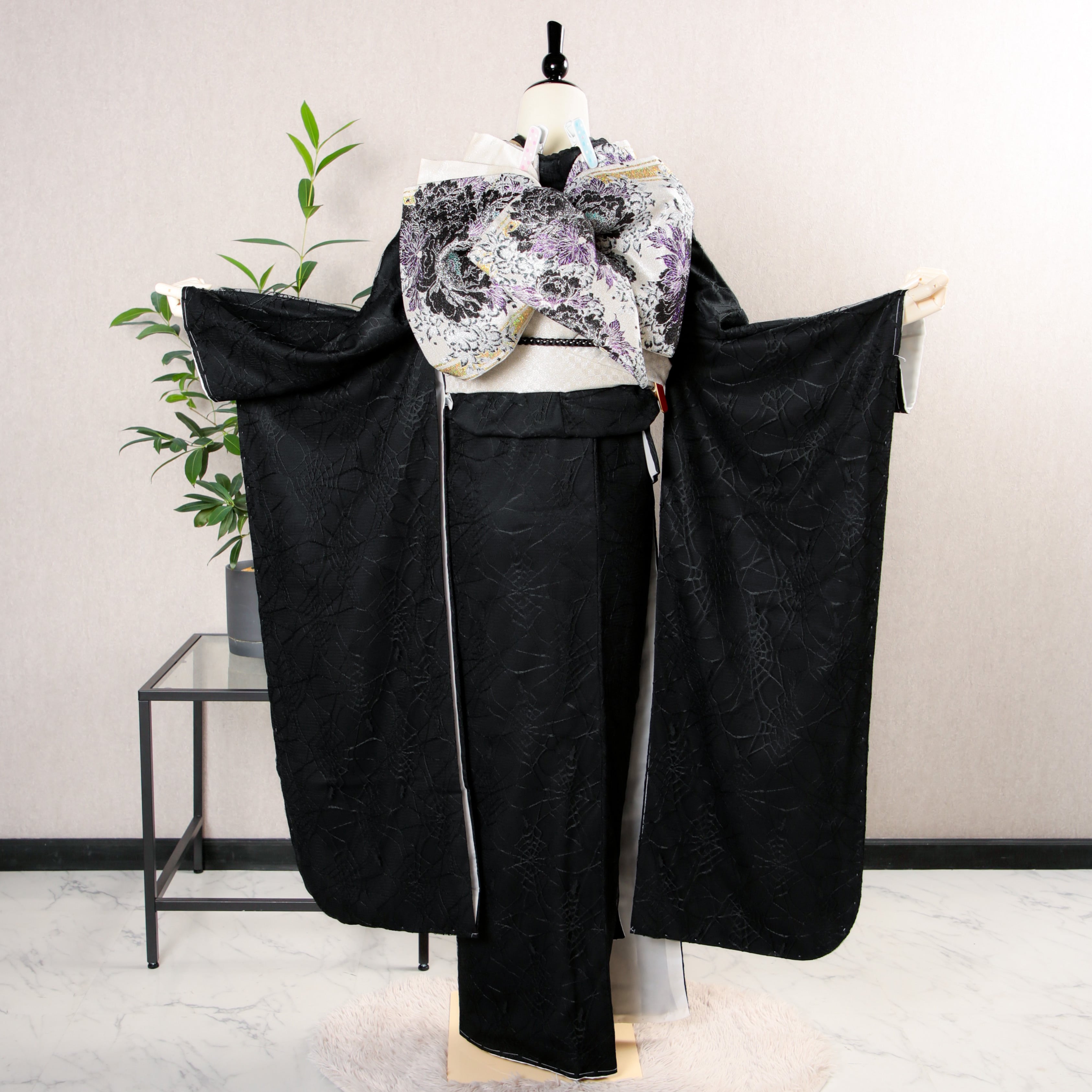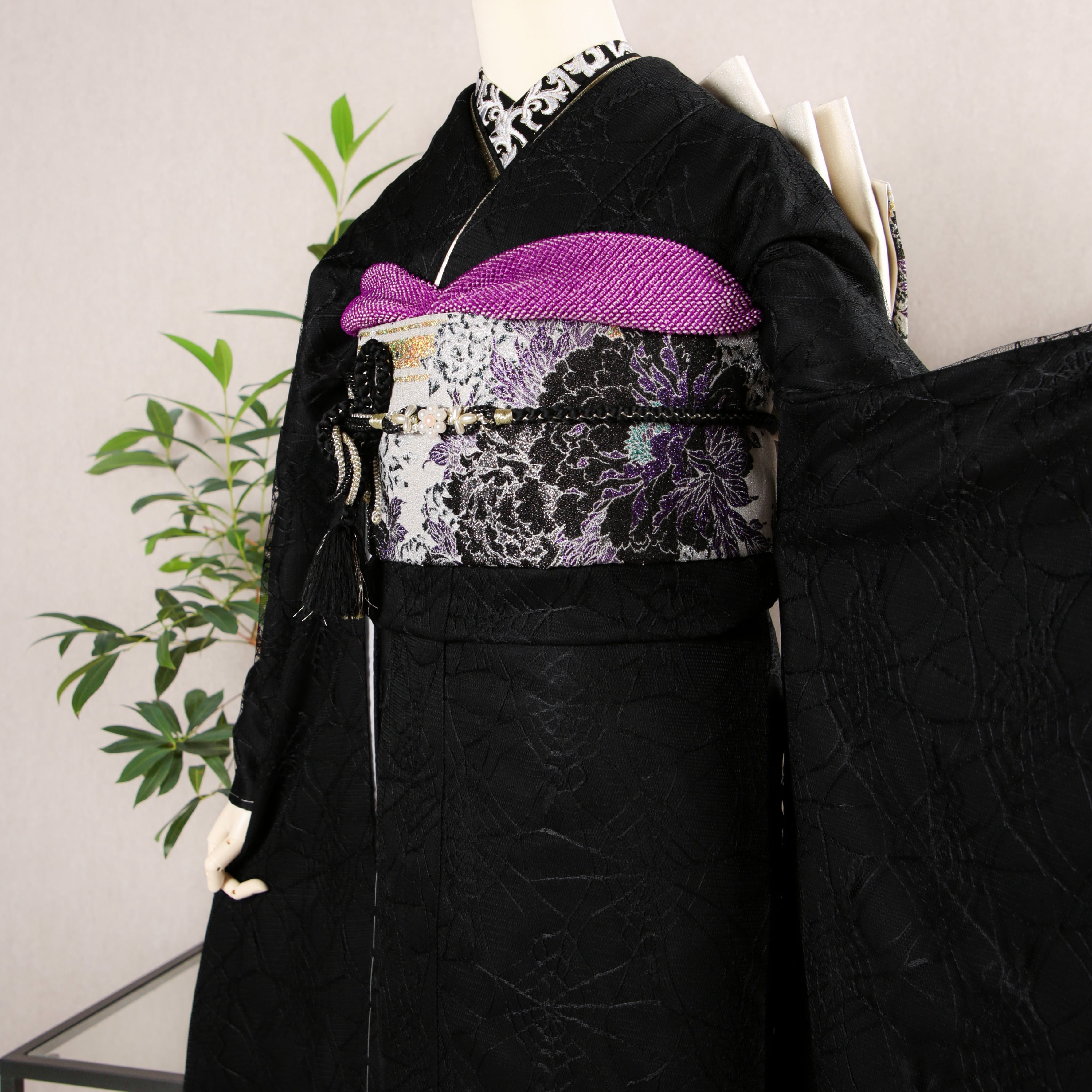 一見シンプルな黒に見えて、光の加減で浮かび上がる繊細な蜘蛛の巣の地紋の振袖です。