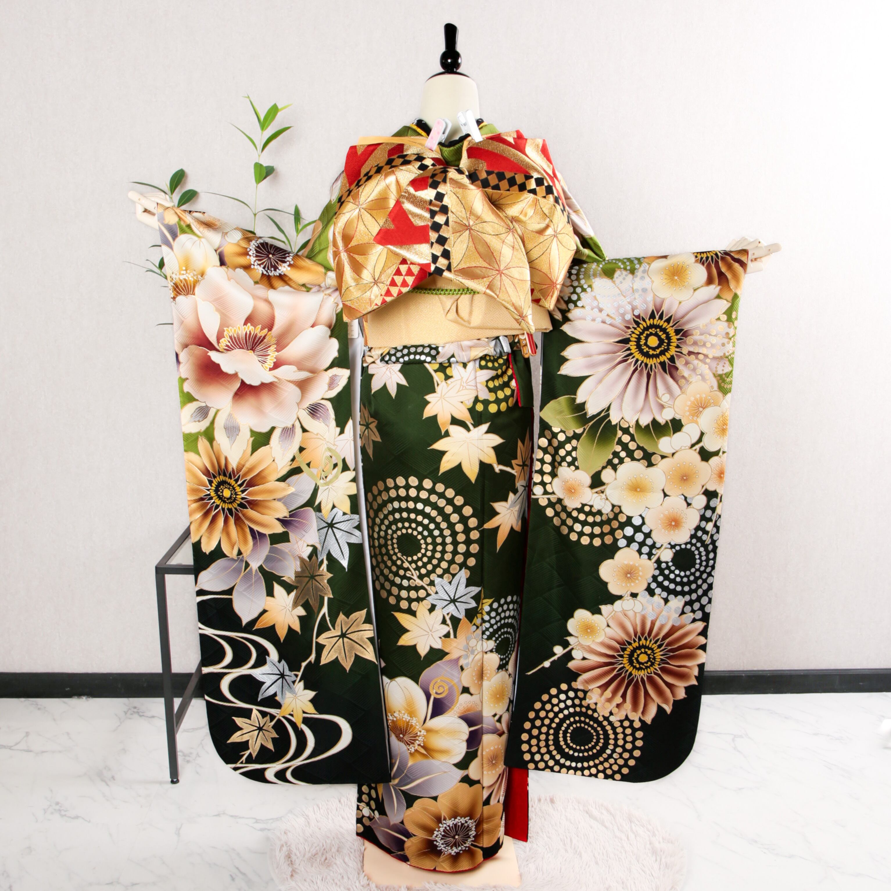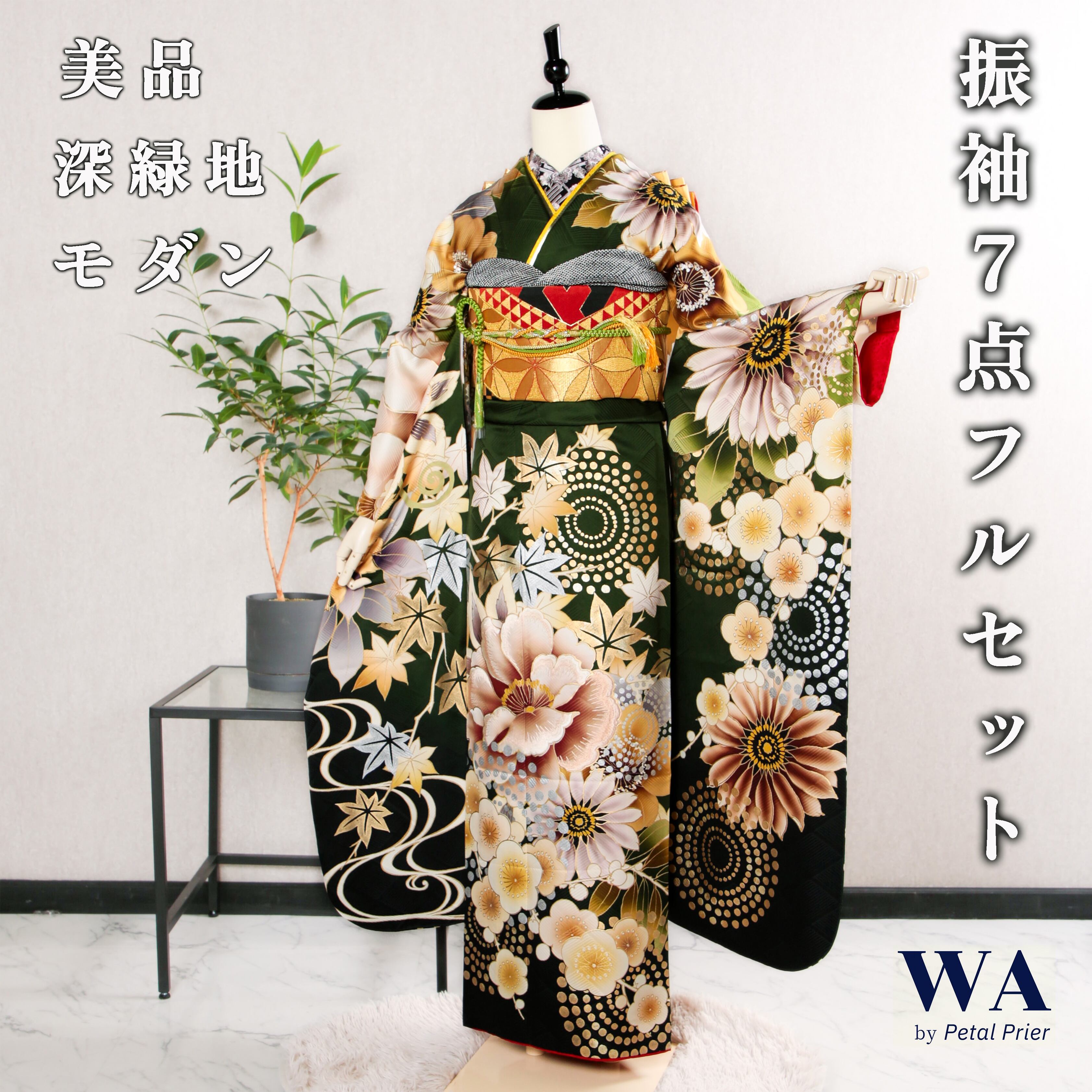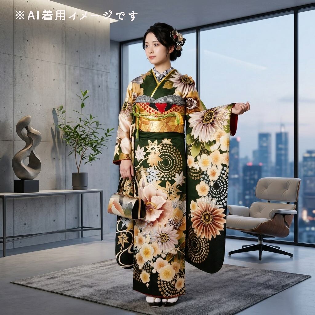 振袖フルセット 振袖セット 振袖 LLサイズ 中古 深緑×モダン レトロ 菊 牡丹 美品 成人式 着物 晴れ着 7点フルセット F-571