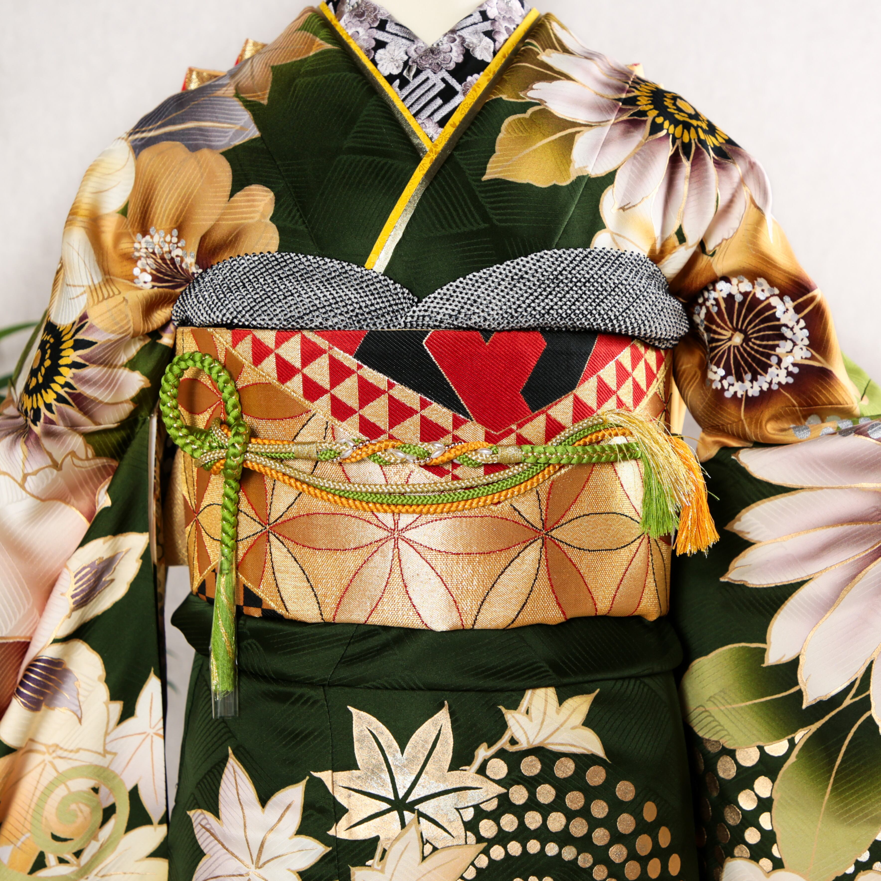そんな方にぴったりの、エッジが効いた深緑の振袖です。