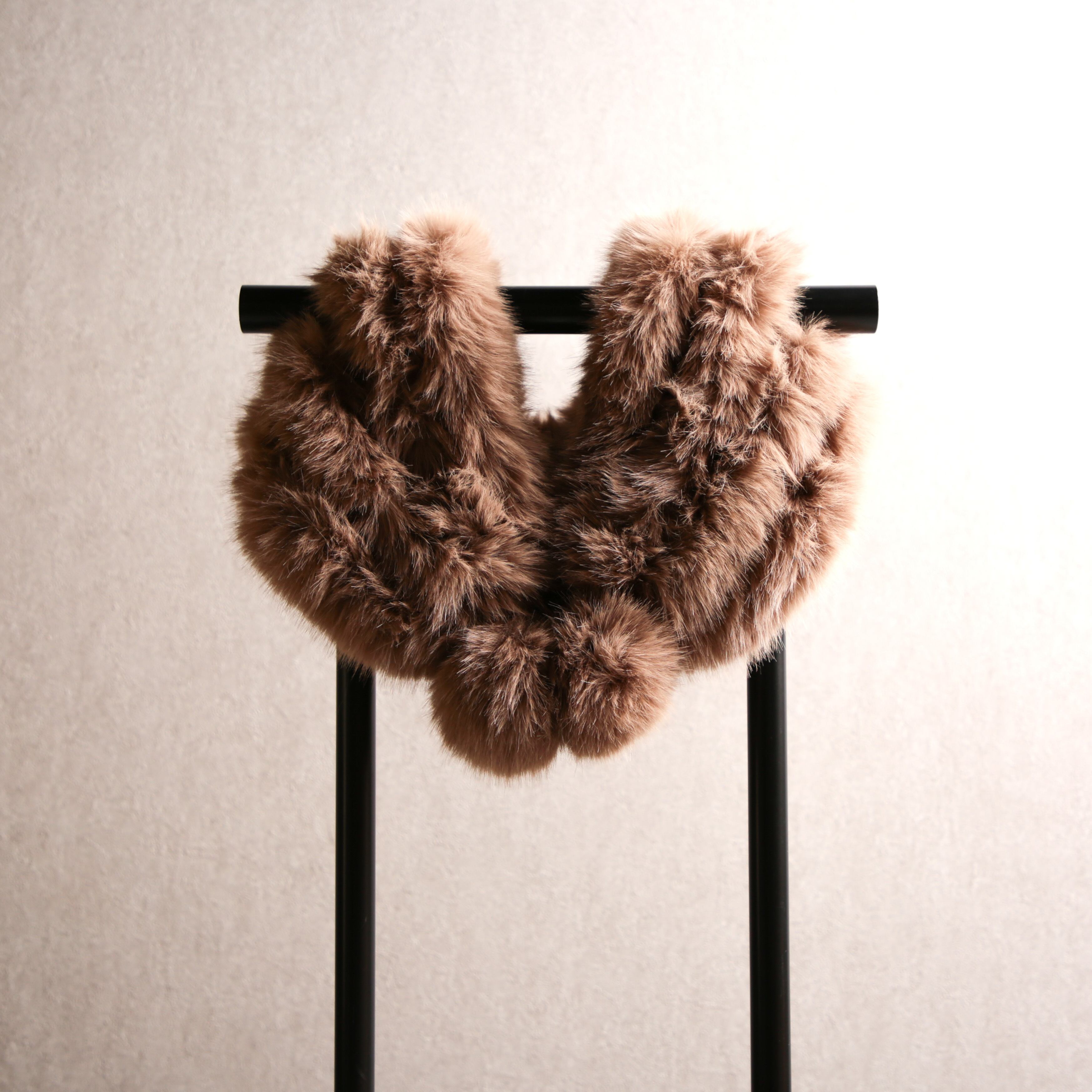 柔らかなニュアンスカラーが美しい、高級感あふれるフェイクファーショールです。