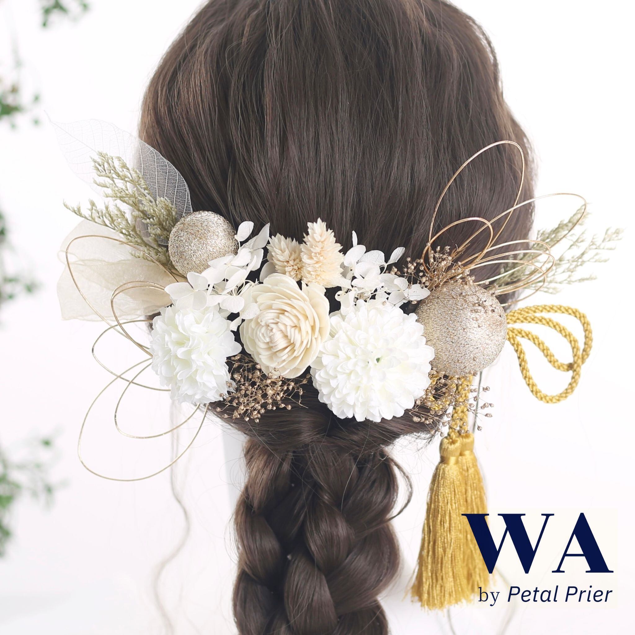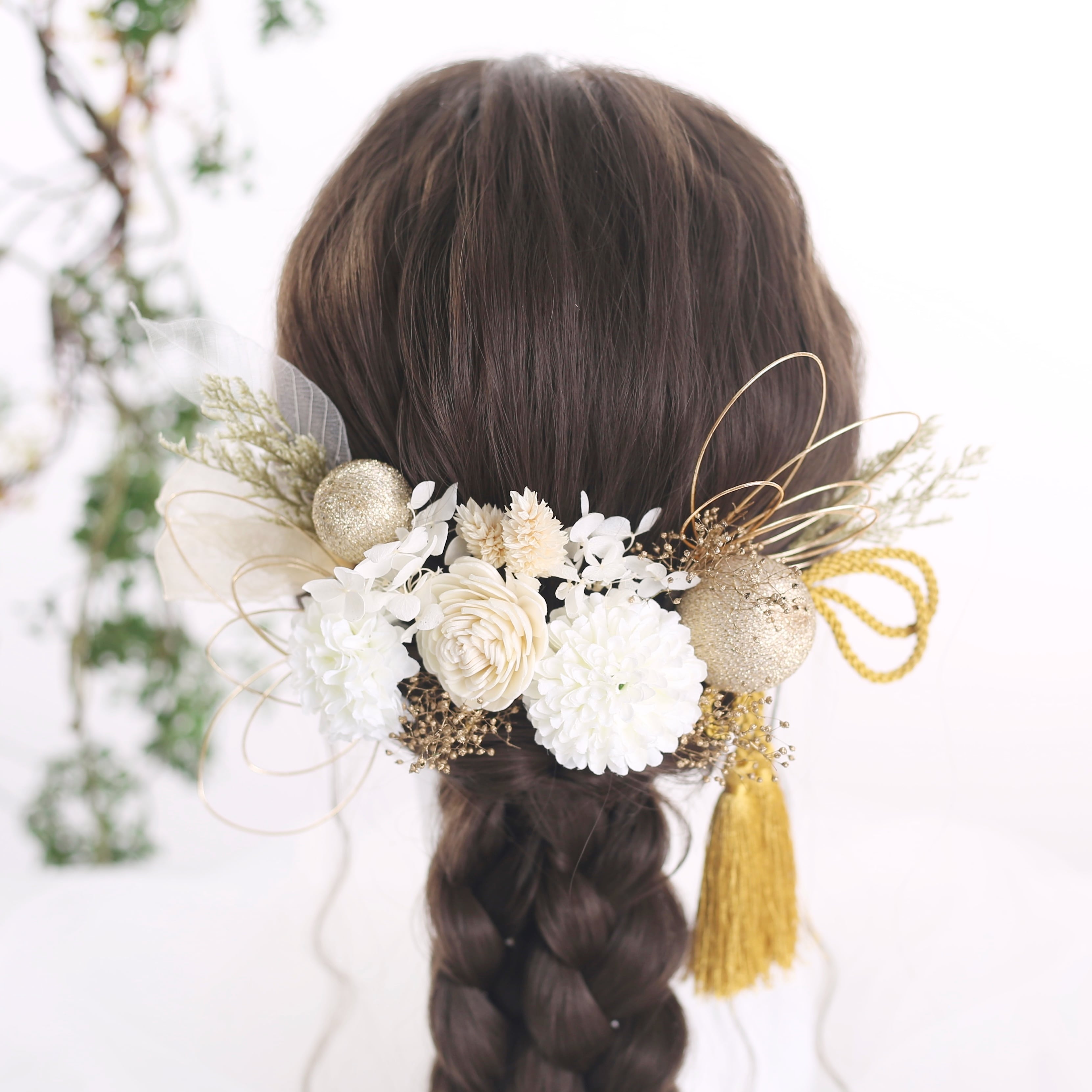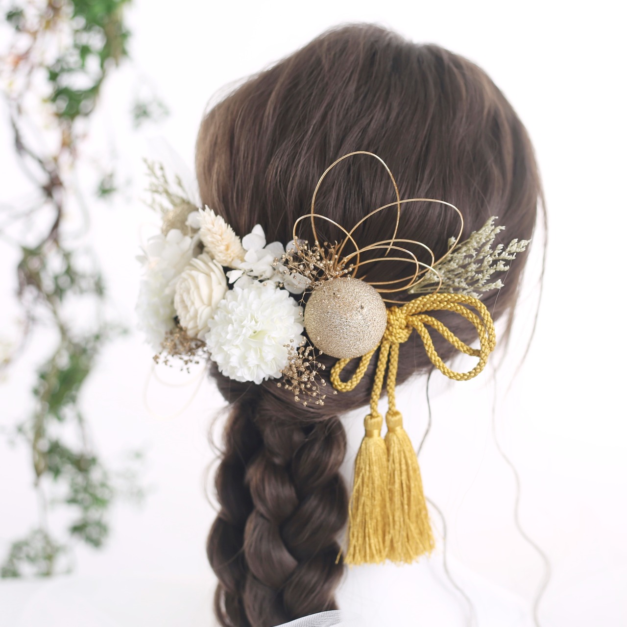 髪飾り 髪飾りセット 成人式 振袖 結婚式 ブライダル ヘッドドレス 卒業式 七五三 前撮り 白 ホワイト ゴールド ダリア ドライフラワー 水引 タッセル リボン K-50 | WA by Petal Prier