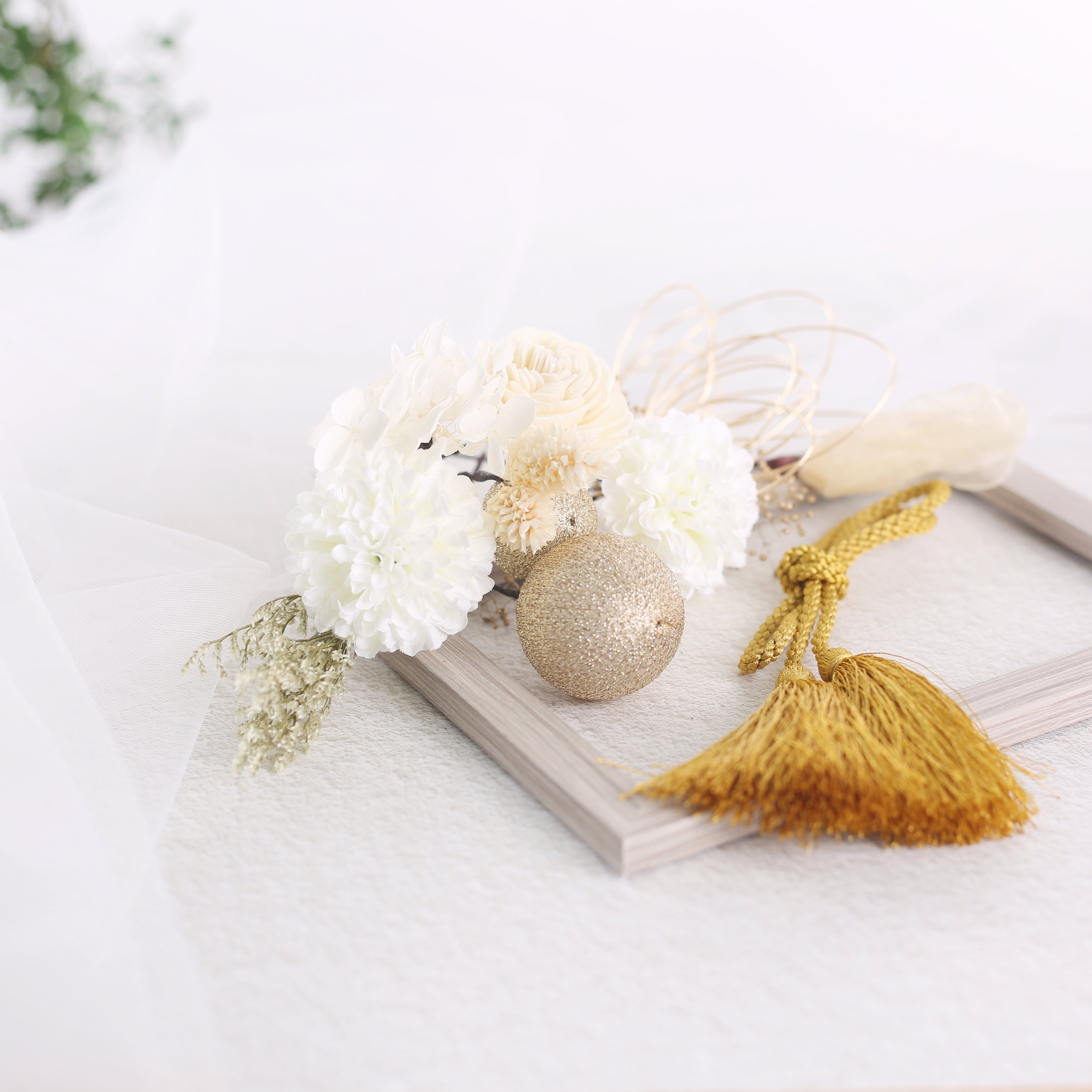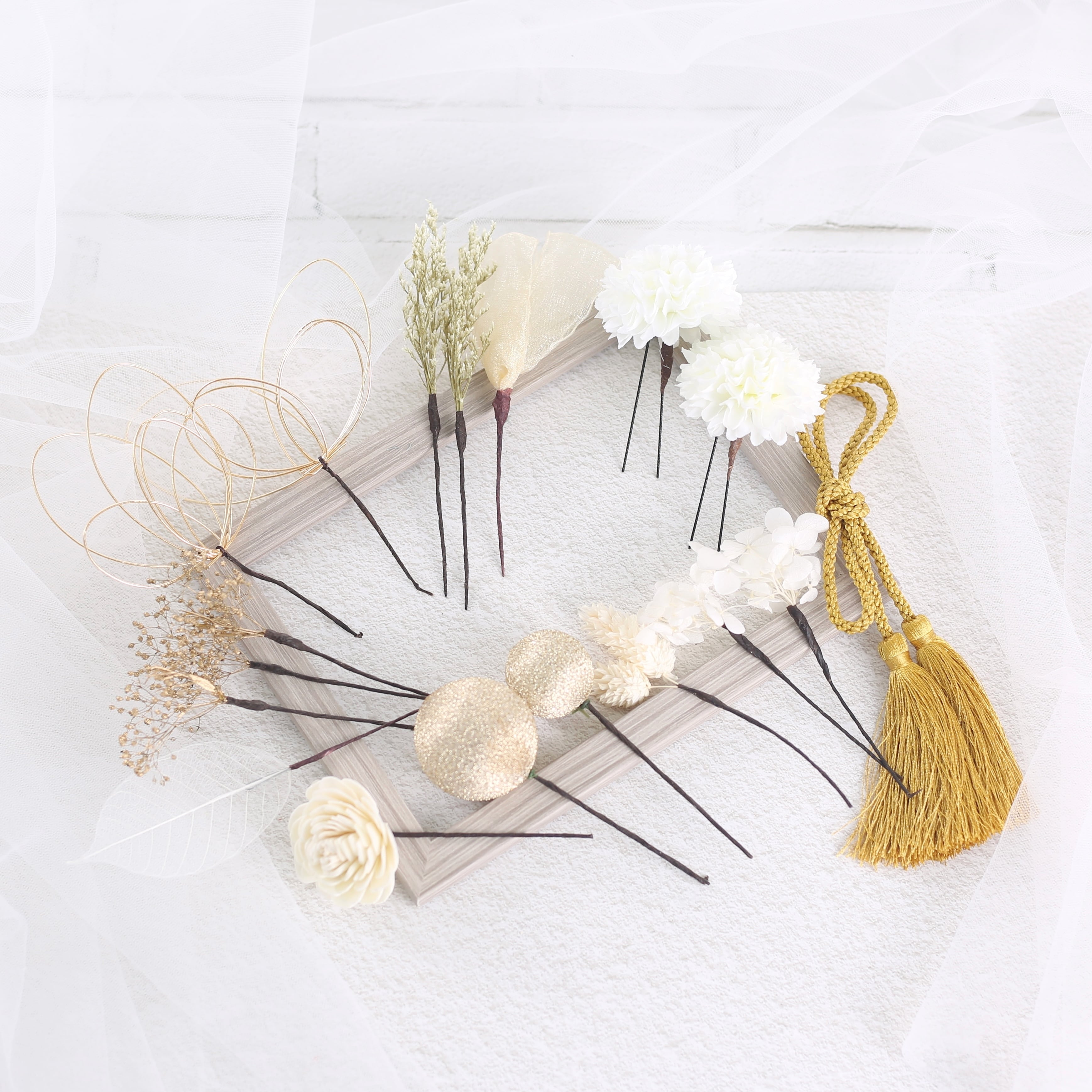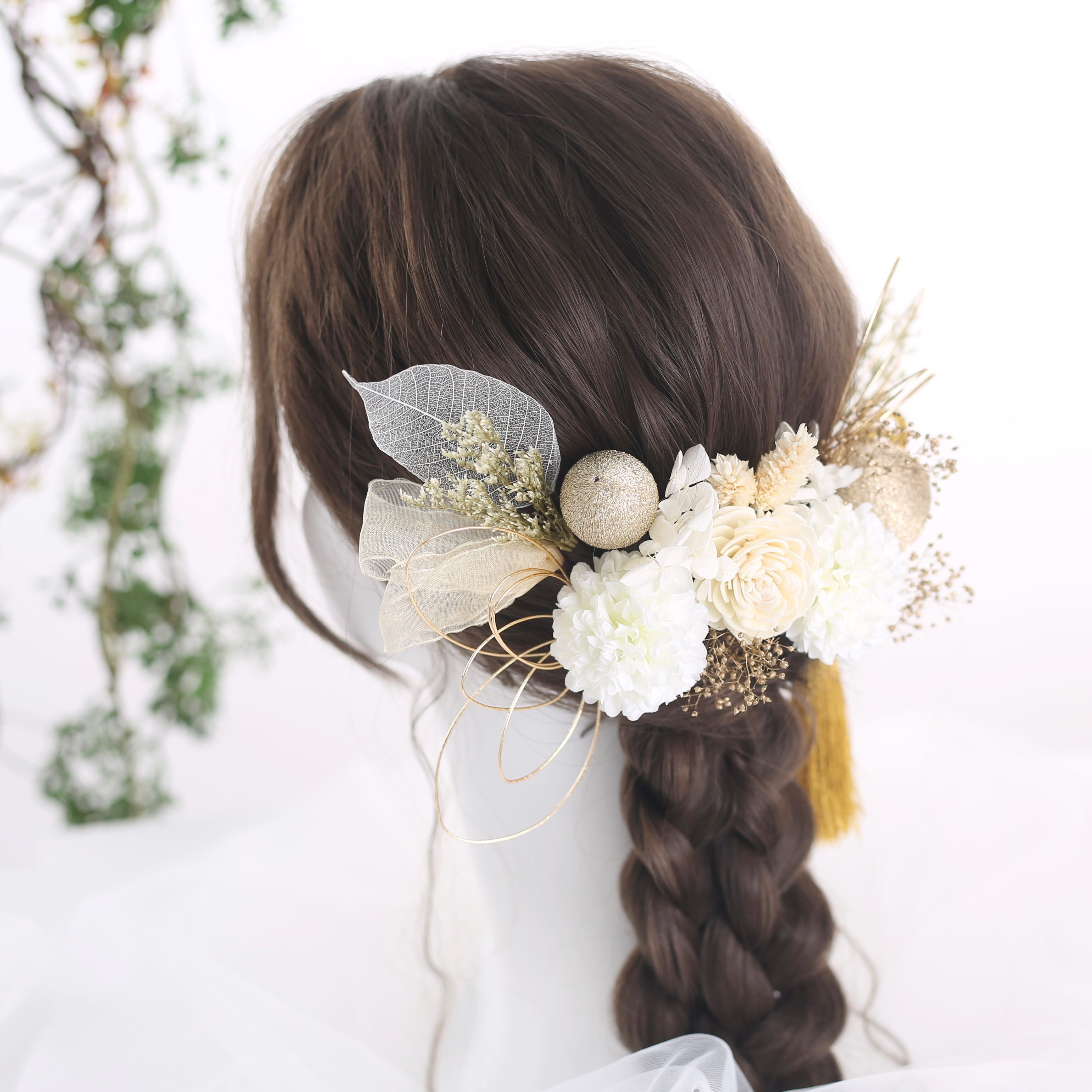 髪飾り 髪飾りセット 成人式 振袖 結婚式 ブライダル ヘッドドレス 卒業式 七五三 前撮り 白 ホワイト ゴールド ダリア ドライフラワー 水引 タッセル リボン K-50 | WA by Petal Prier