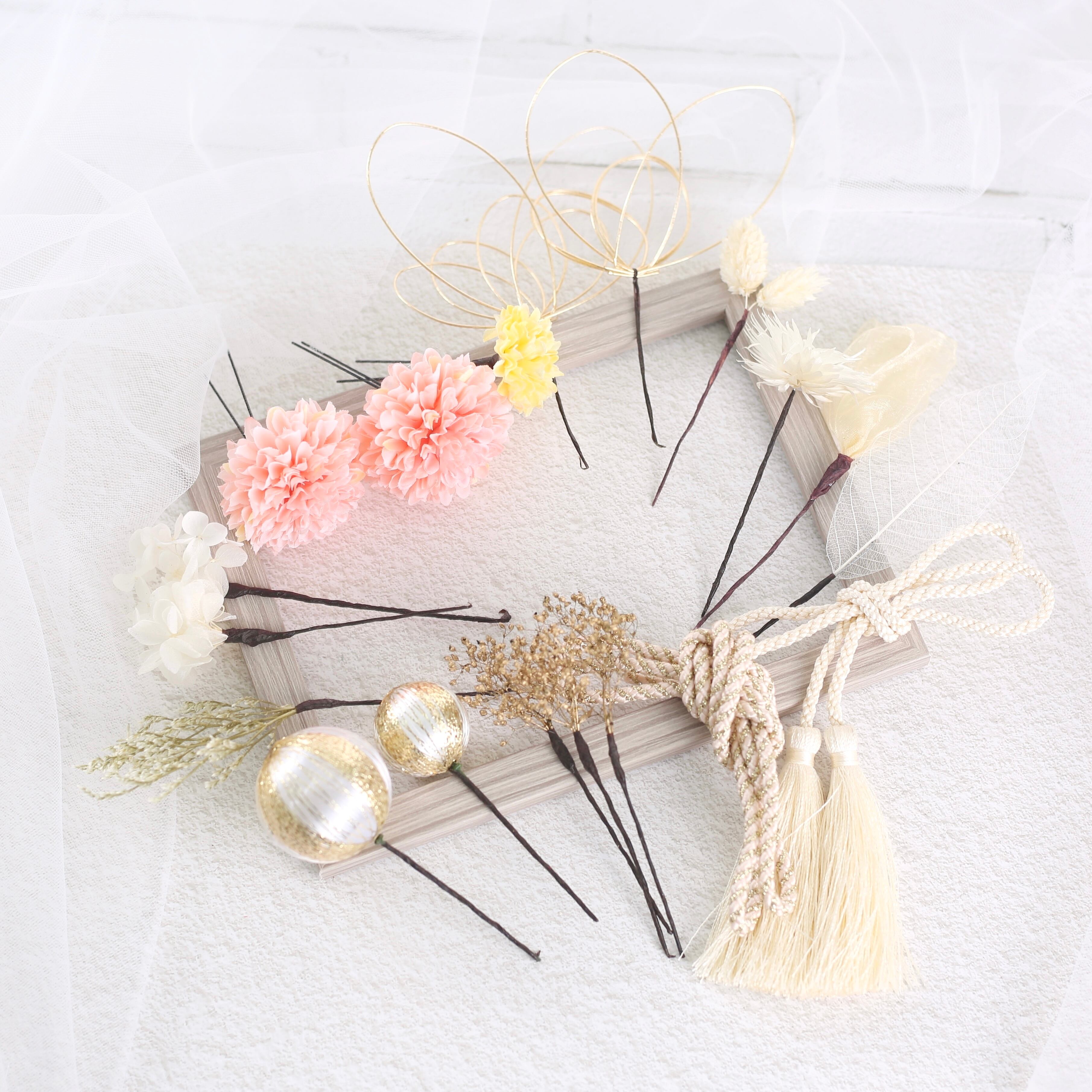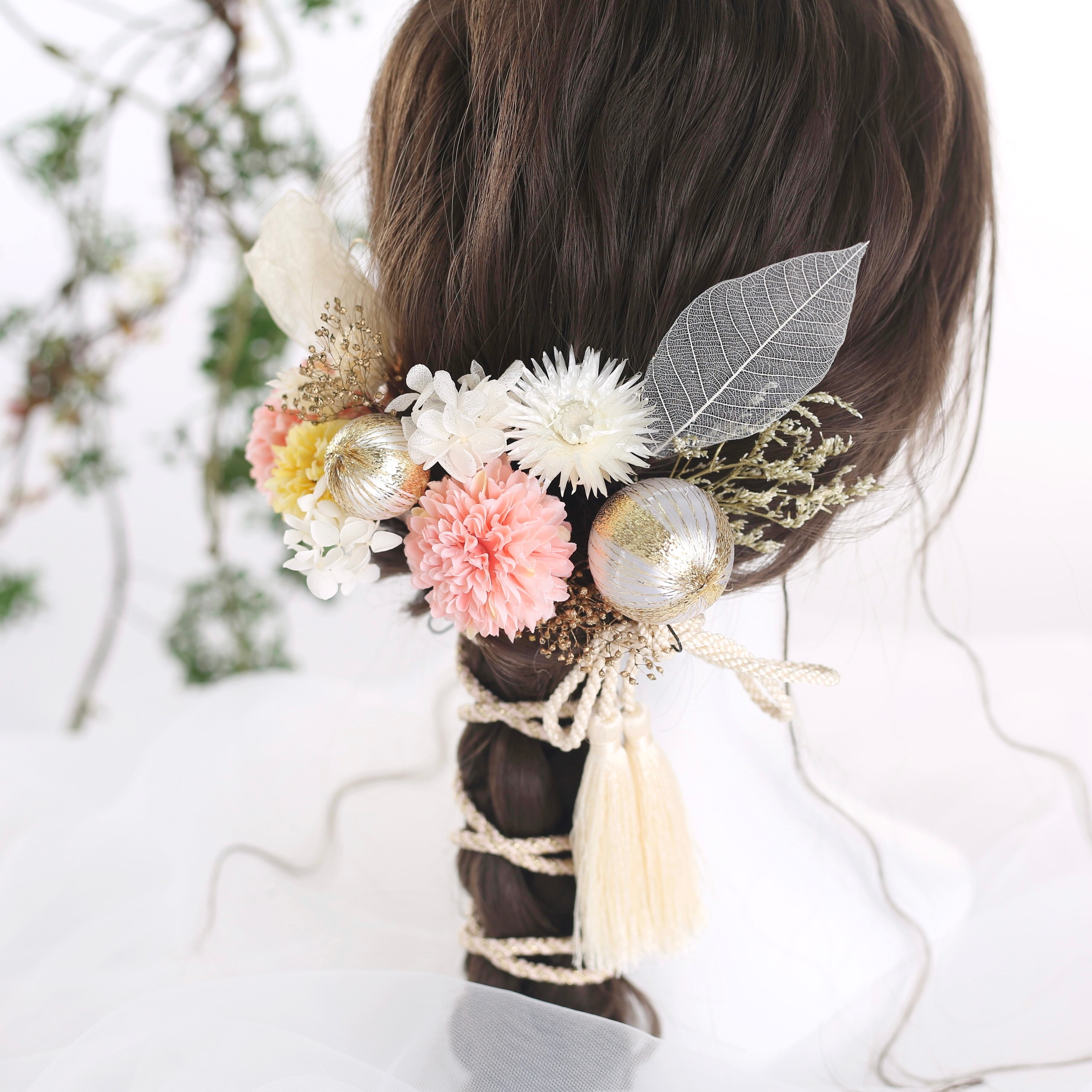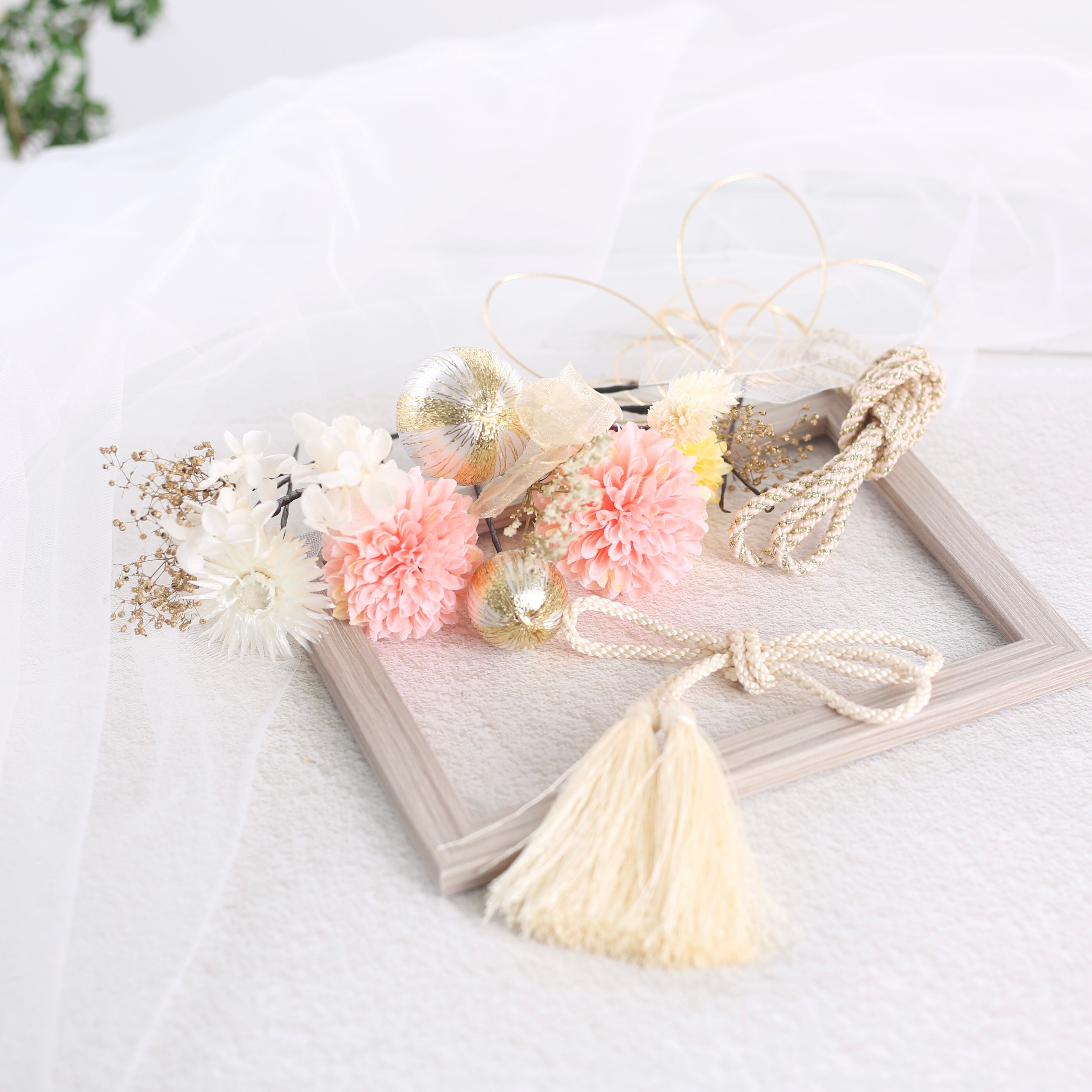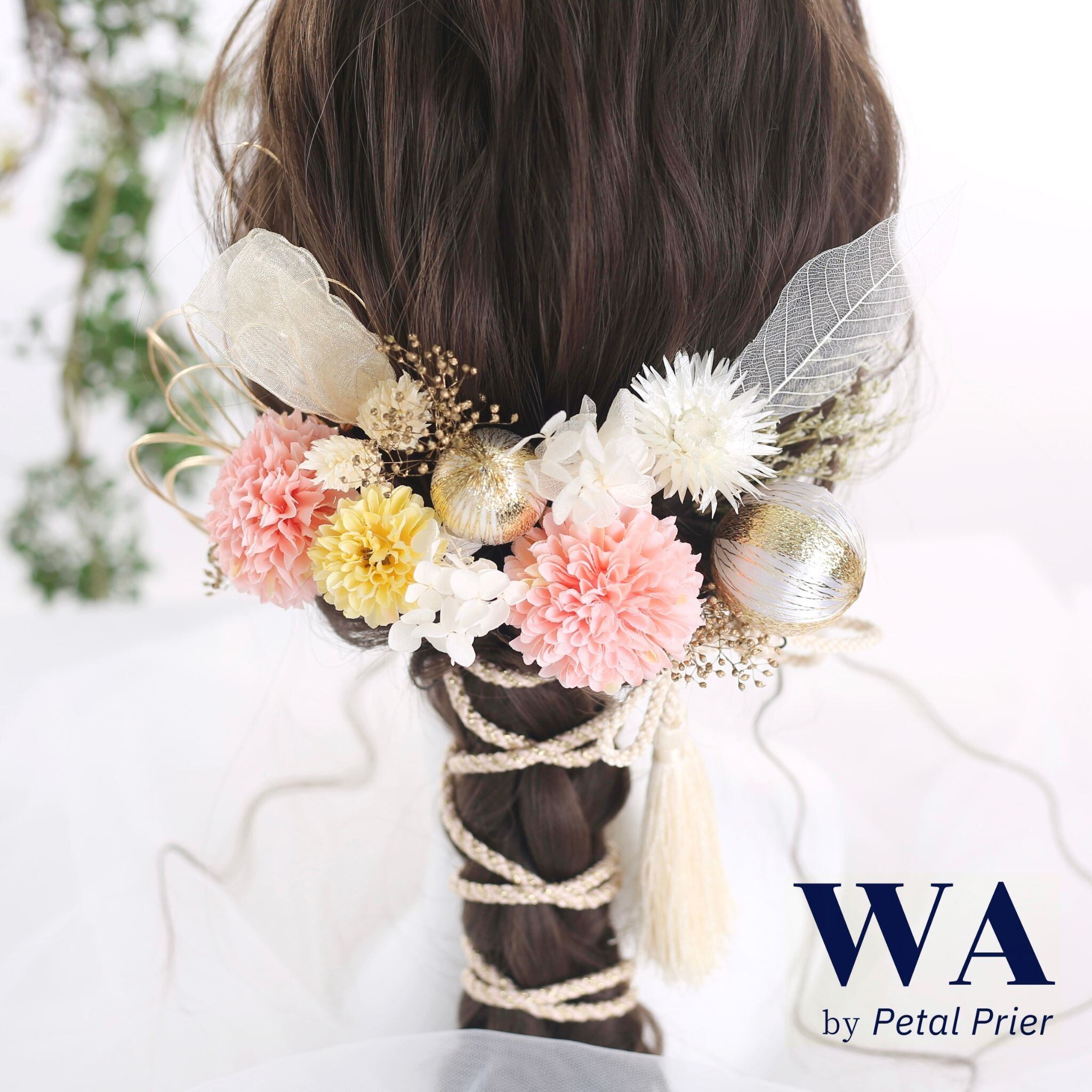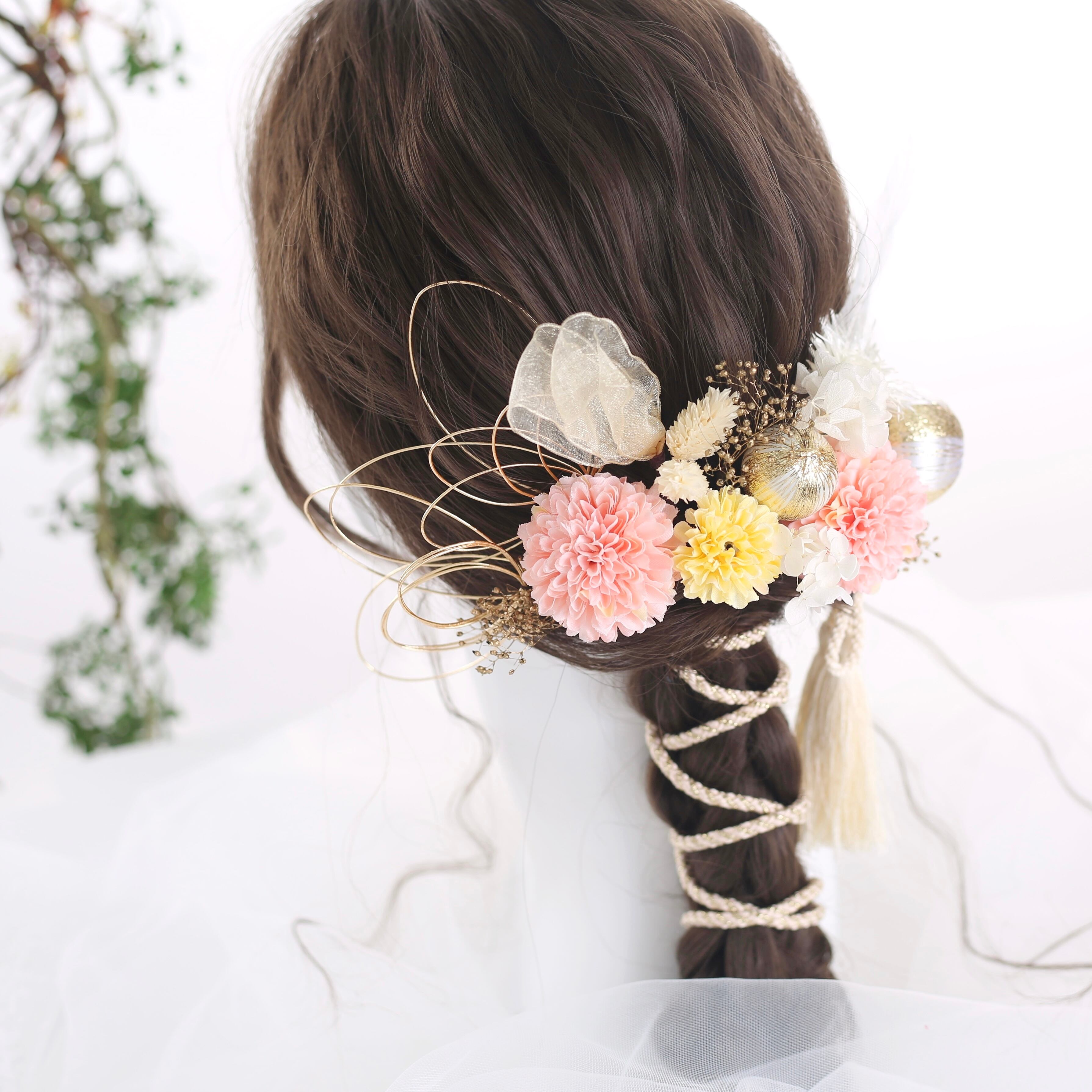 髪飾り 髪飾りセット 成人式 振袖 結婚式 ブライダル ヘッドドレス 卒業式 七五三 前撮り ピンク 白 ホワイト ダリア ドライフラワー 水引 タッセル リボン K-51 | WA by Petal Prier