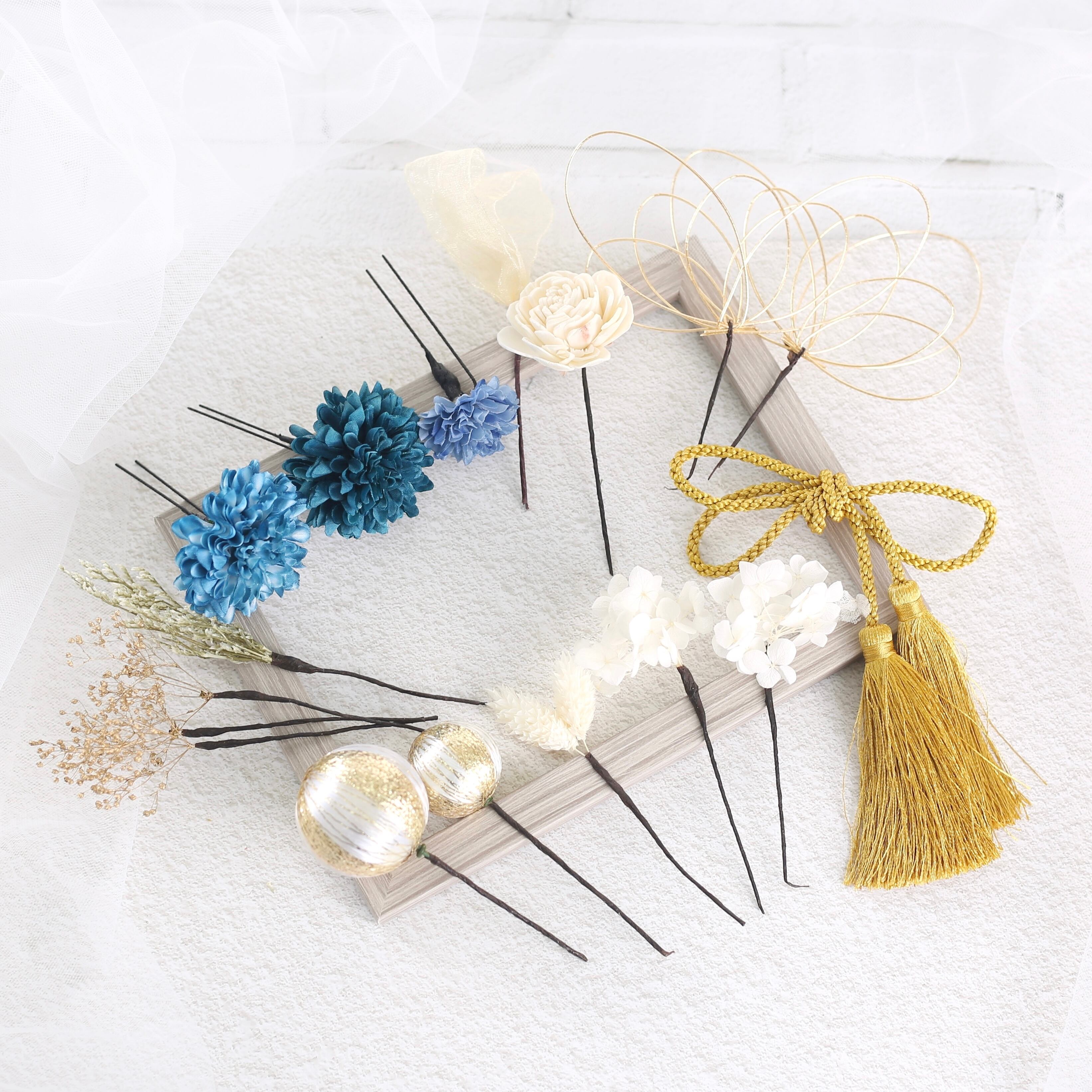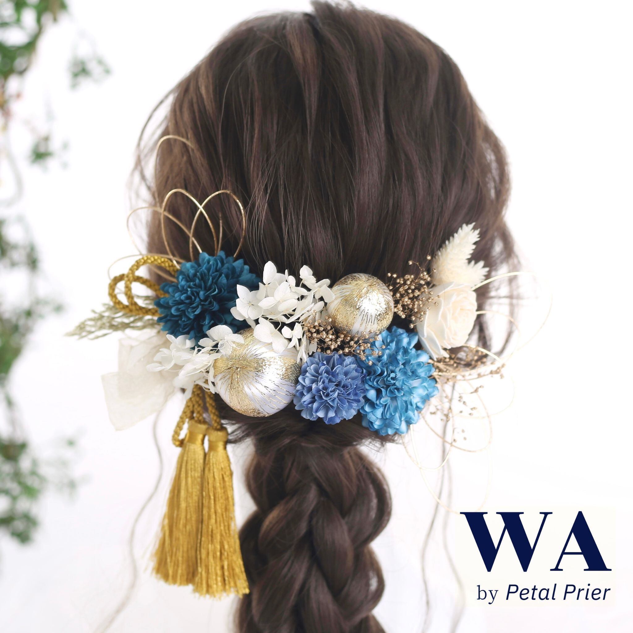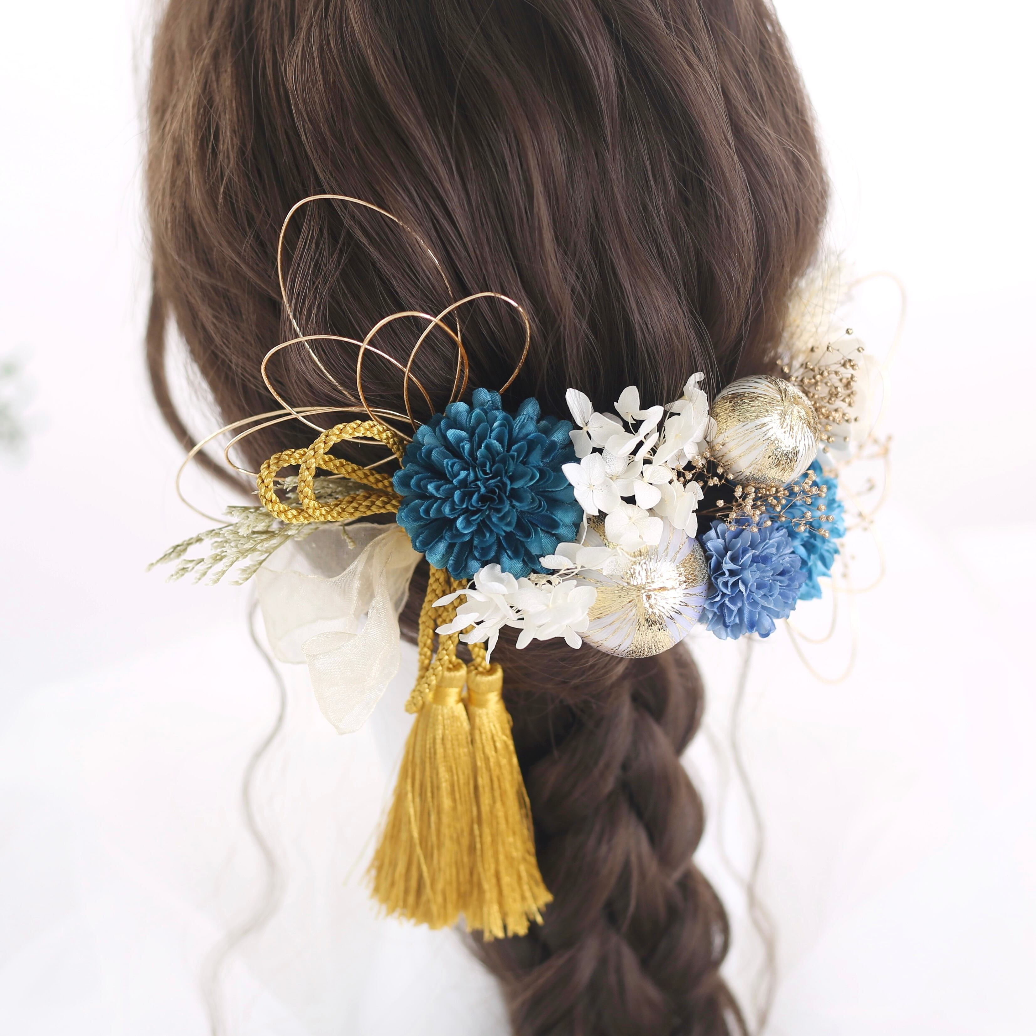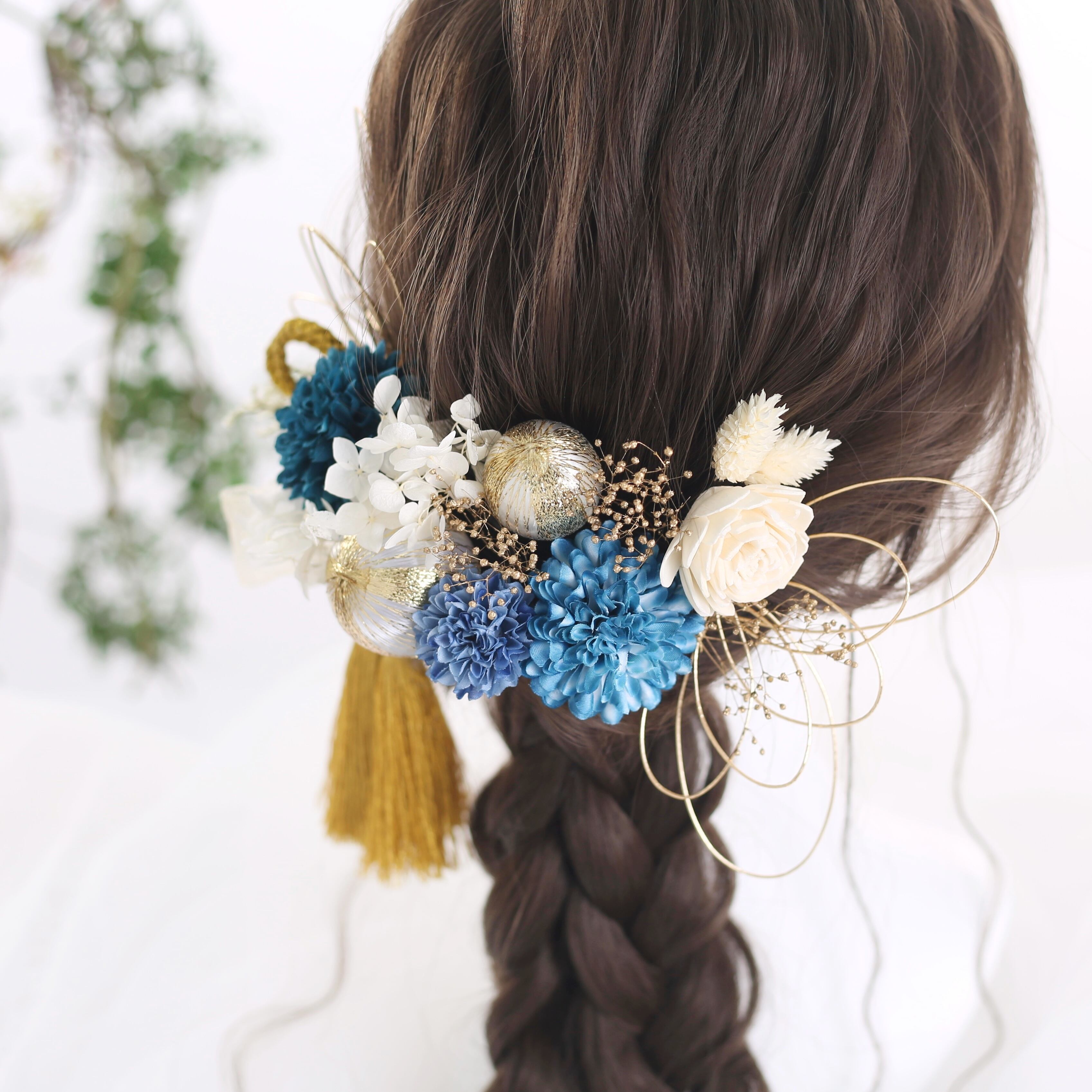 髪飾り 髪飾りセット 成人式 振袖 結婚式 ブライダル ヘッドドレス 卒業式 七五三 前撮り 青 ブルー 白 ホワイト ゴールド ダリア アジサイ カスミソウ 水引 タッセル K-52 | WA by Petal Prier