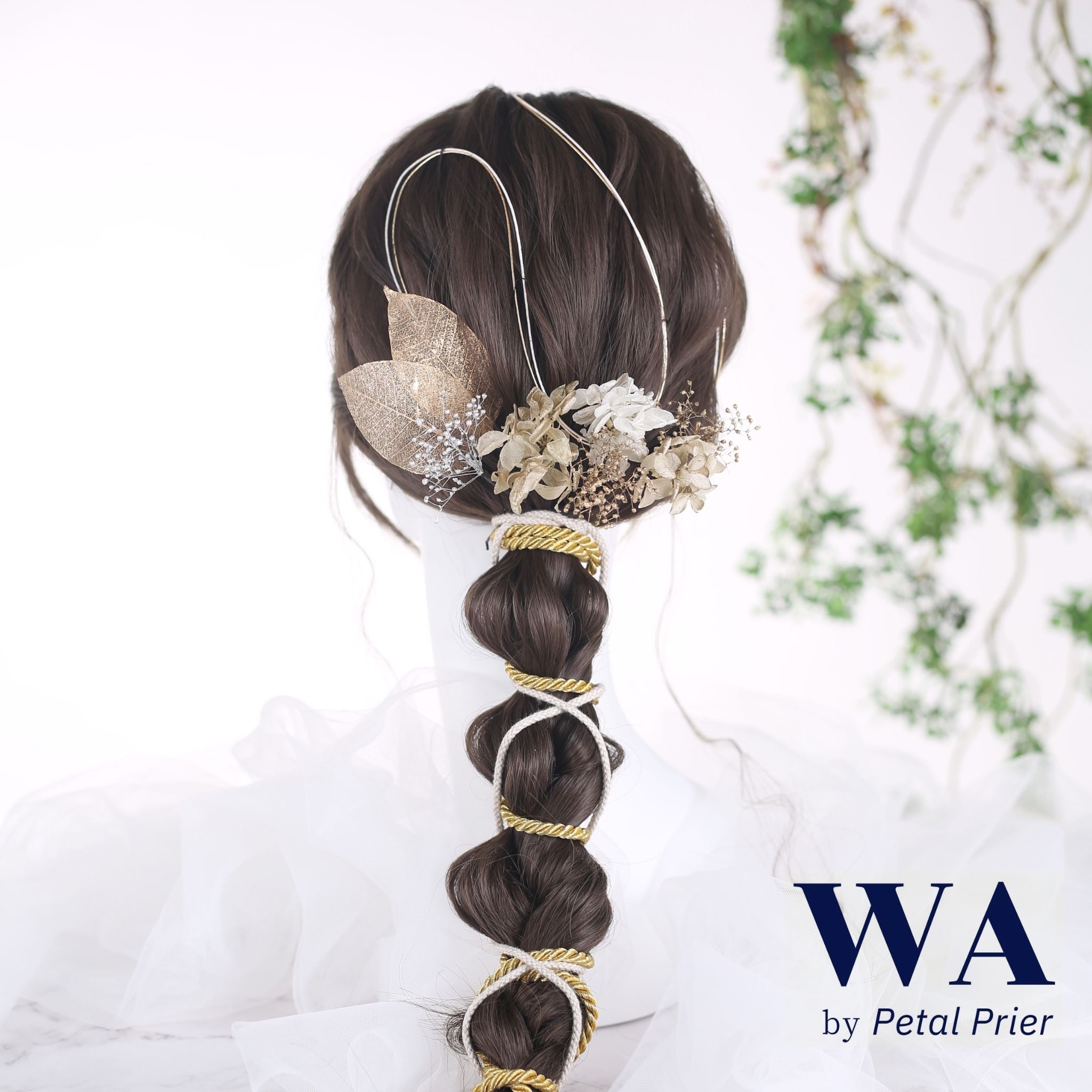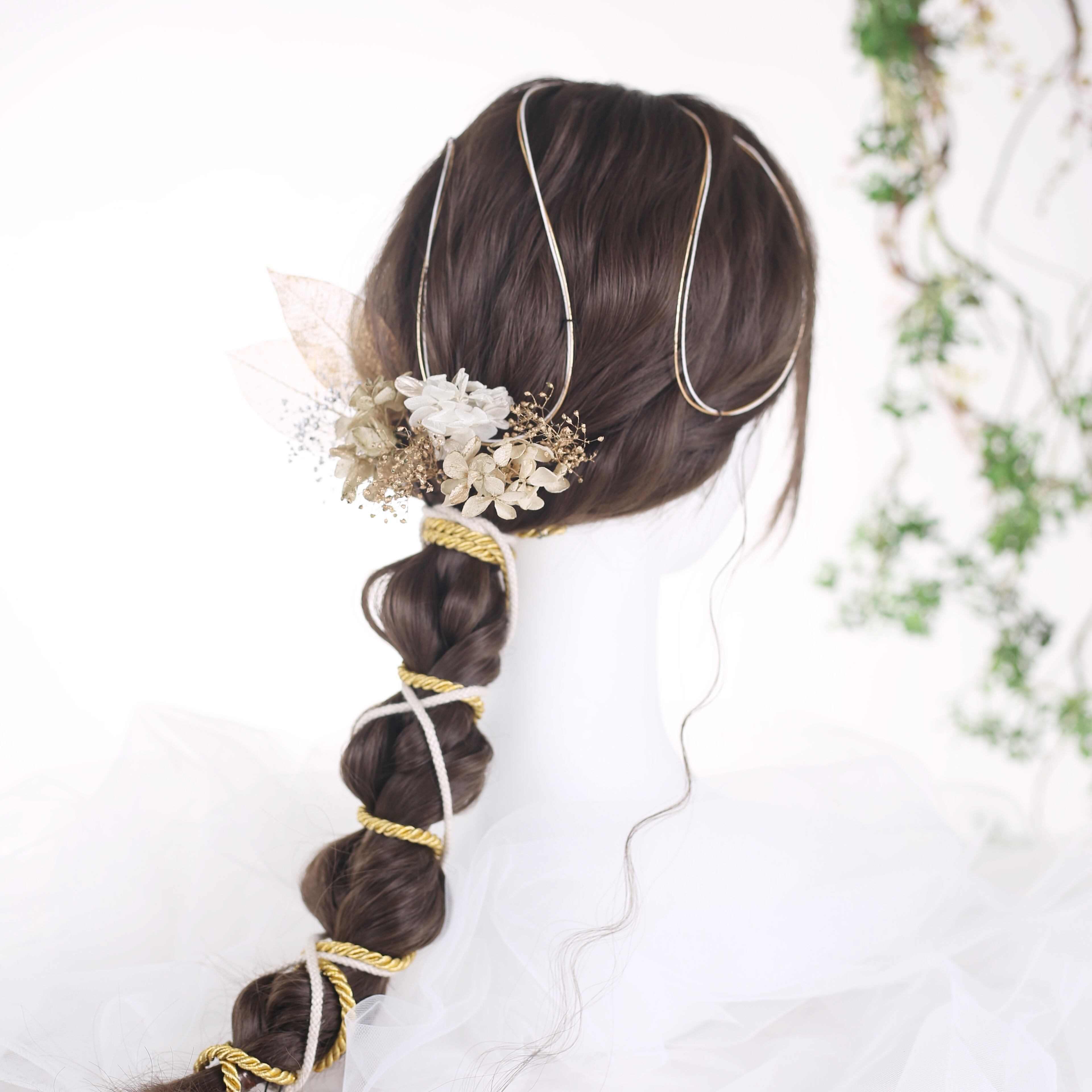 髪飾り 髪飾りセット 成人式 振袖 結婚式 ブライダル ヘッドドレス 卒業式 七五三 前撮り ベージュ ブラウン ゴールド あじさい リーフ カスミソウ 水引 組紐 K-54 | WA by Petal Prier