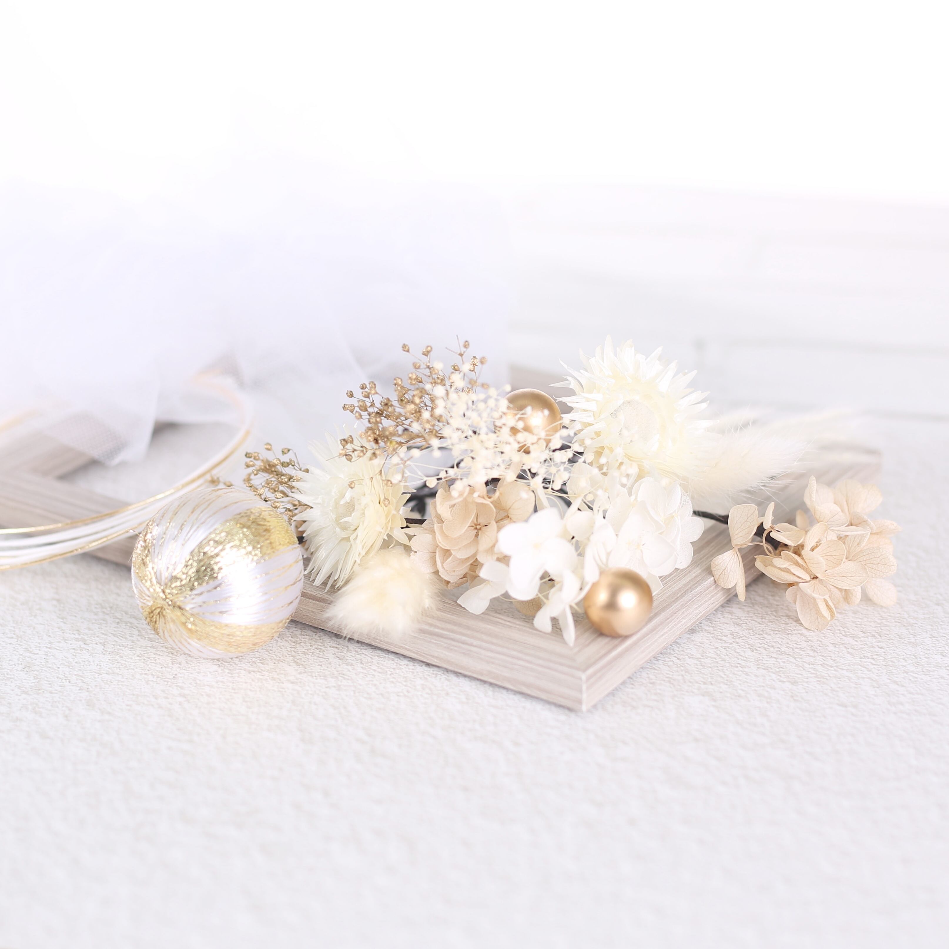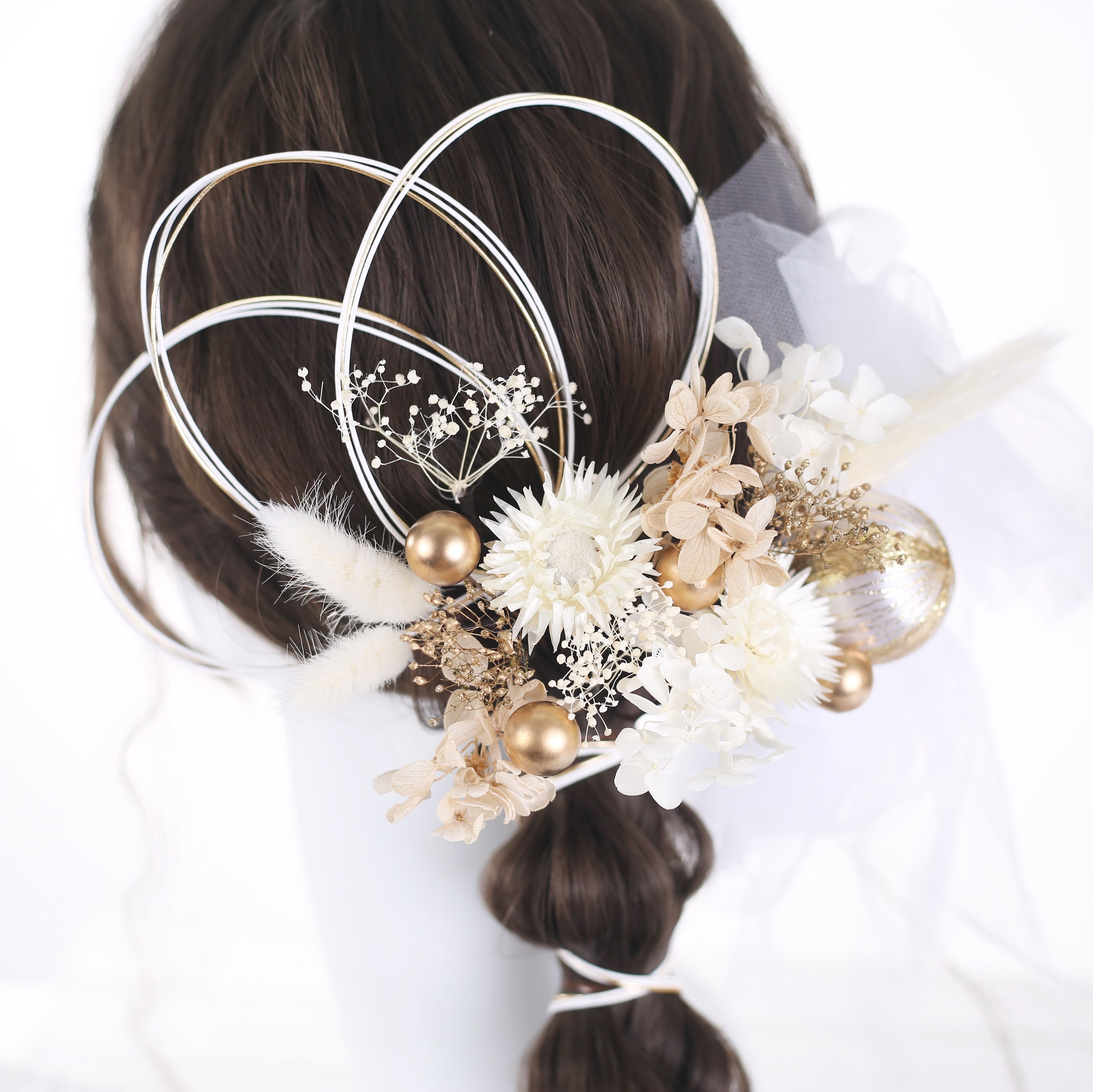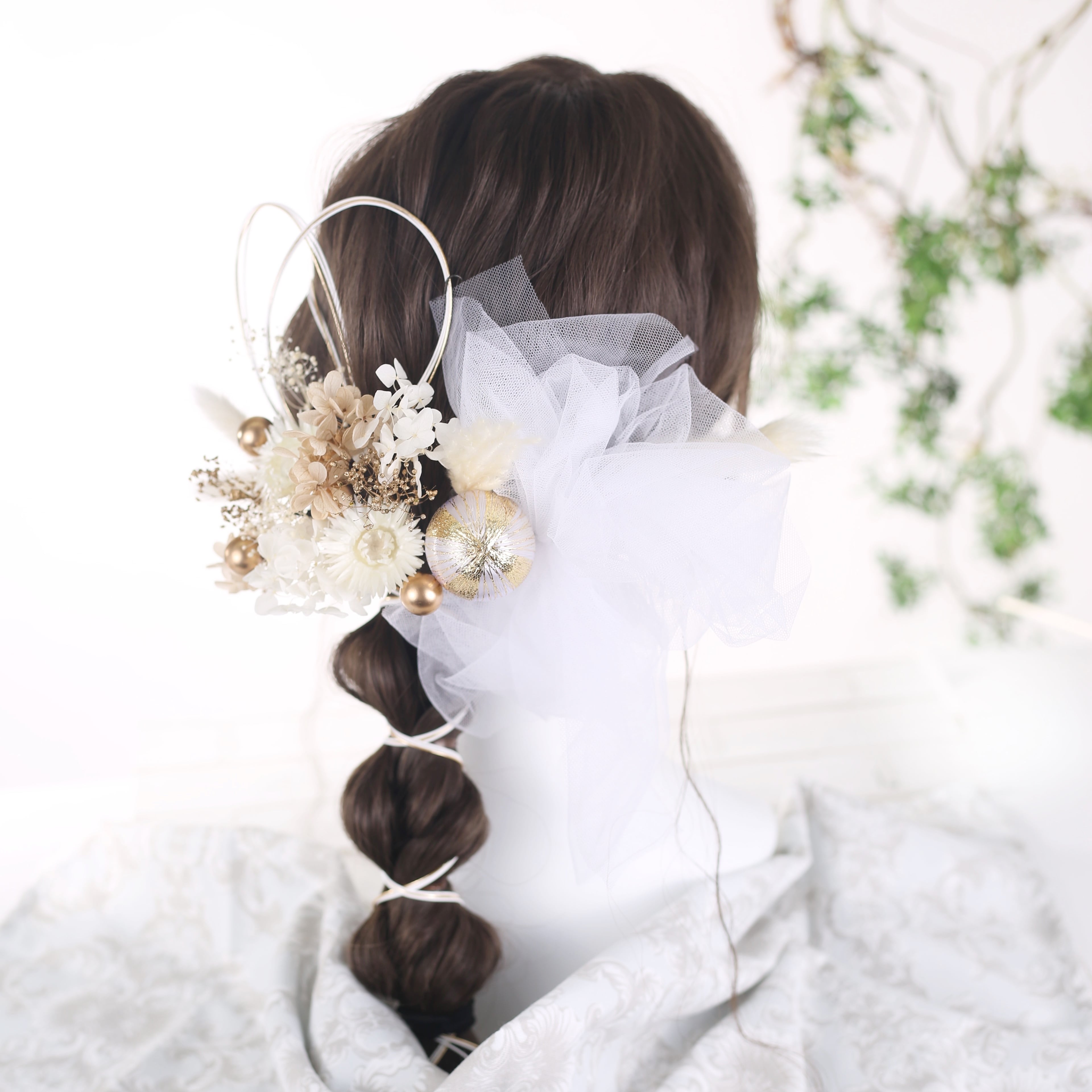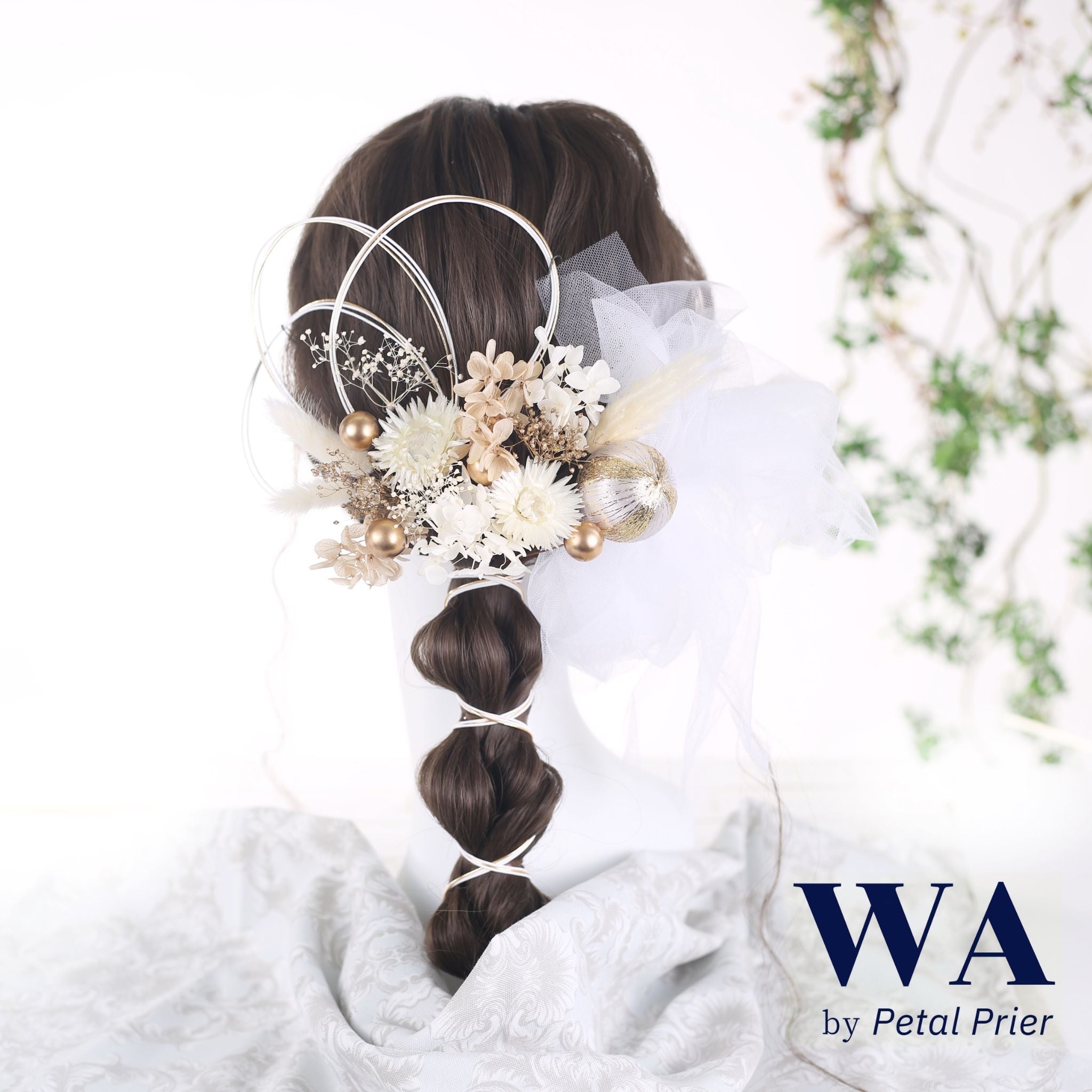 .・*・再入荷・*・. 髪飾り 髪飾りセット 成人式 振袖 結婚式 ブライダル ヘッドドレス 卒業式 七五三 前撮り 白 ホワイト ゴールド あじさい 水引 パール チュール レース ドライフラワー K-56 | WA by Petal Prier