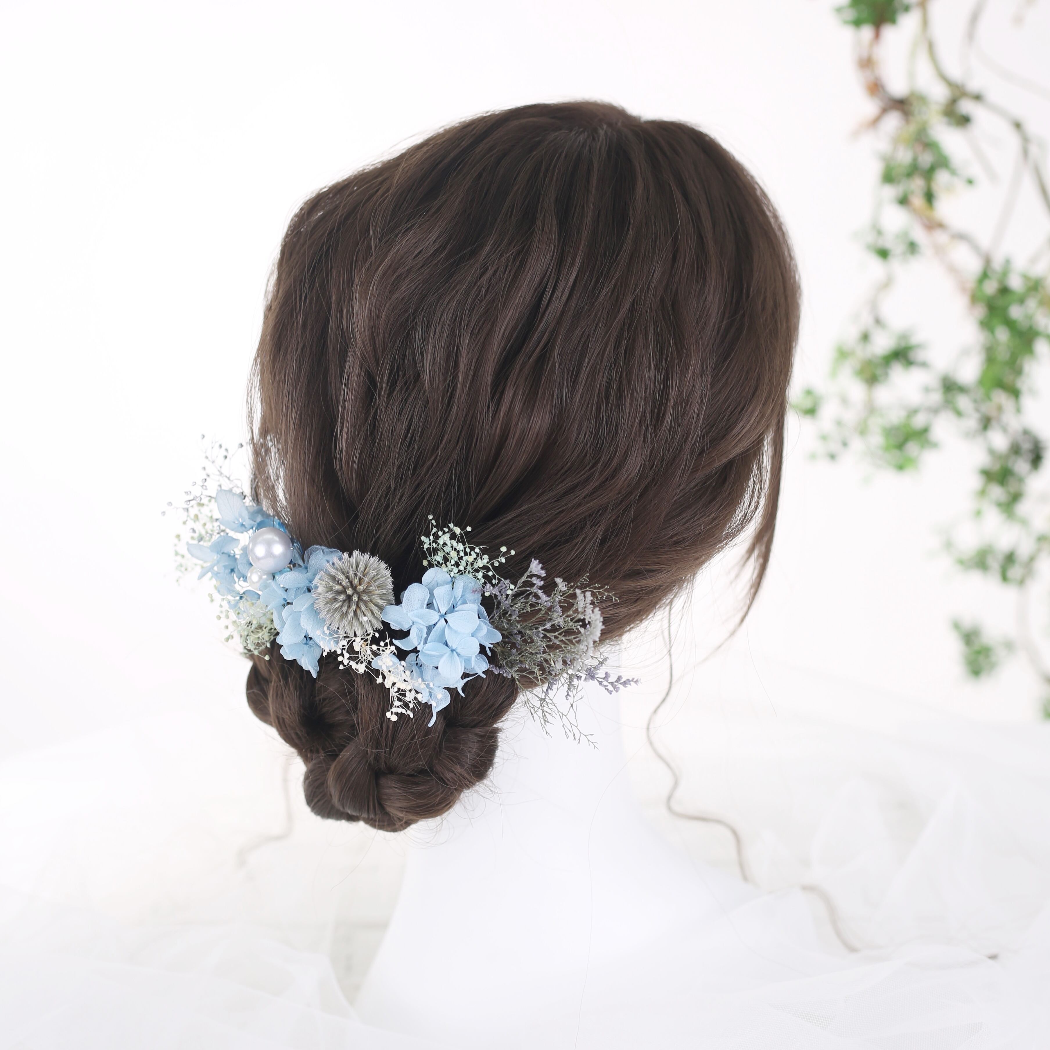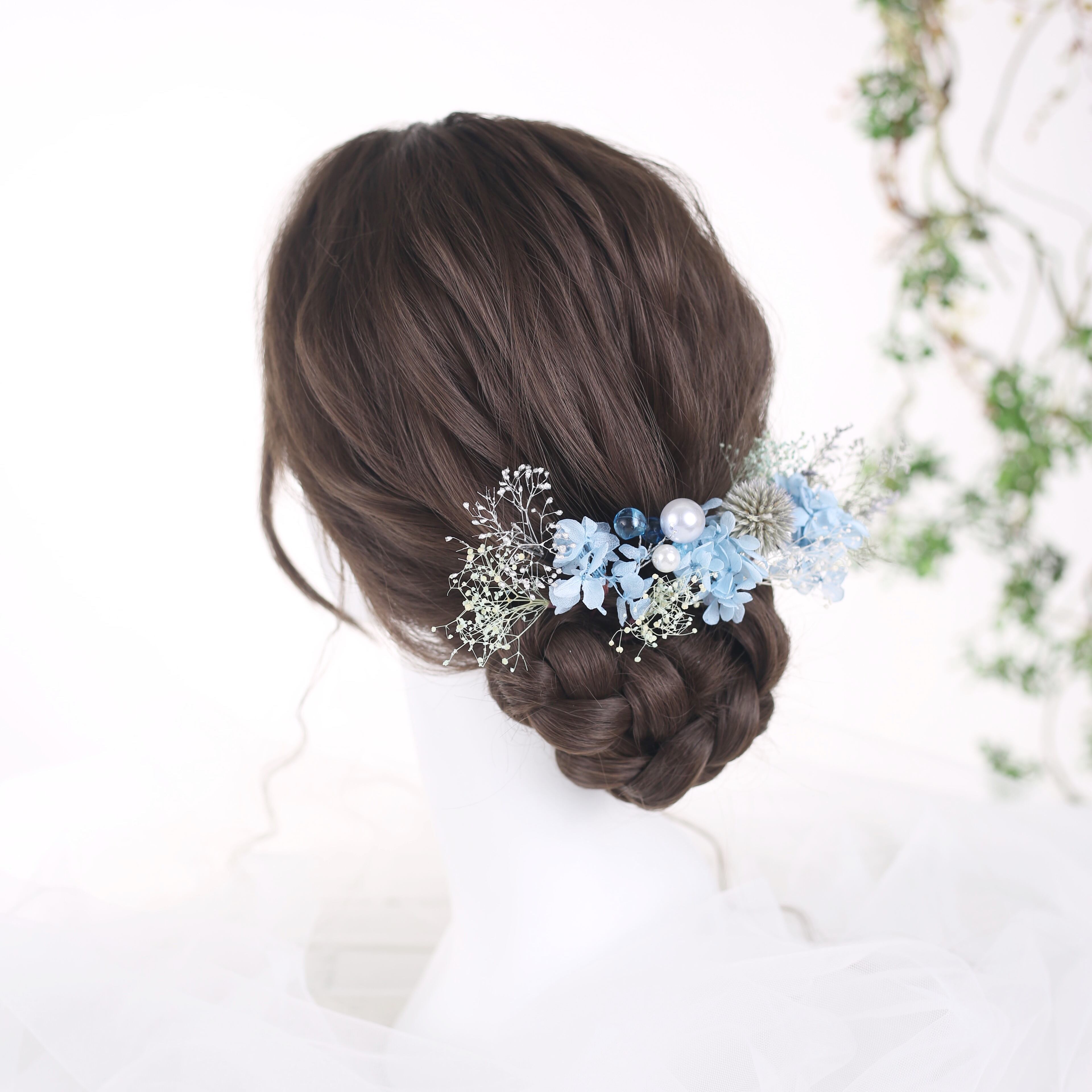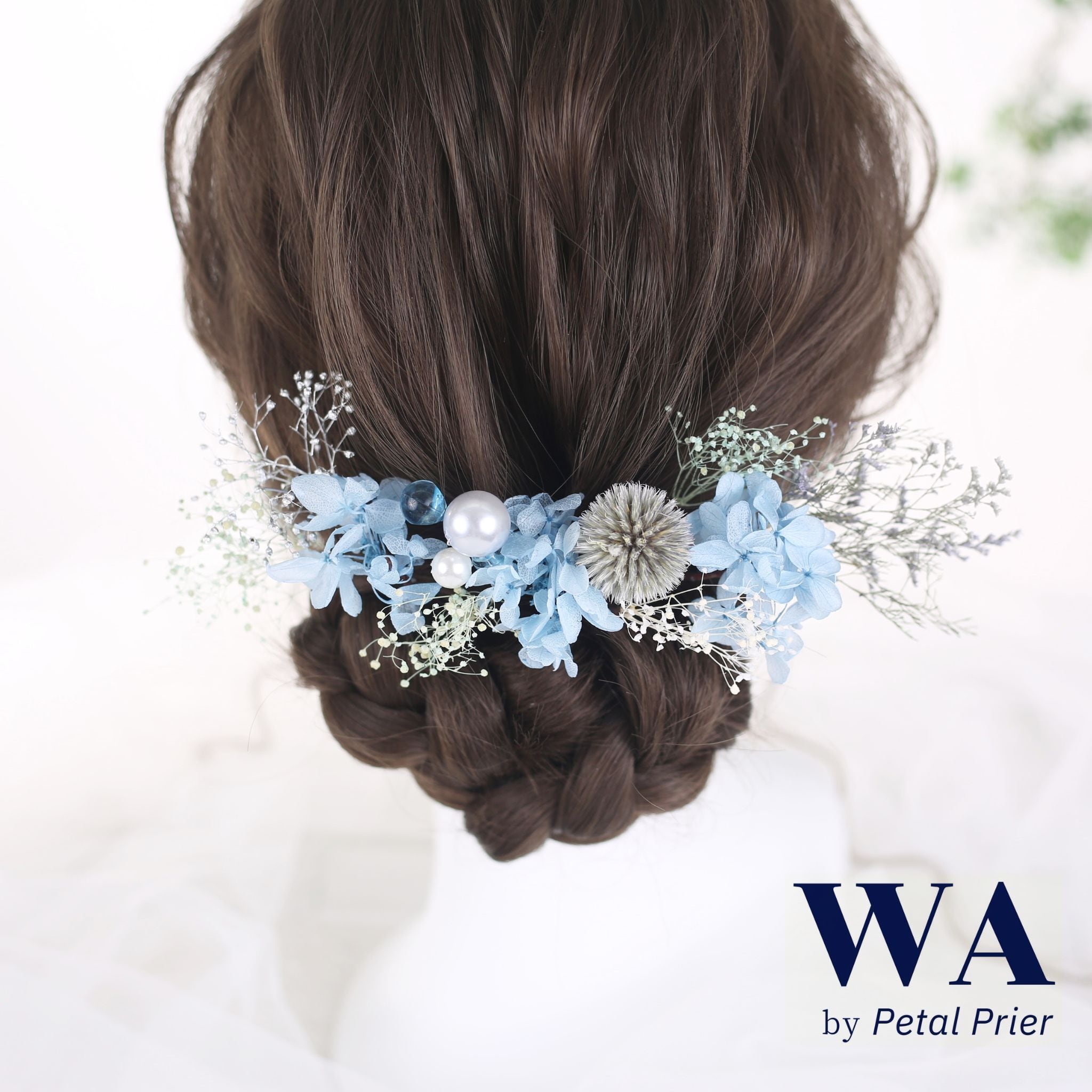 髪飾り 髪飾りセット 成人式 振袖 結婚式 ブライダル ヘッドドレス 卒業式 七五三 前撮り 水色 ブルー あじさい カスミソウ ビジュー パール ドライフラワー K-57 | WA by Petal Prier