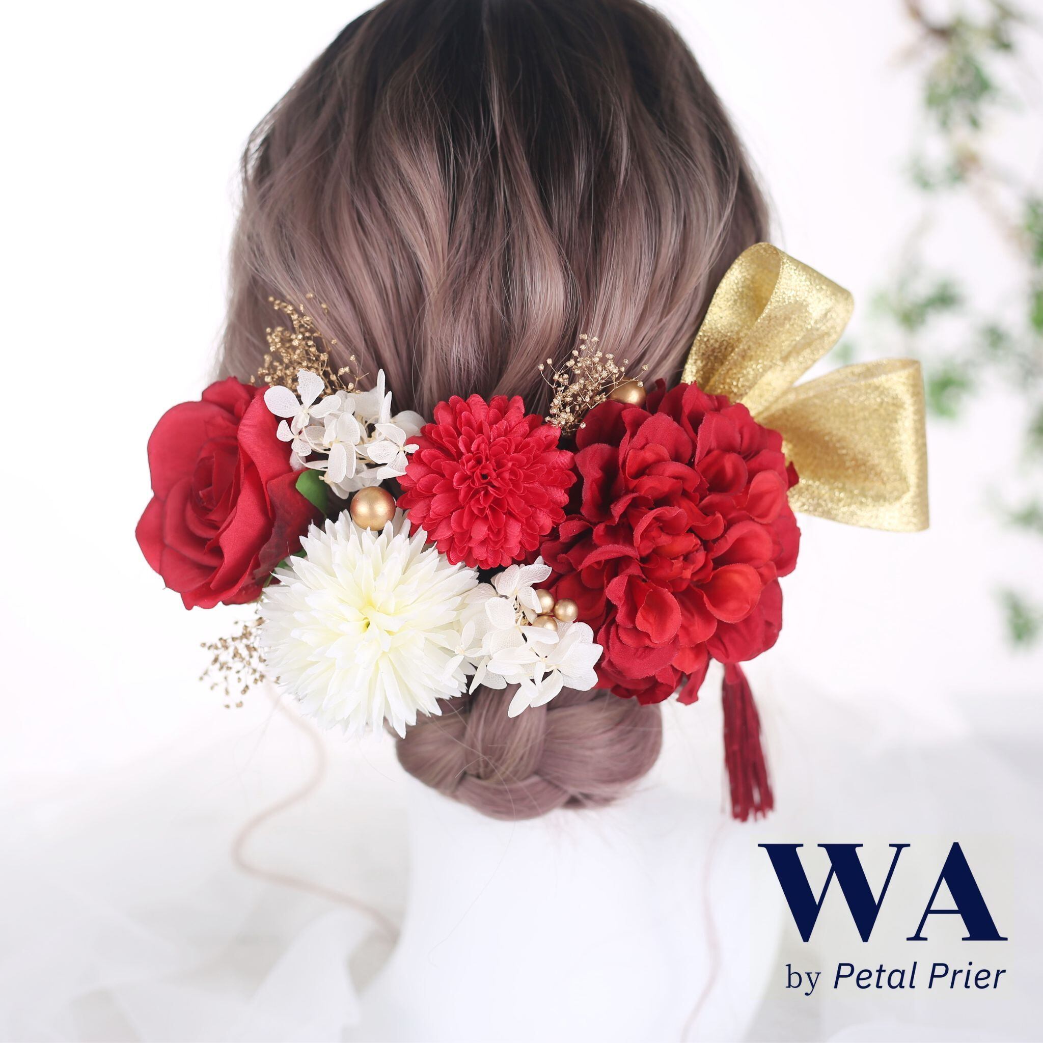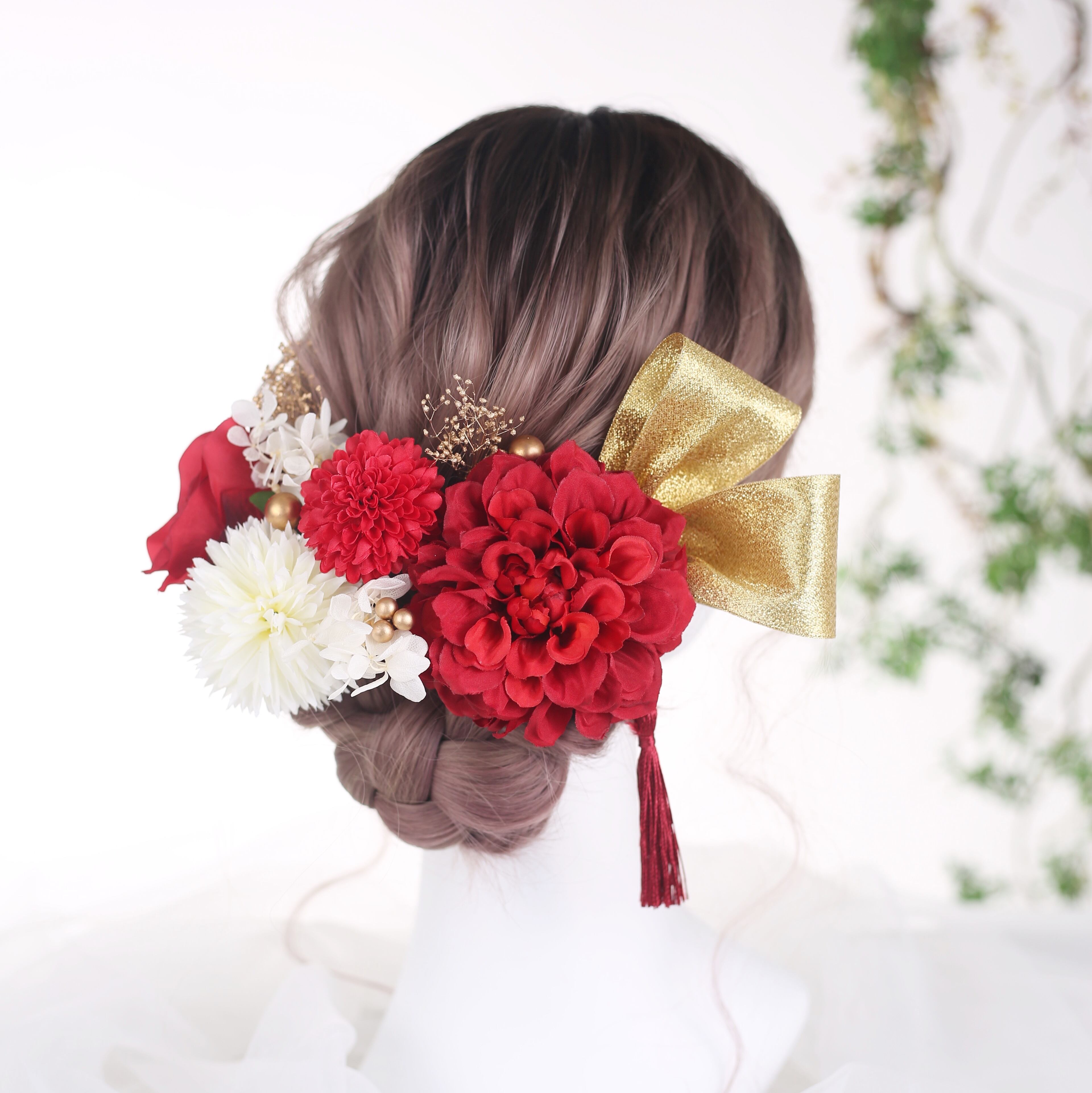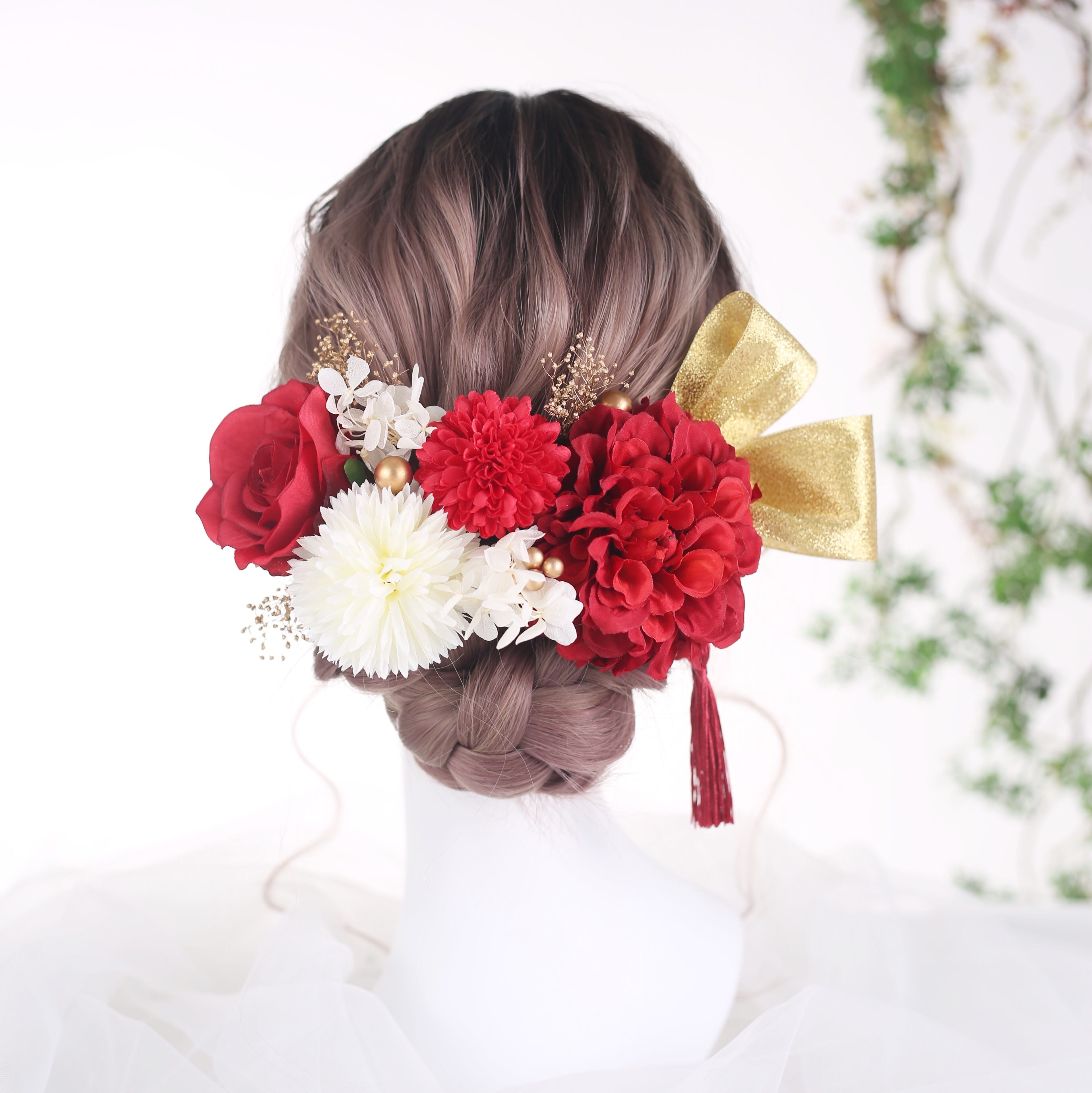 髪飾り 髪飾りセット 成人式 振袖 結婚式 ブライダル ヘッドドレス 卒業式 七五三 前撮り 赤 レッド 白 ホワイト ゴールド バラ ダリア あじさい リボン タッセル パール K-62 | WA by Petal Prier