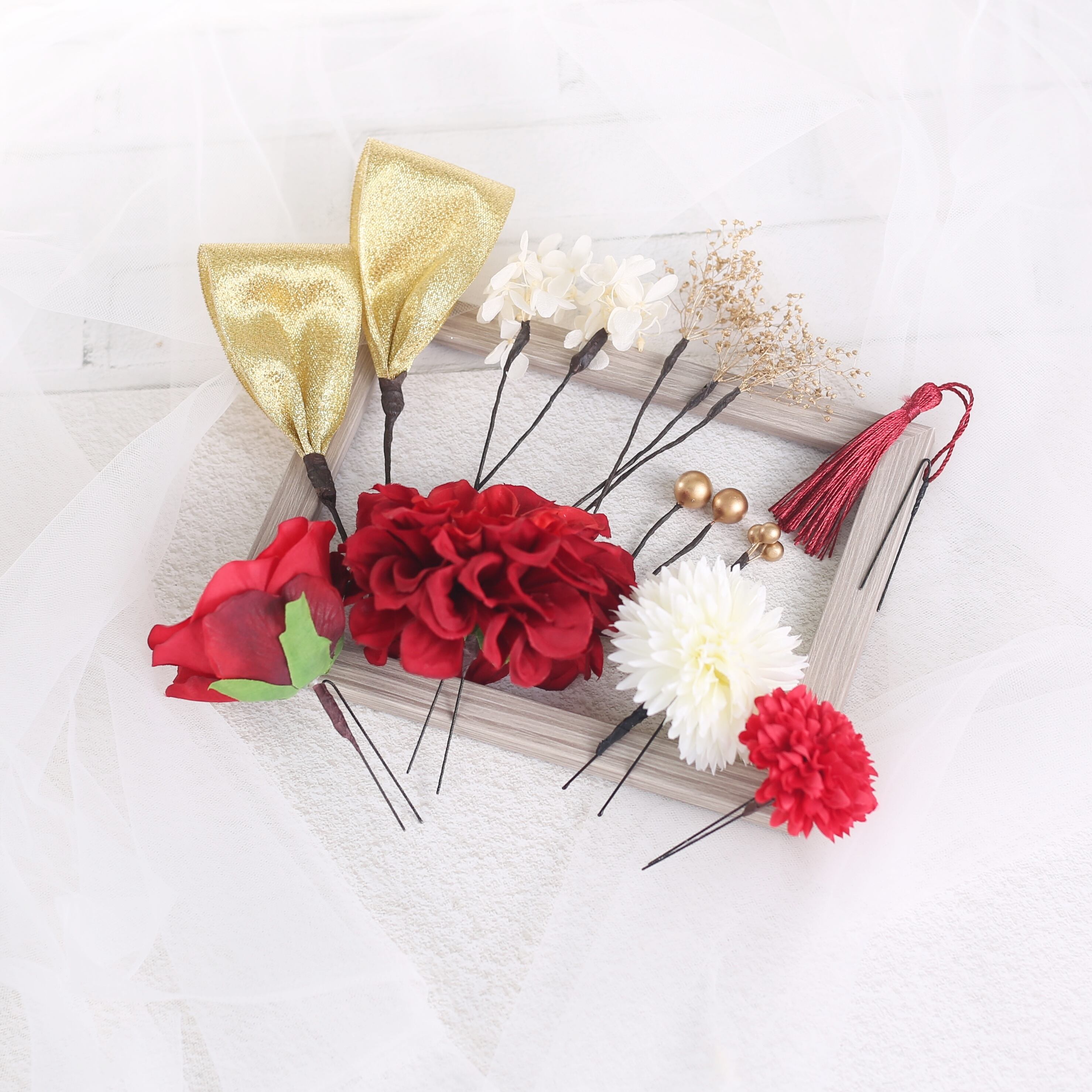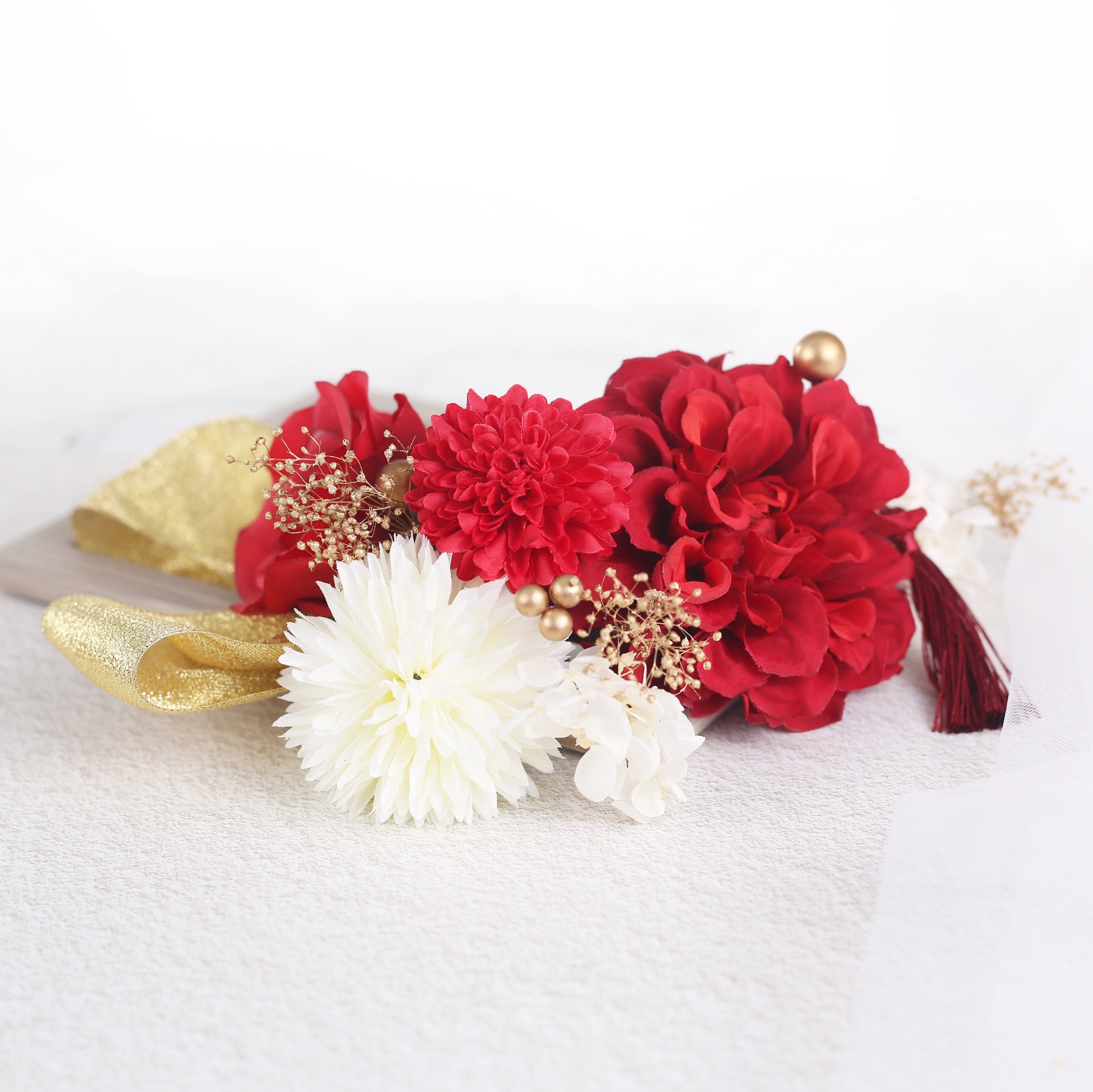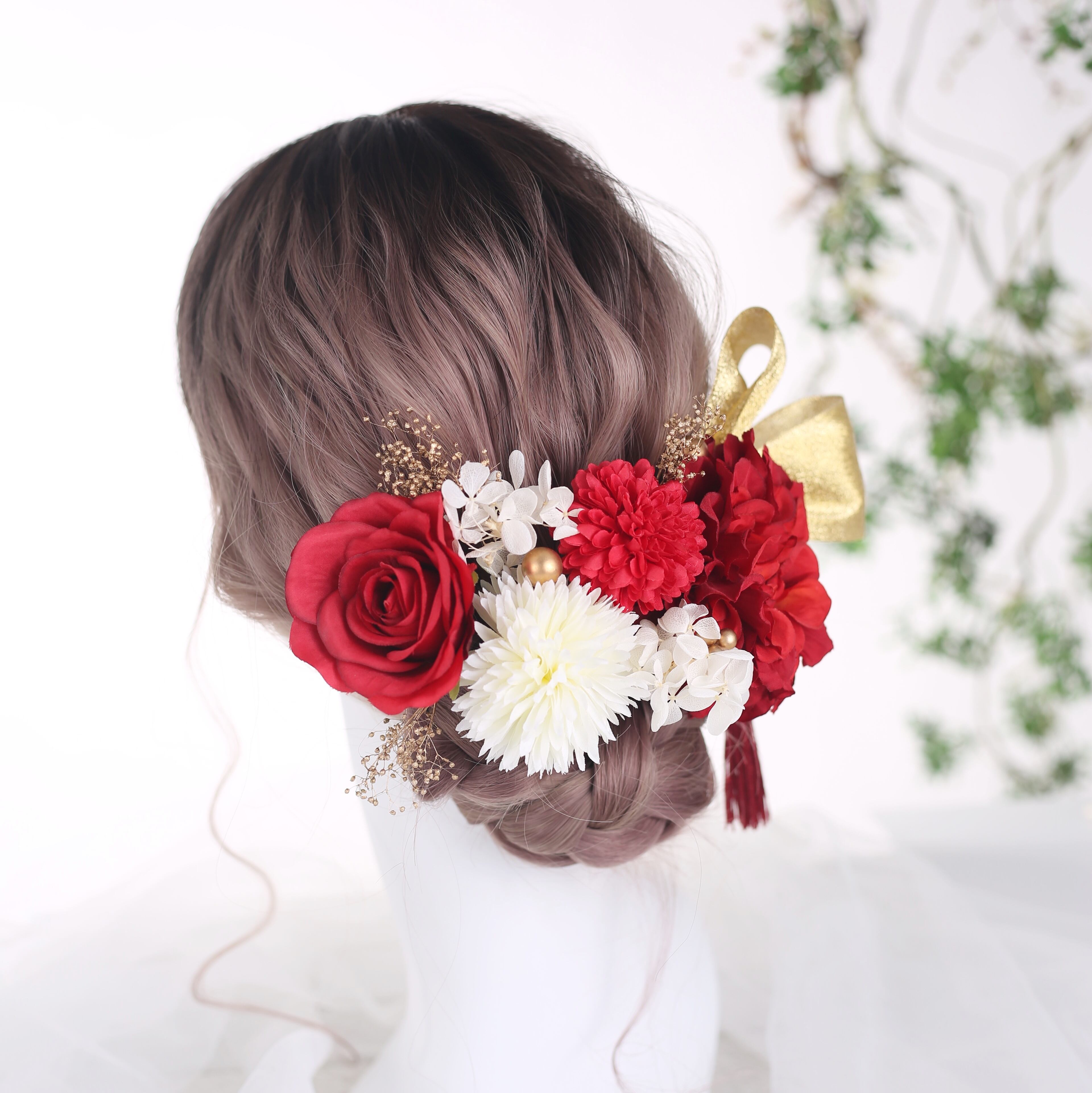 髪飾り 髪飾りセット 成人式 振袖 結婚式 ブライダル ヘッドドレス 卒業式 七五三 前撮り 赤 レッド 白 ホワイト ゴールド バラ ダリア あじさい リボン タッセル パール K-62 | WA by Petal Prier