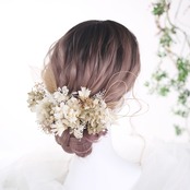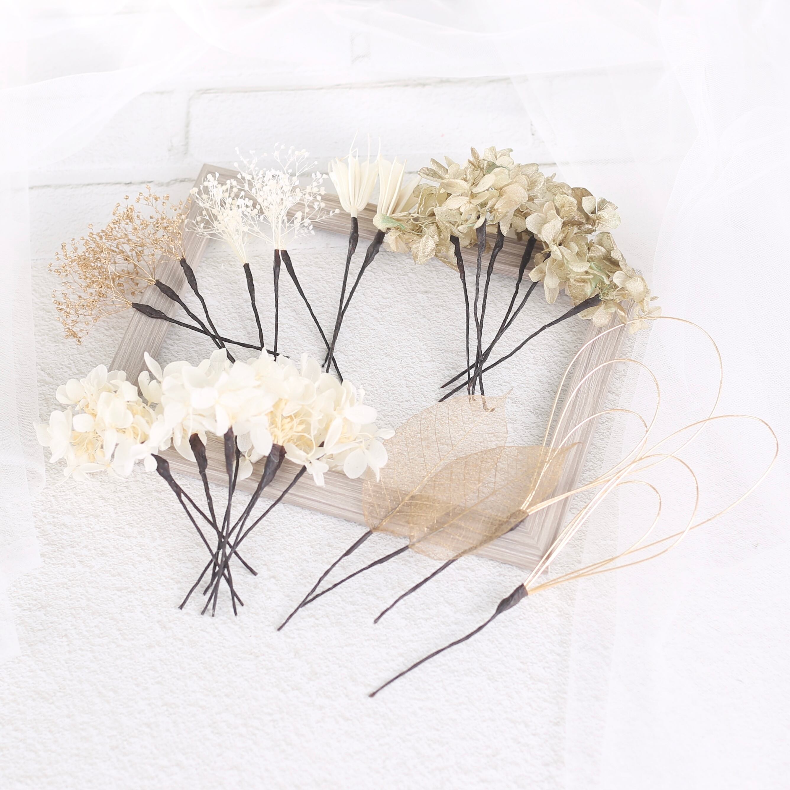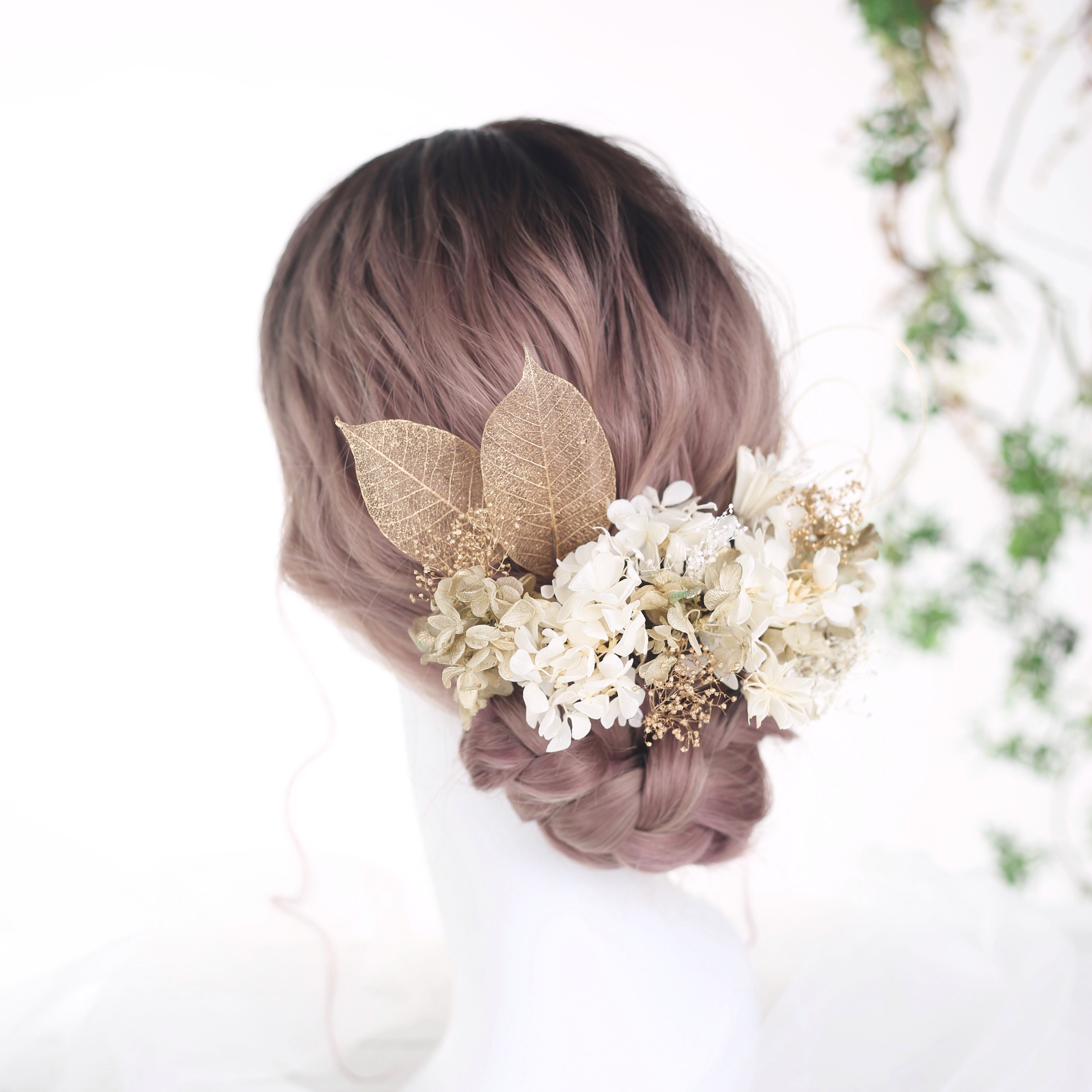 髪飾り 髪飾りセット 成人式 振袖 結婚式 ブライダル ヘッドドレス 卒業式 七五三 前撮り 白 ホワイト ゴールド あじさい 水引 リーフ ドライフラワー K-65 | WA by Petal Prier