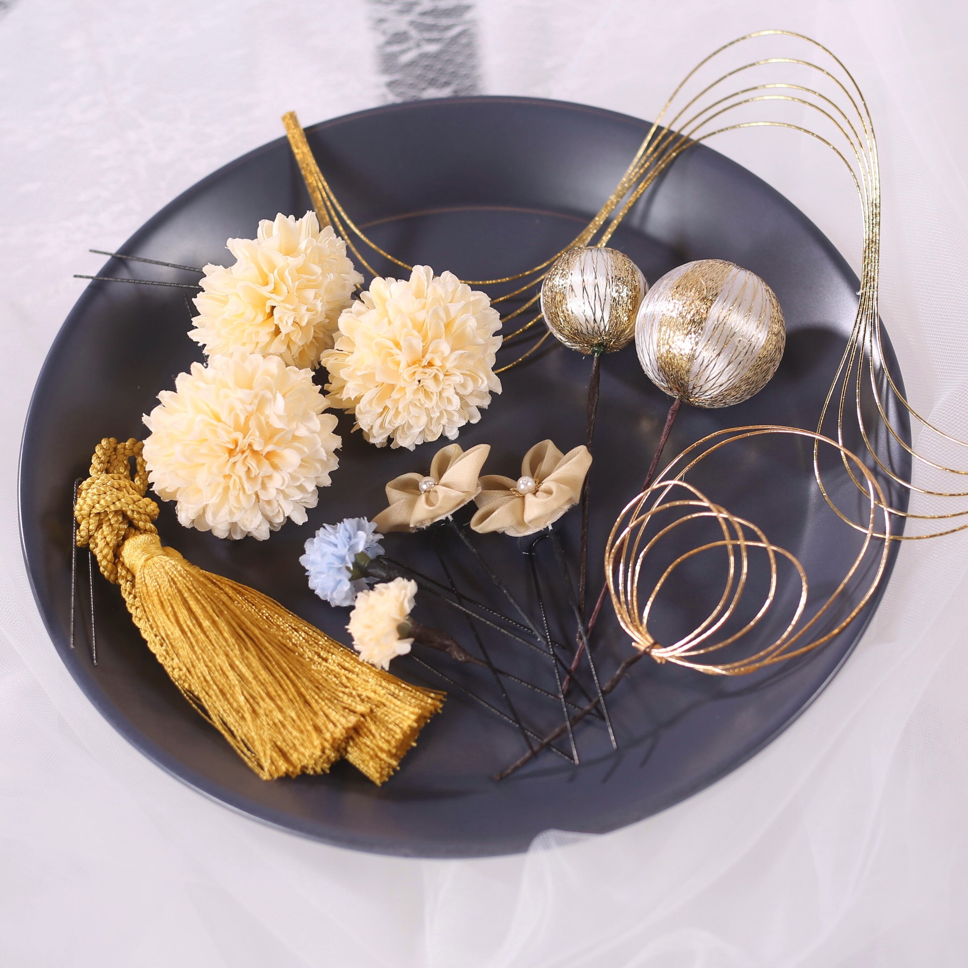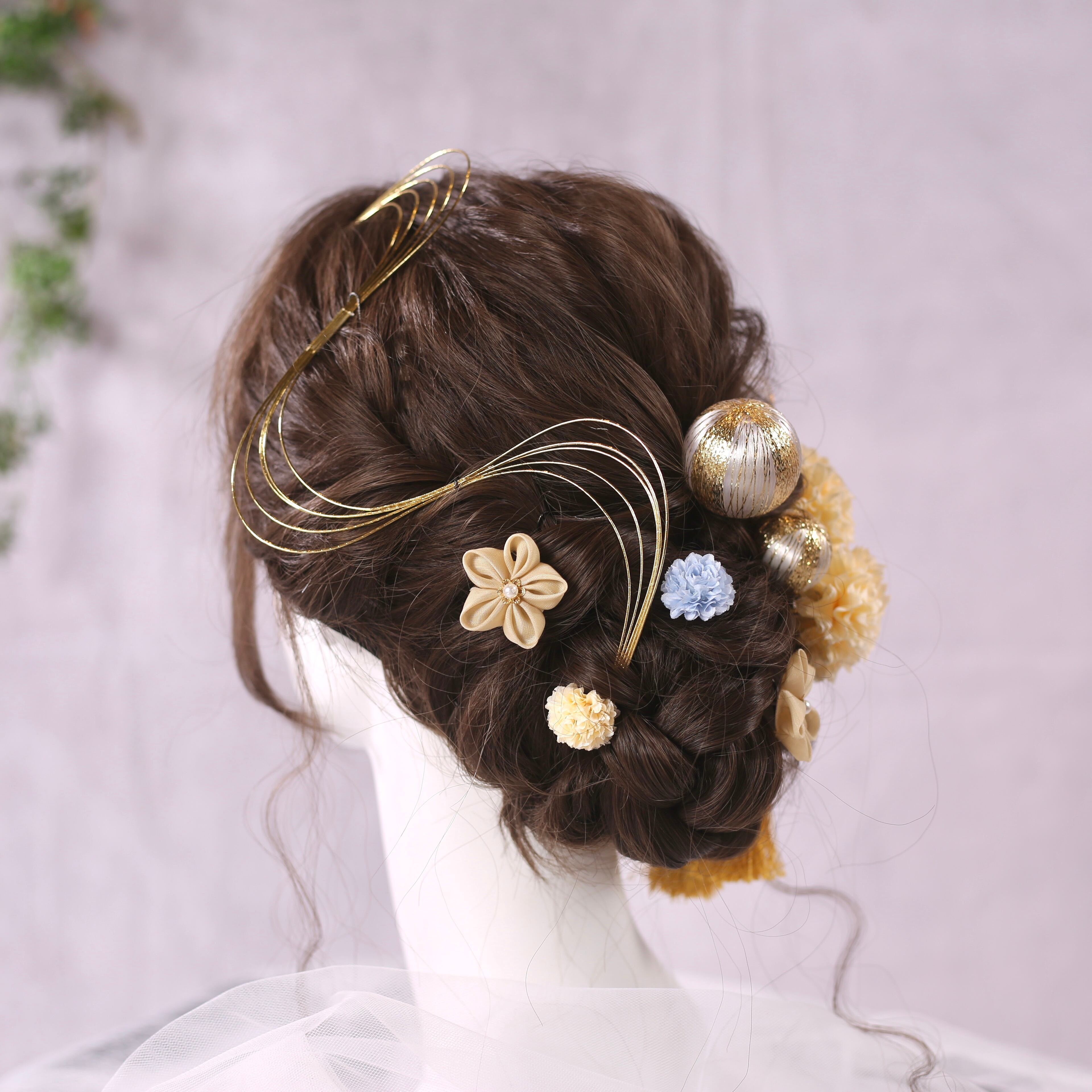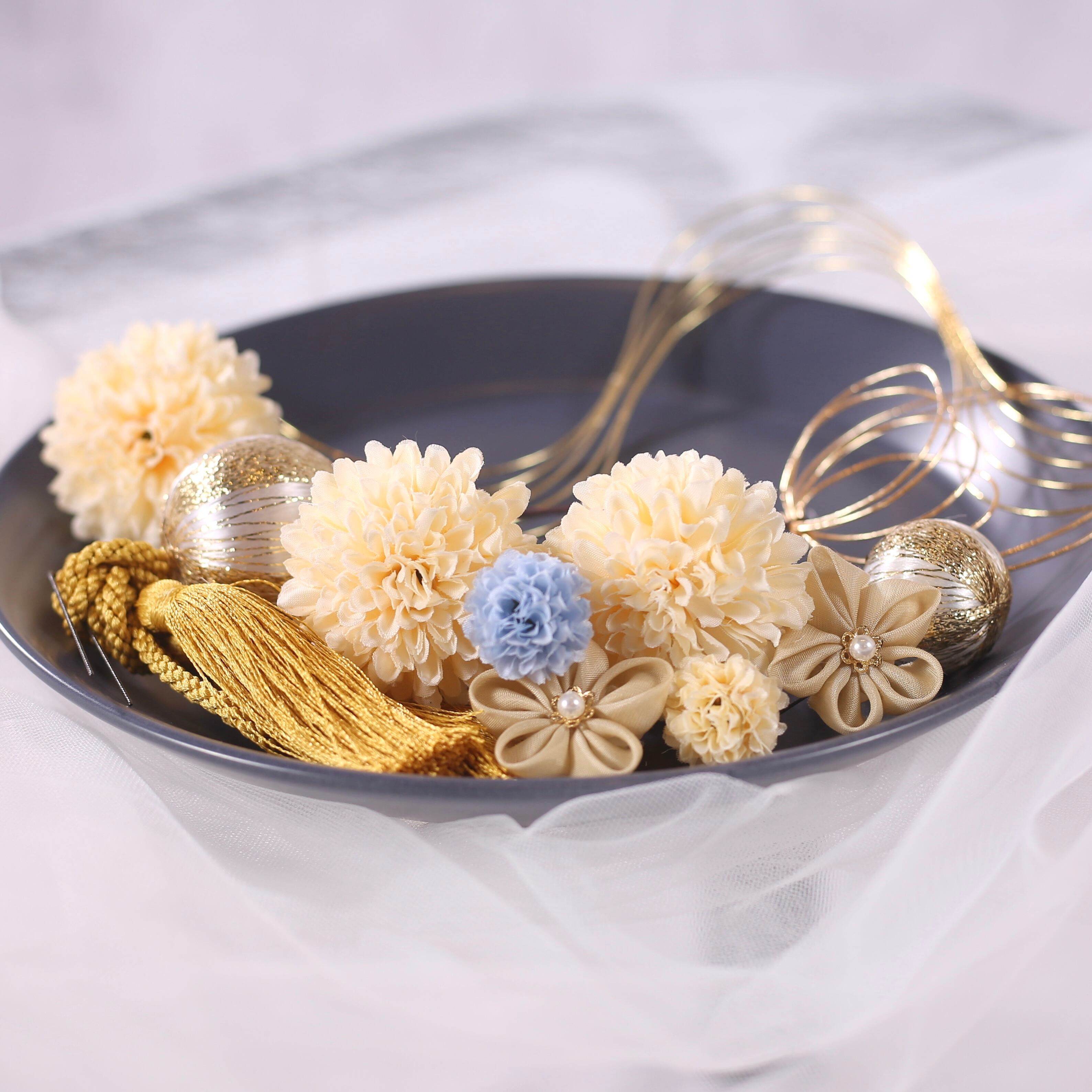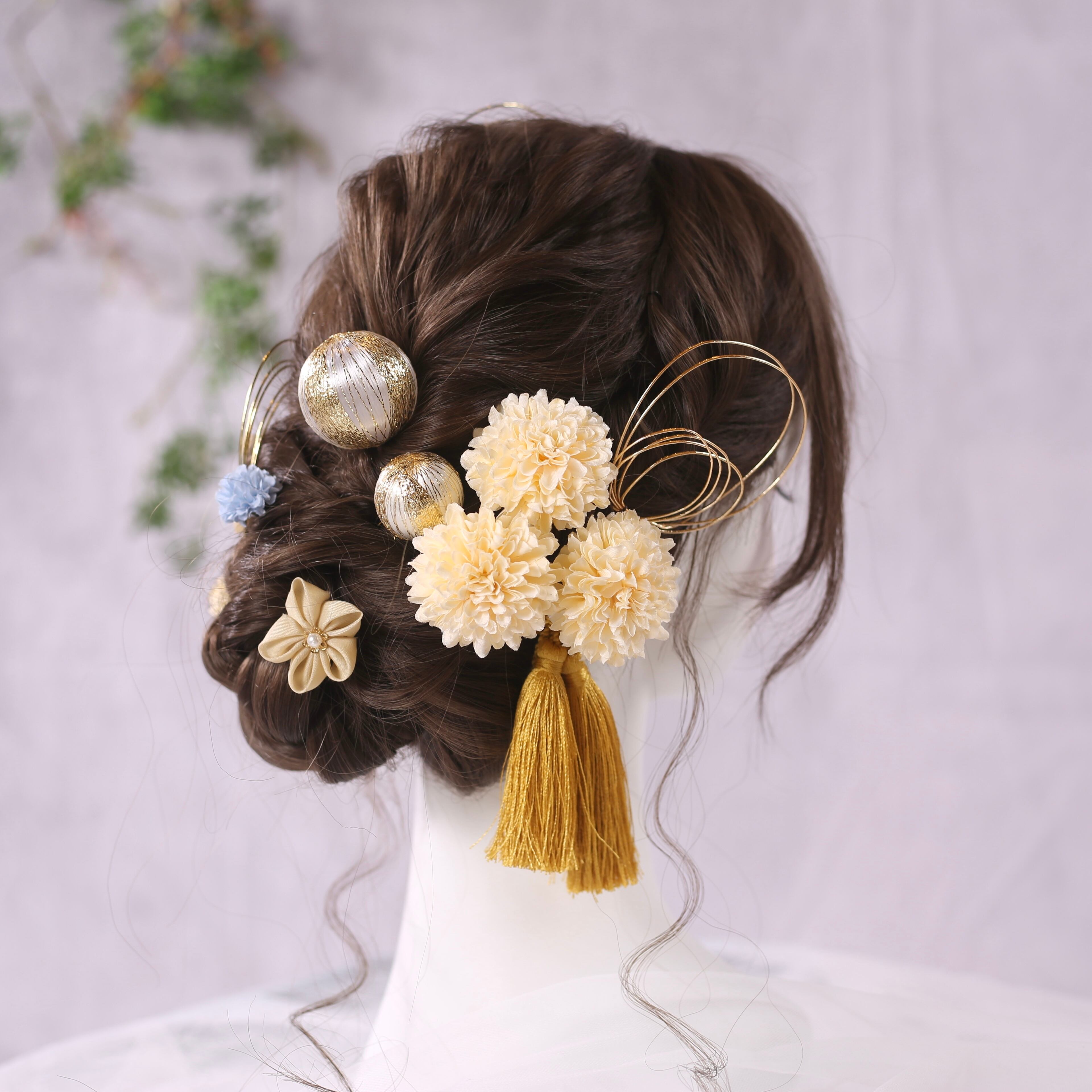 髪飾り 髪飾りセット 成人式 振袖 結婚式 ブライダル ヘッドドレス 卒業式 七五三 前撮り 白 ホワイト ベージュ ゴールド ダリア つまみ細工 タッセル 水引 K-90 | WA by Petal Prier