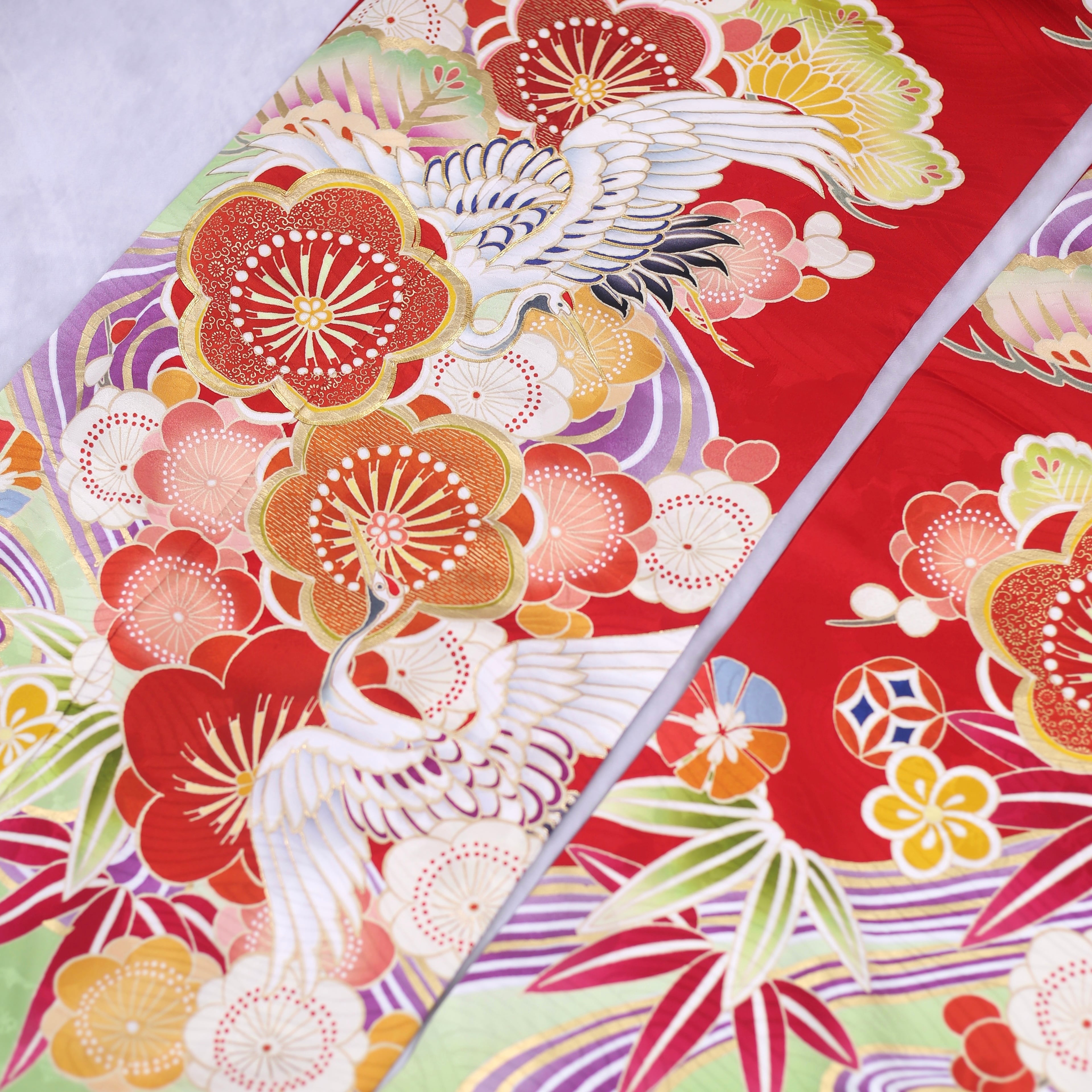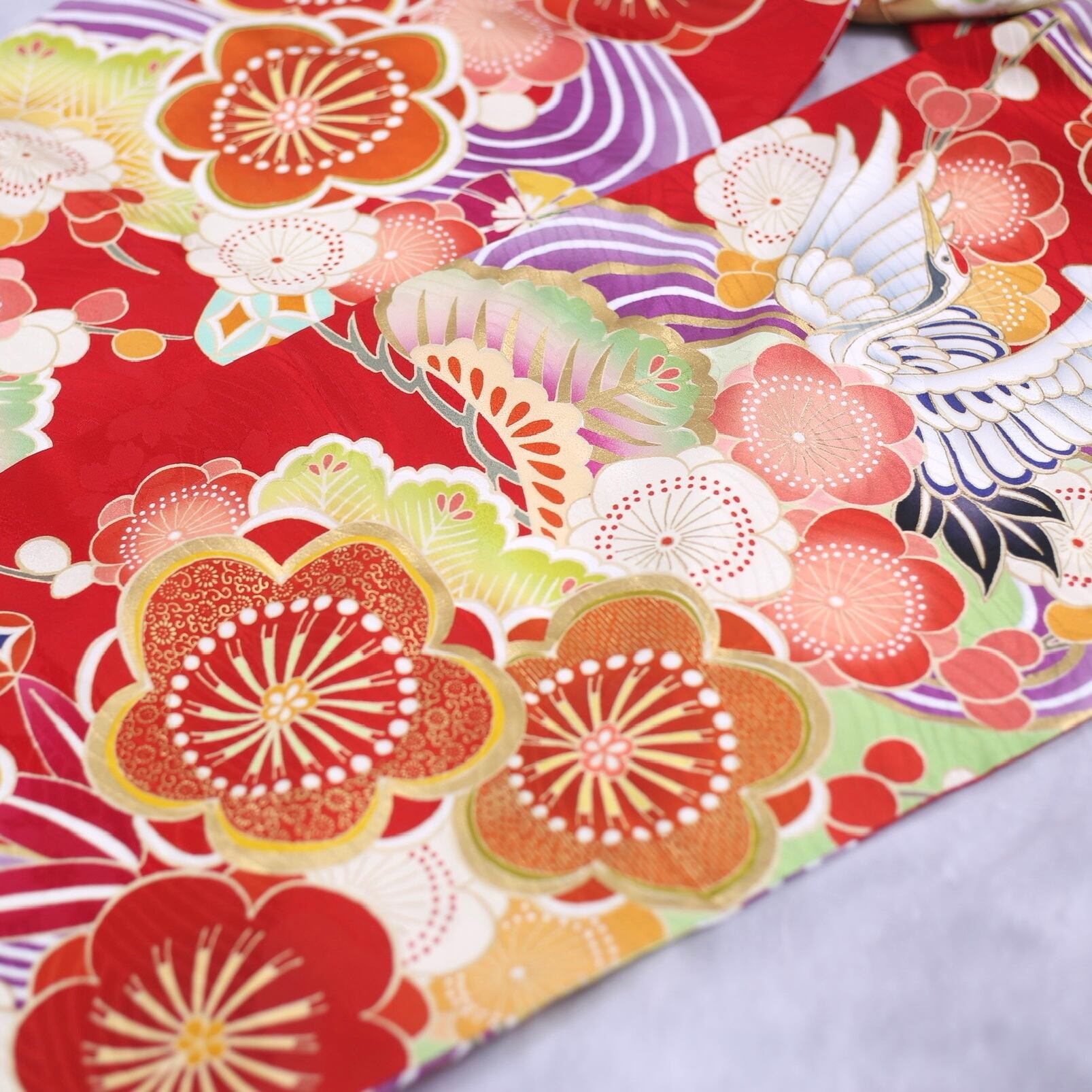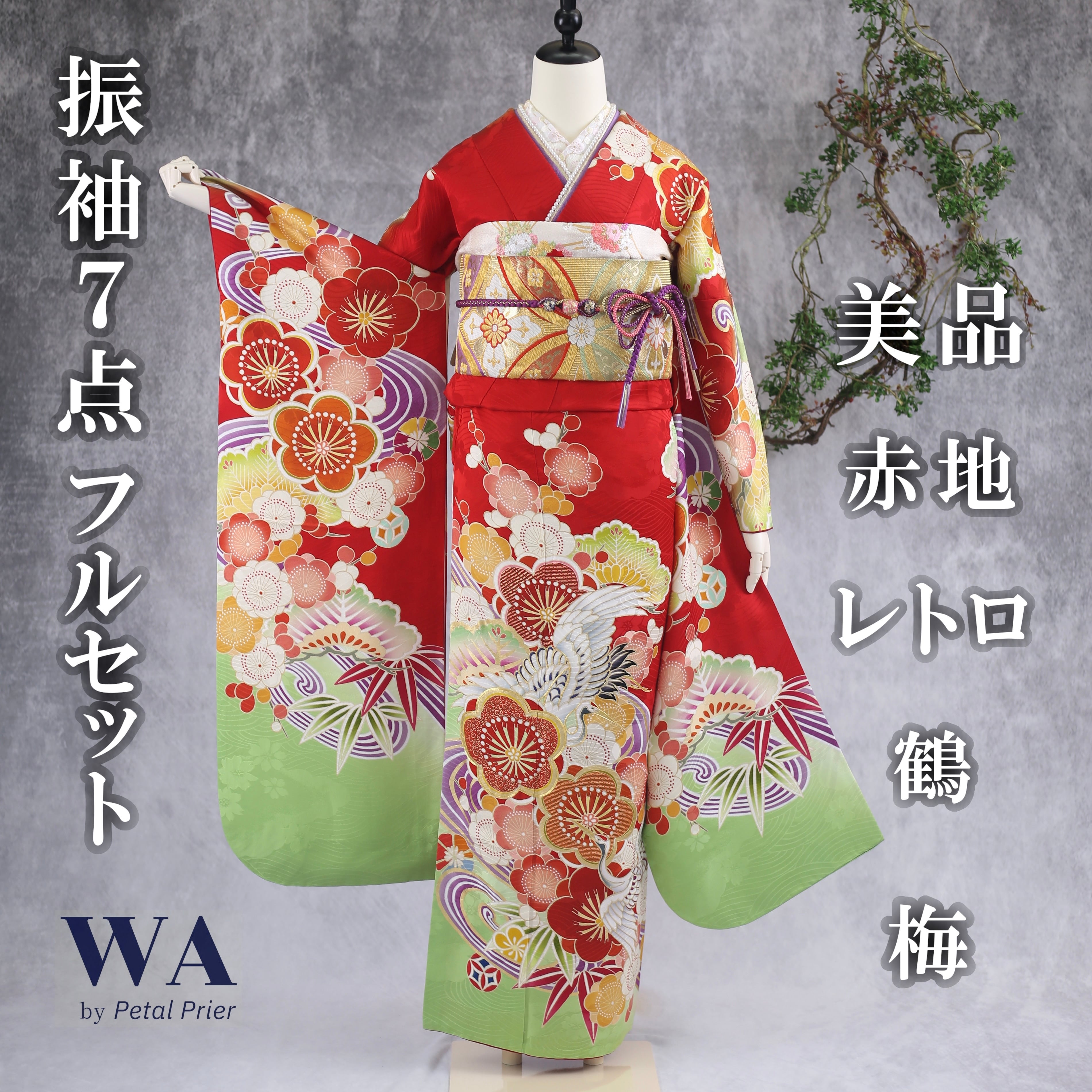 振袖フルセット 振袖セット 振袖 Lサイズ 赤×黄緑 美品 成人式 着物 晴れ着 7点フルセット F-25