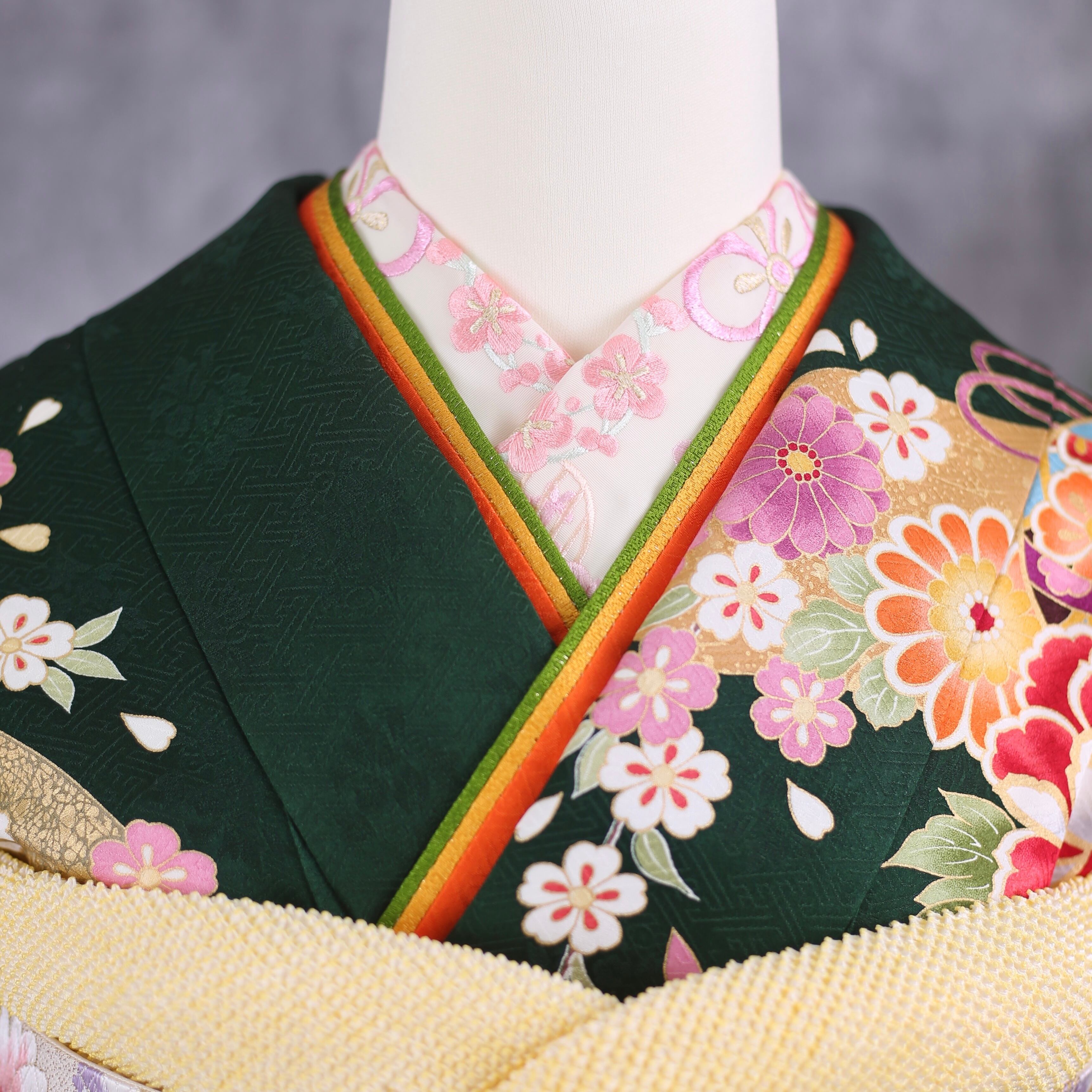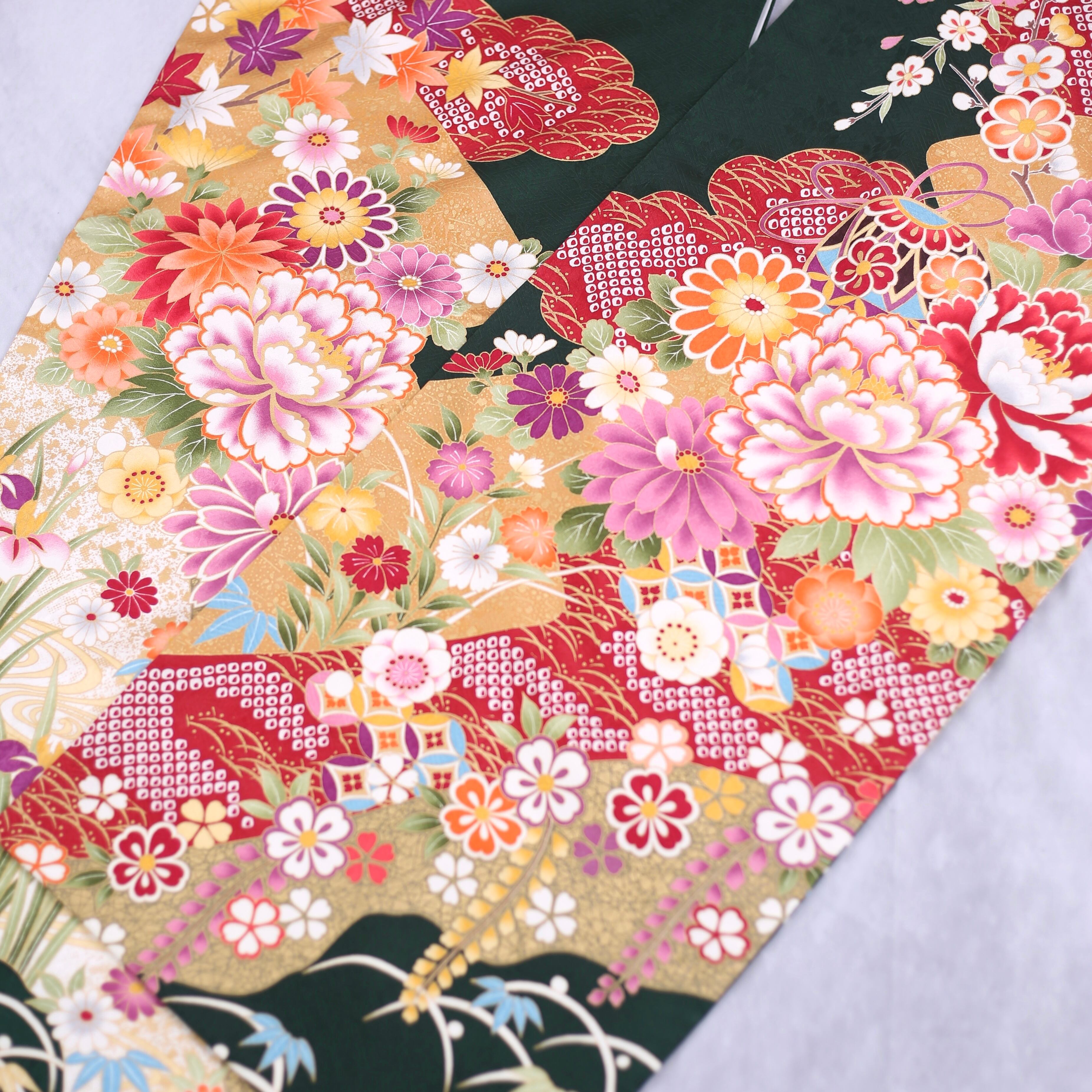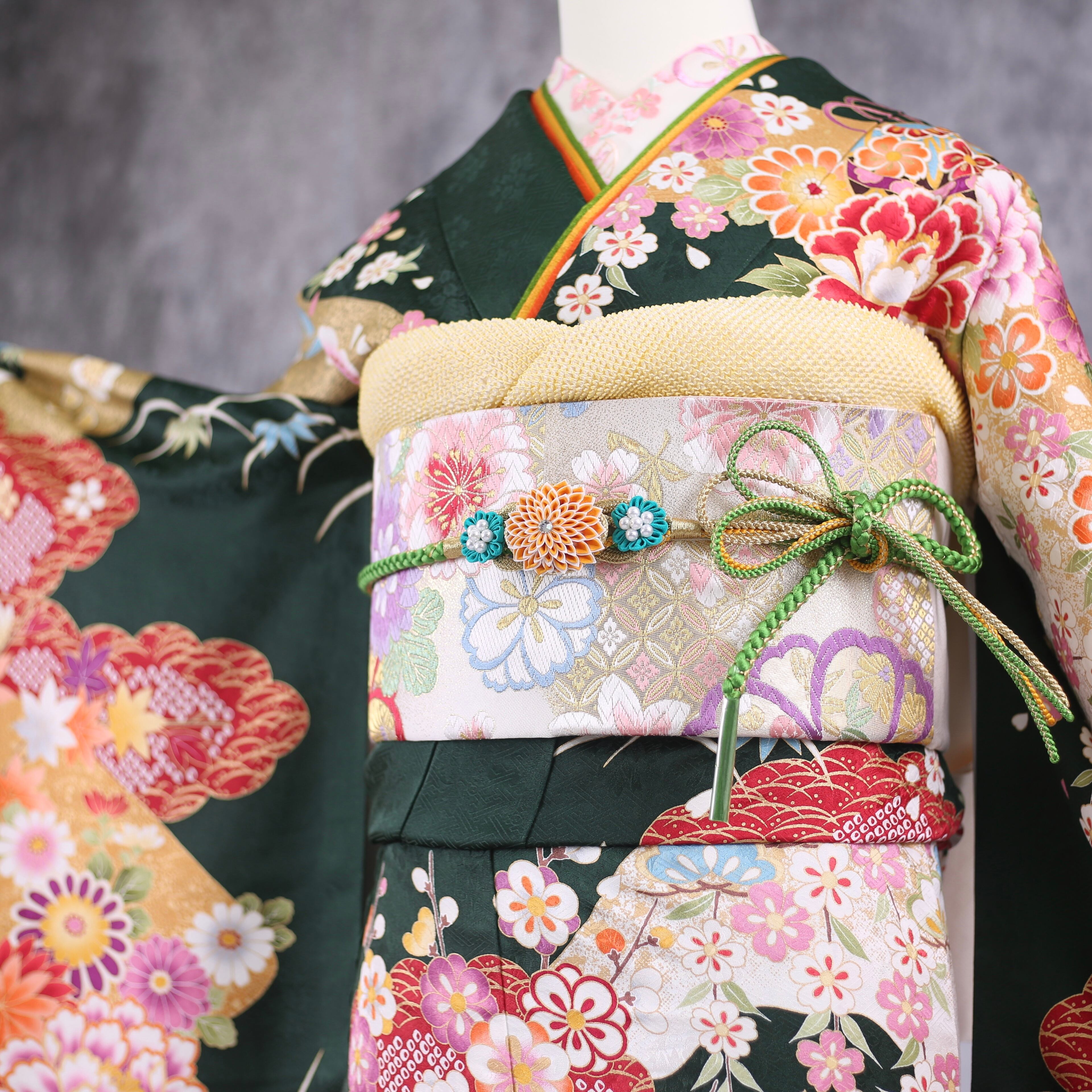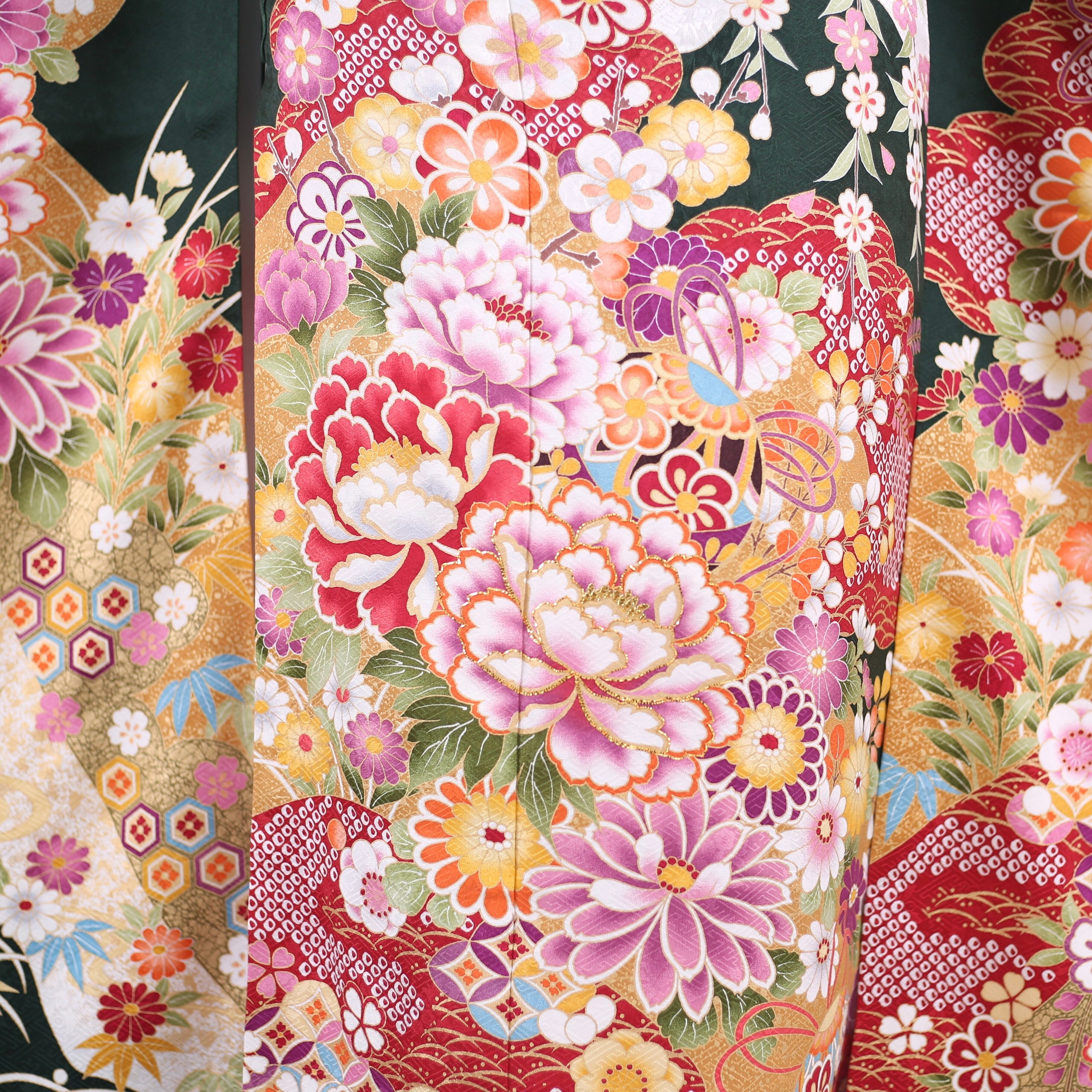 振袖フルセット 振袖セット 振袖 Mサイズ 深緑×新古典 美品 成人式 着物 晴れ着 7点フルセット F-28