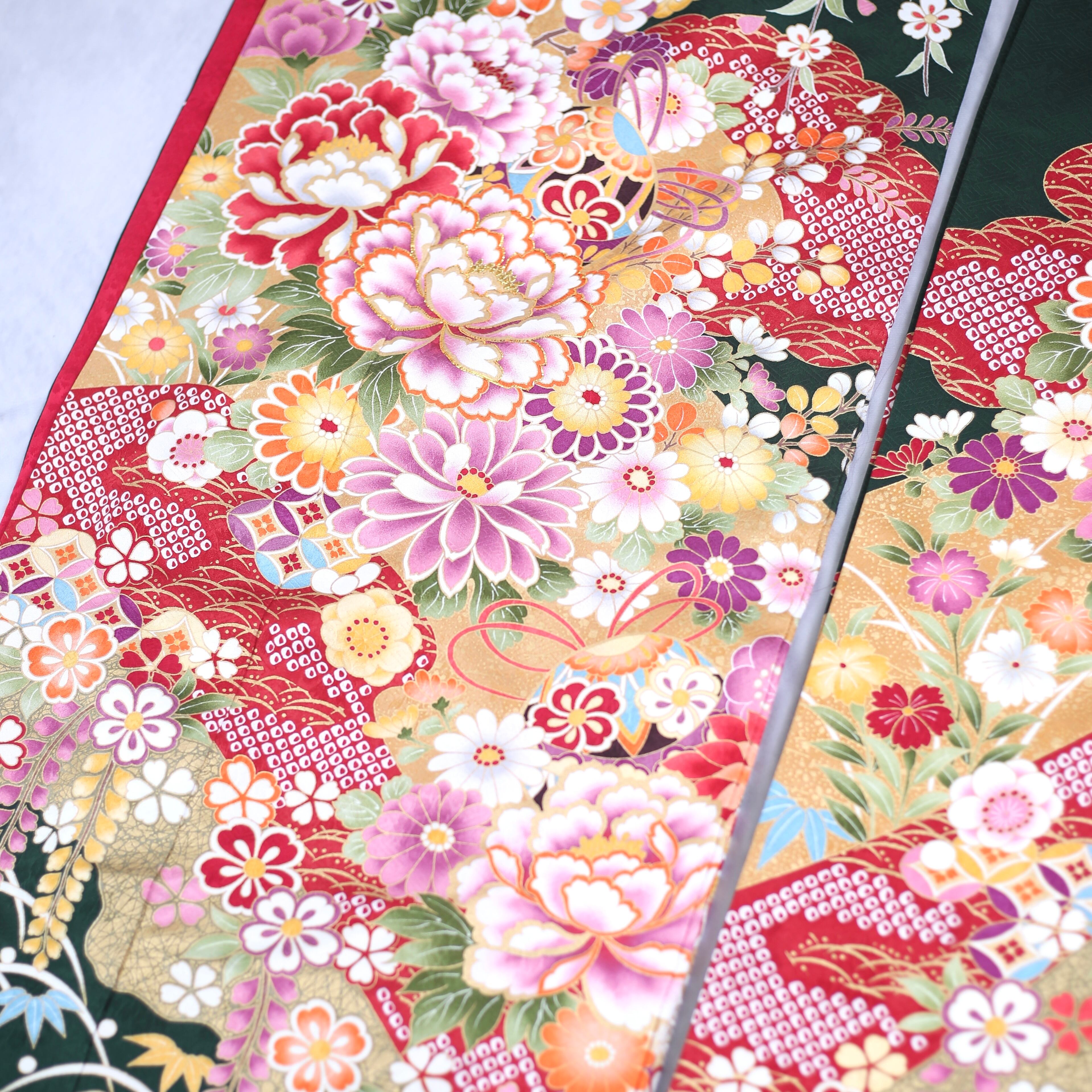 落ち着いた緑地に色とりどりの花々が豪華に咲いた古典柄の振袖!