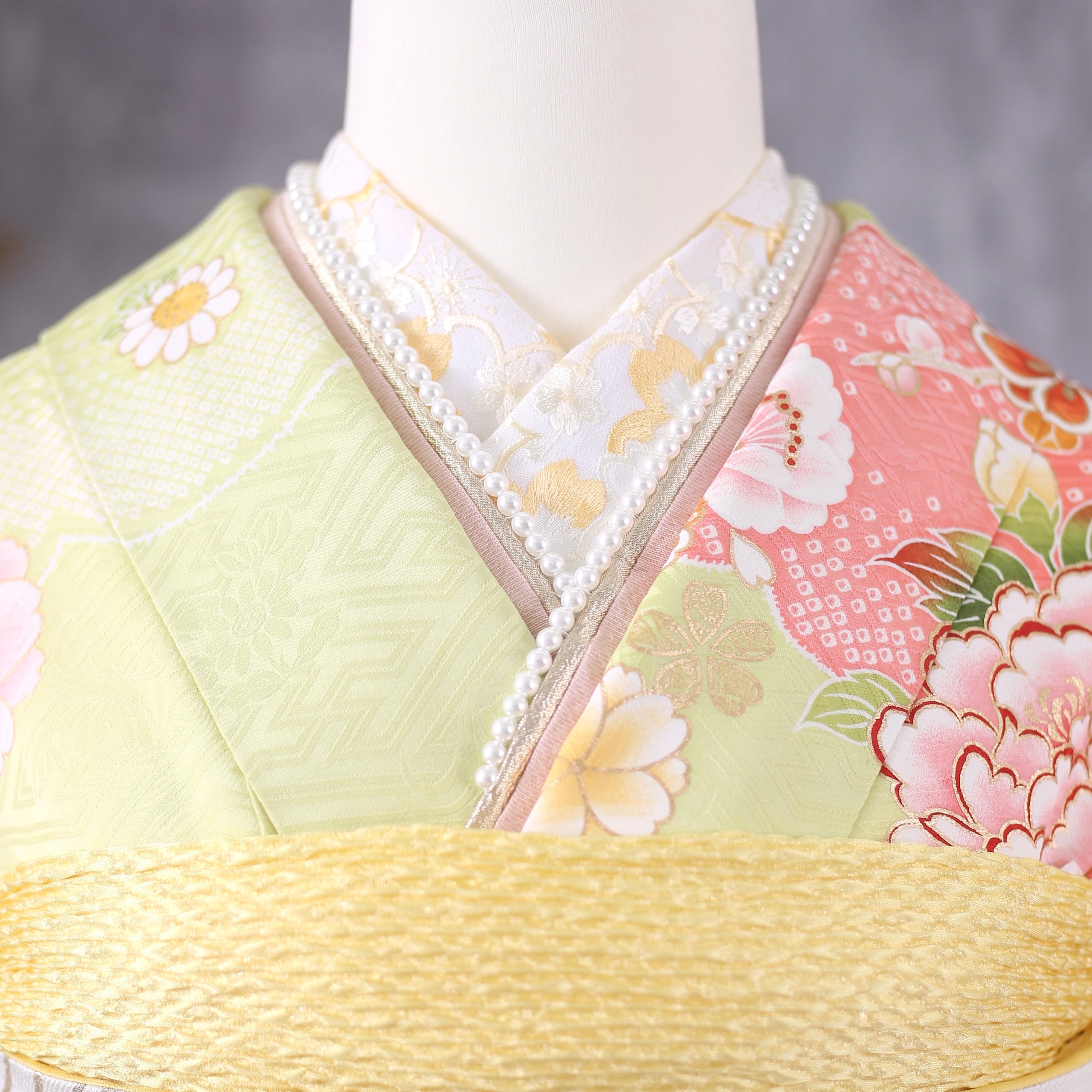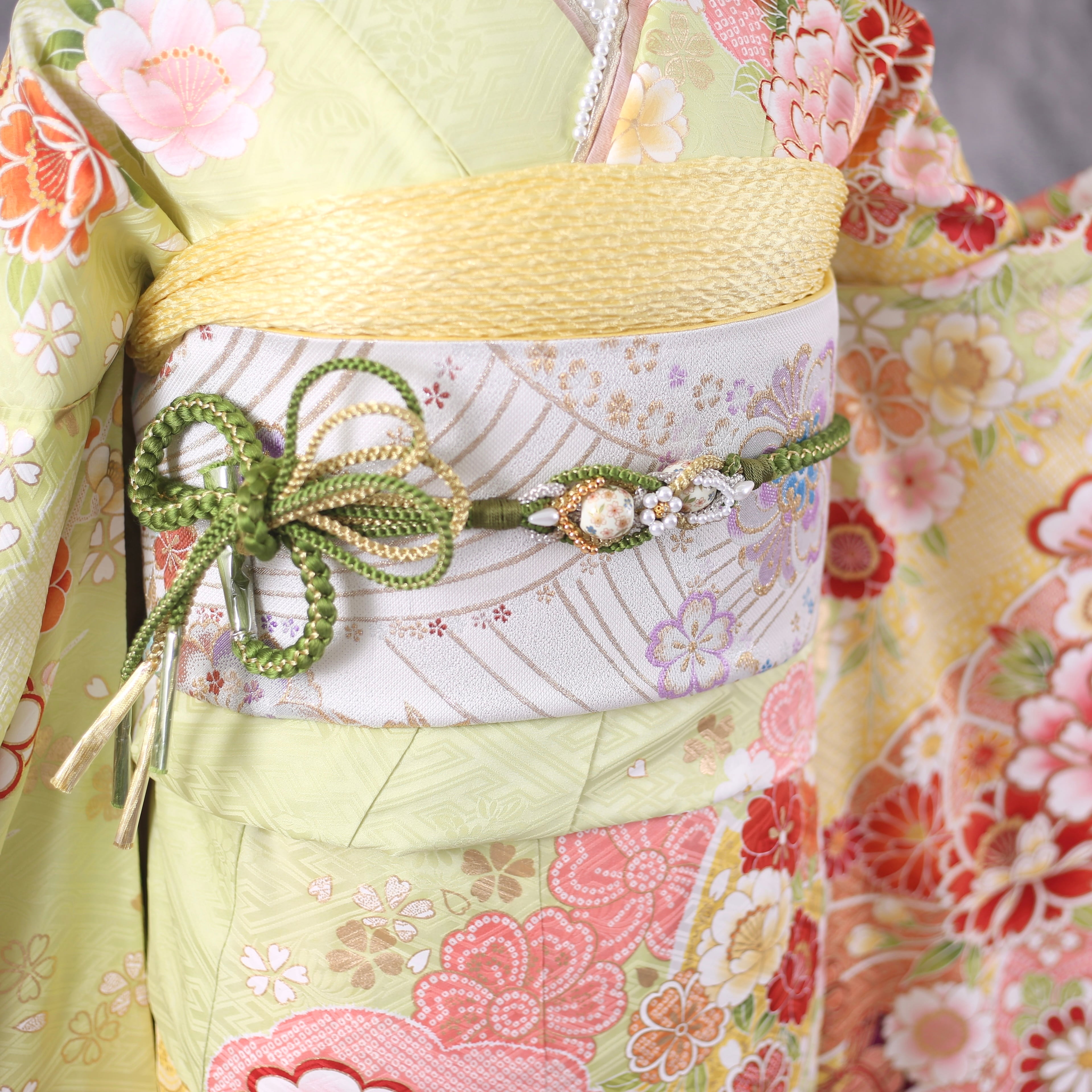 明るい黄緑地で、華やかな柄が可憐で清楚な雰囲気の振袖です。