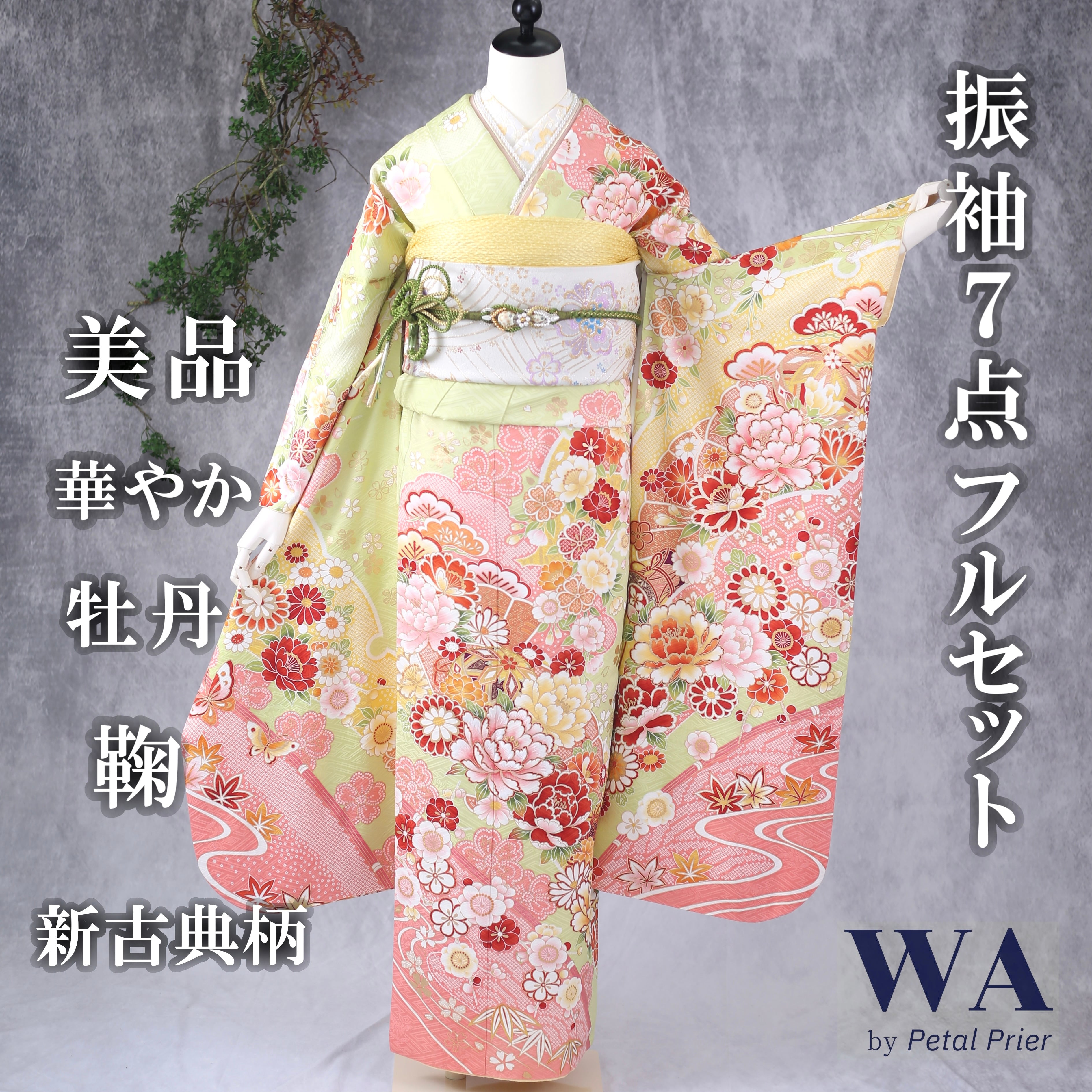 振袖フルセット 振袖セット 振袖 Mサイズ 黄緑×新古典 美品 成人式 着物 晴れ着 7点フルセット F-44