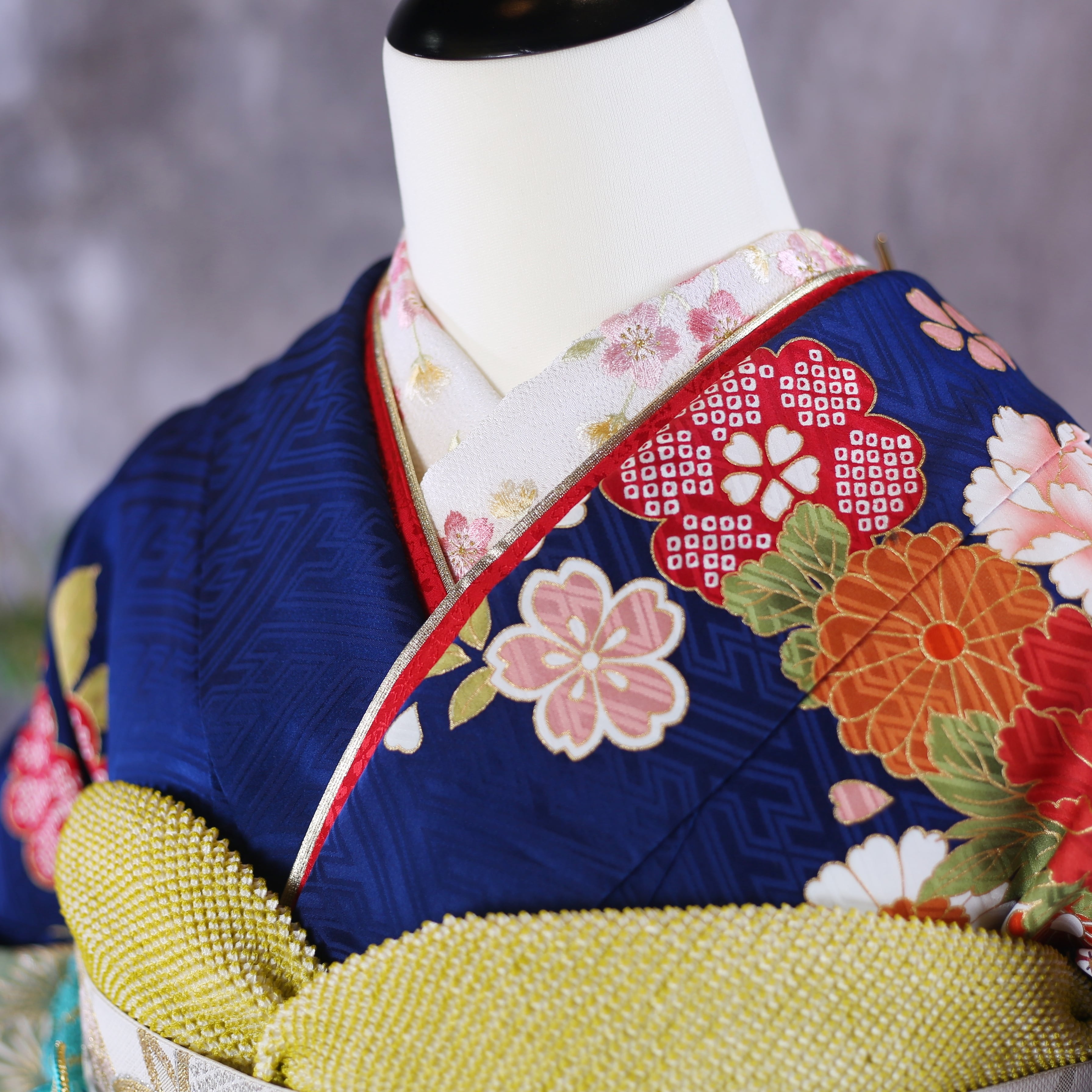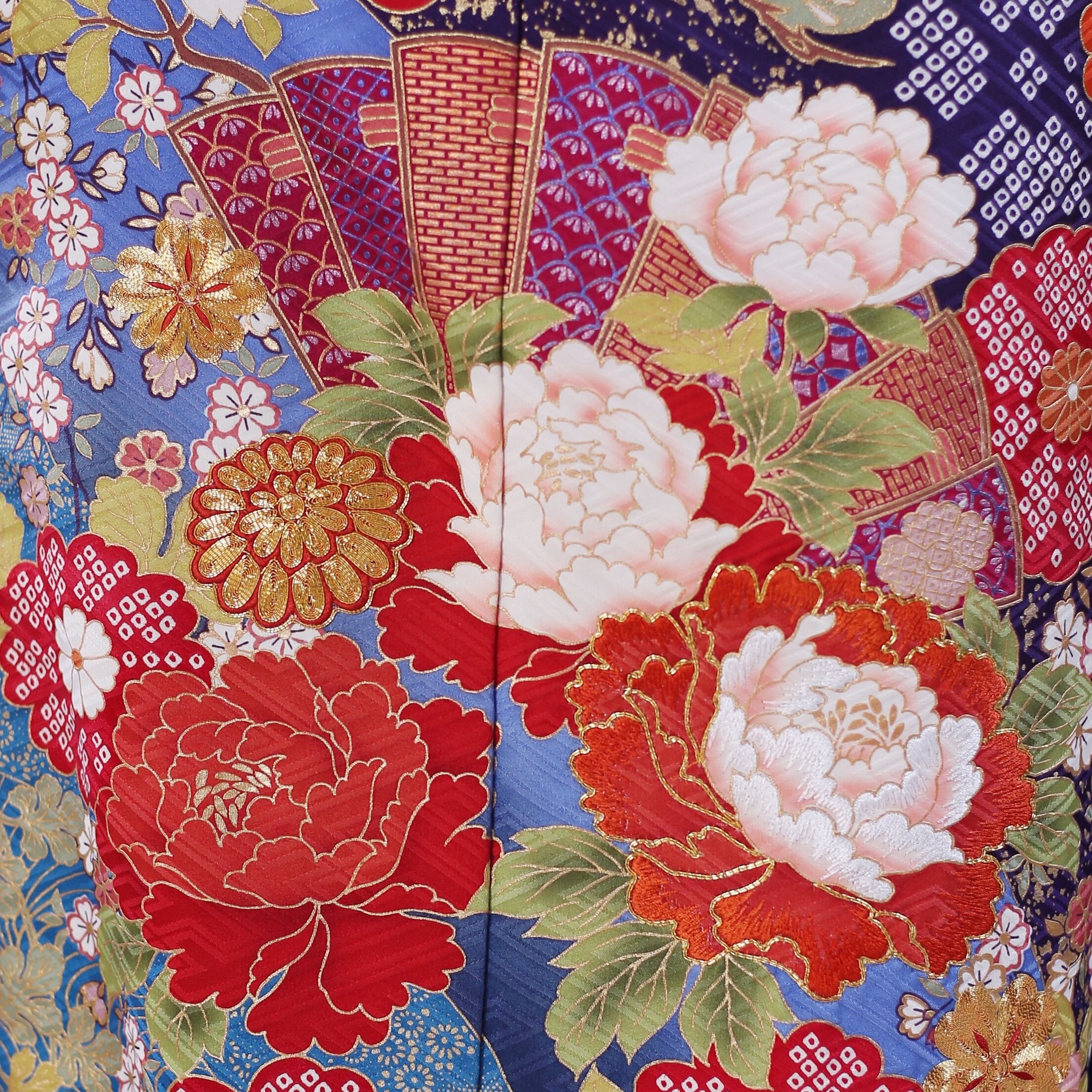 鮮やかな紺青に、華やかな柄がよく映えた一品です。