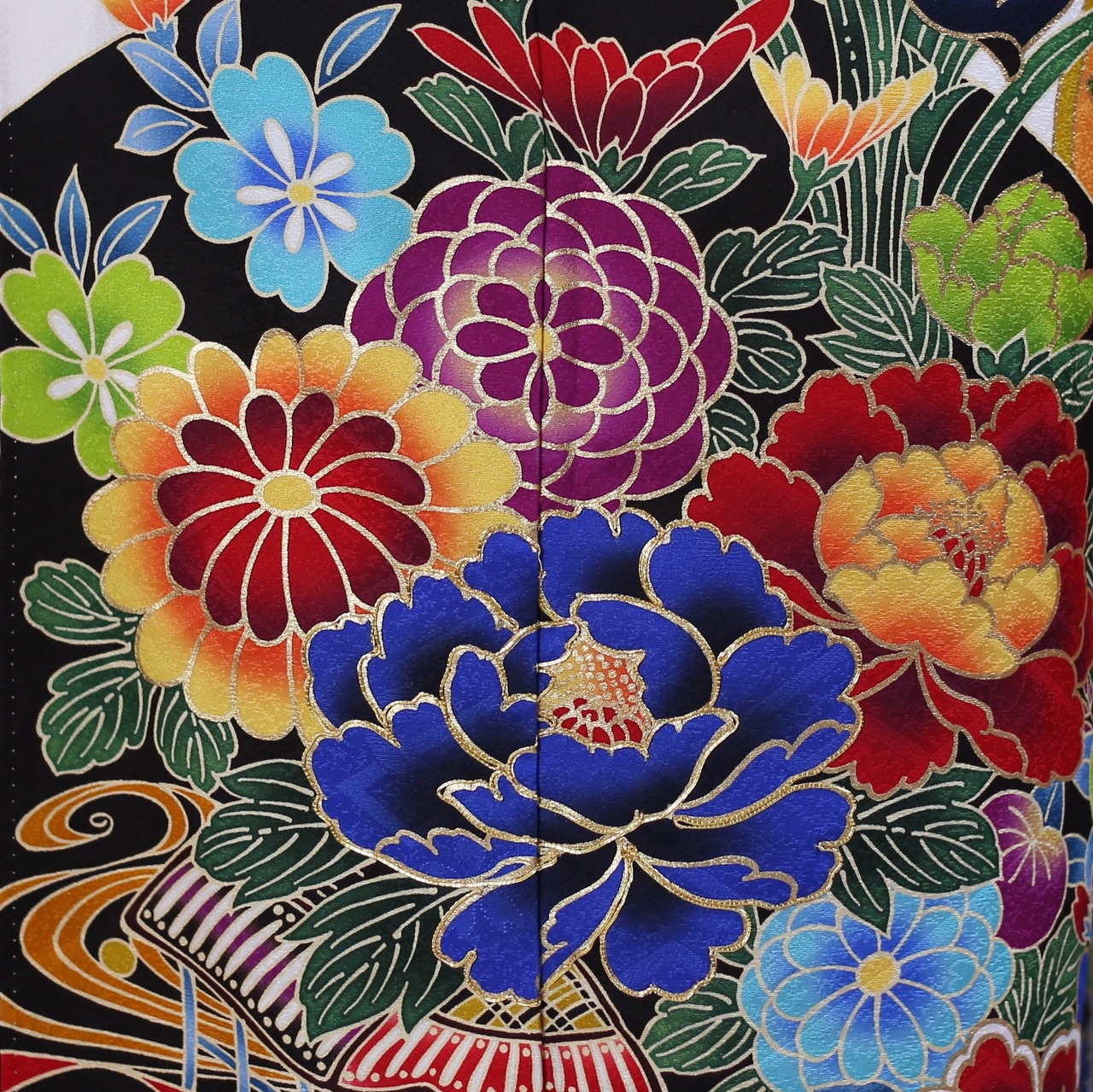 落ち着いた紫地で華やかな柄が印象的な一品。