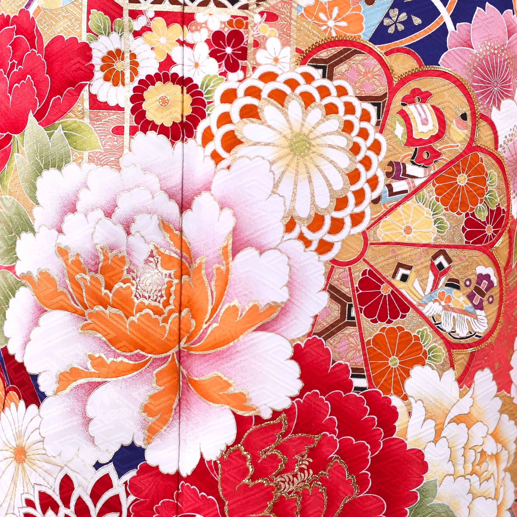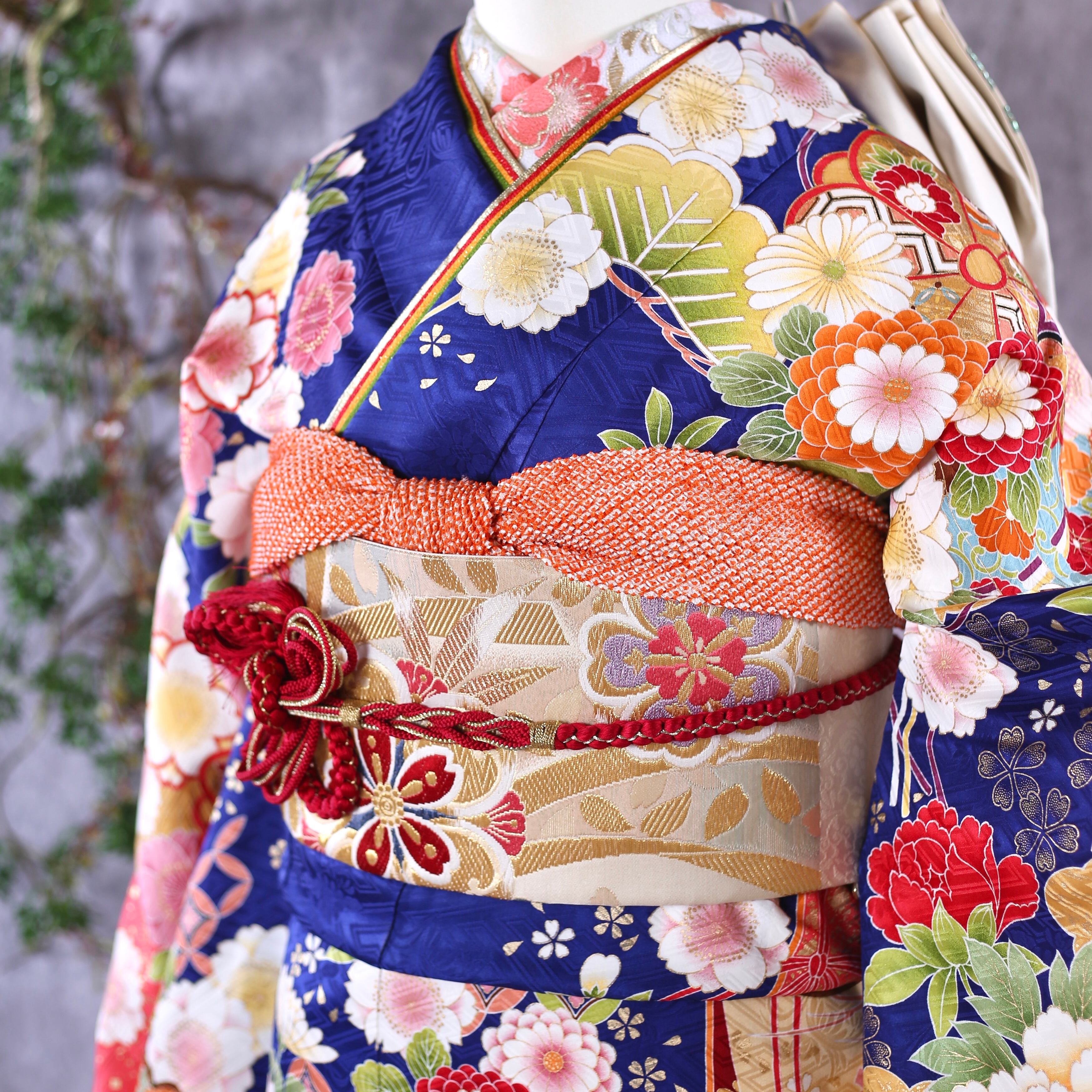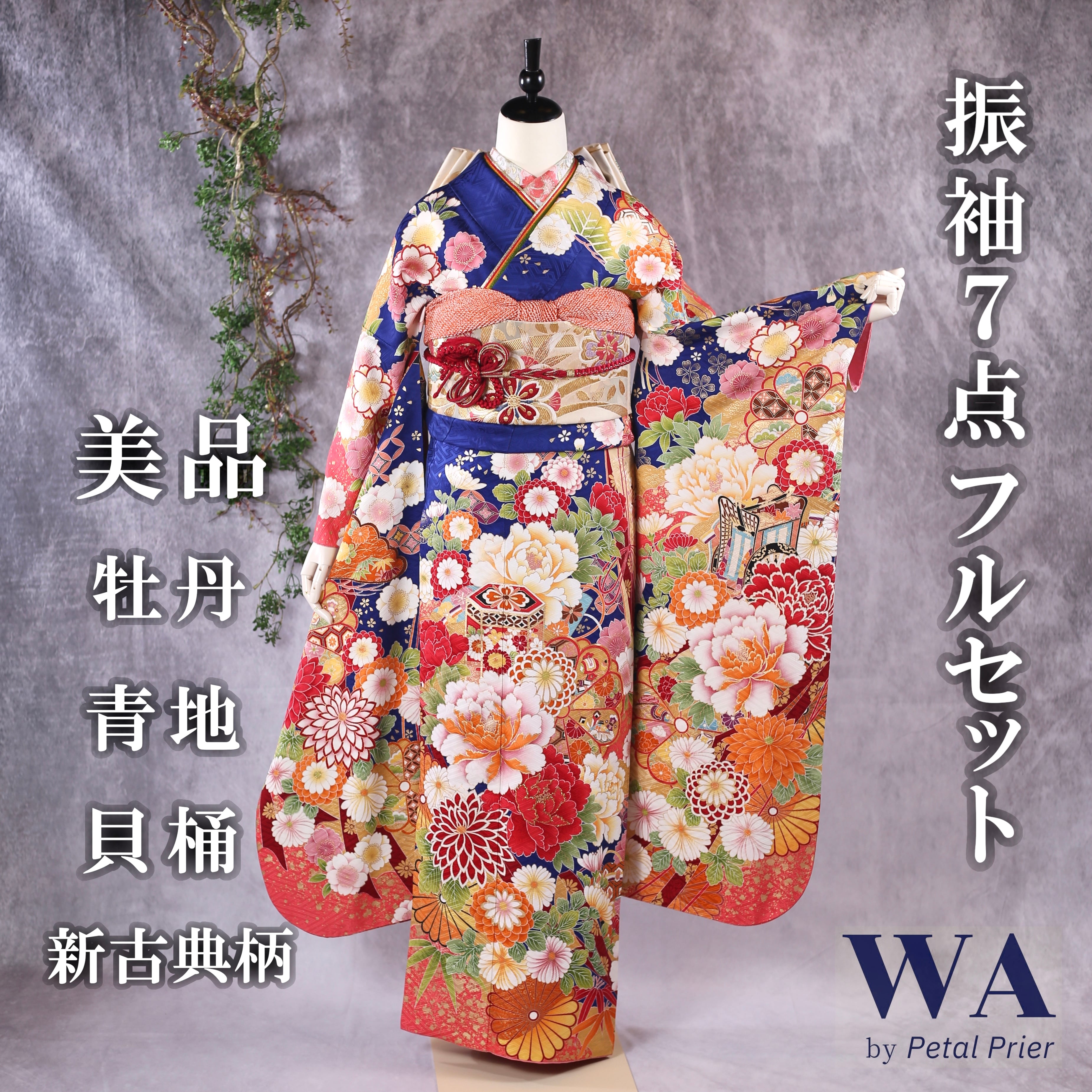 振袖フルセット 振袖セット 振袖 Lサイズ 紺青×新古典 美品 成人式 着物 晴れ着 7点フルセット F-110