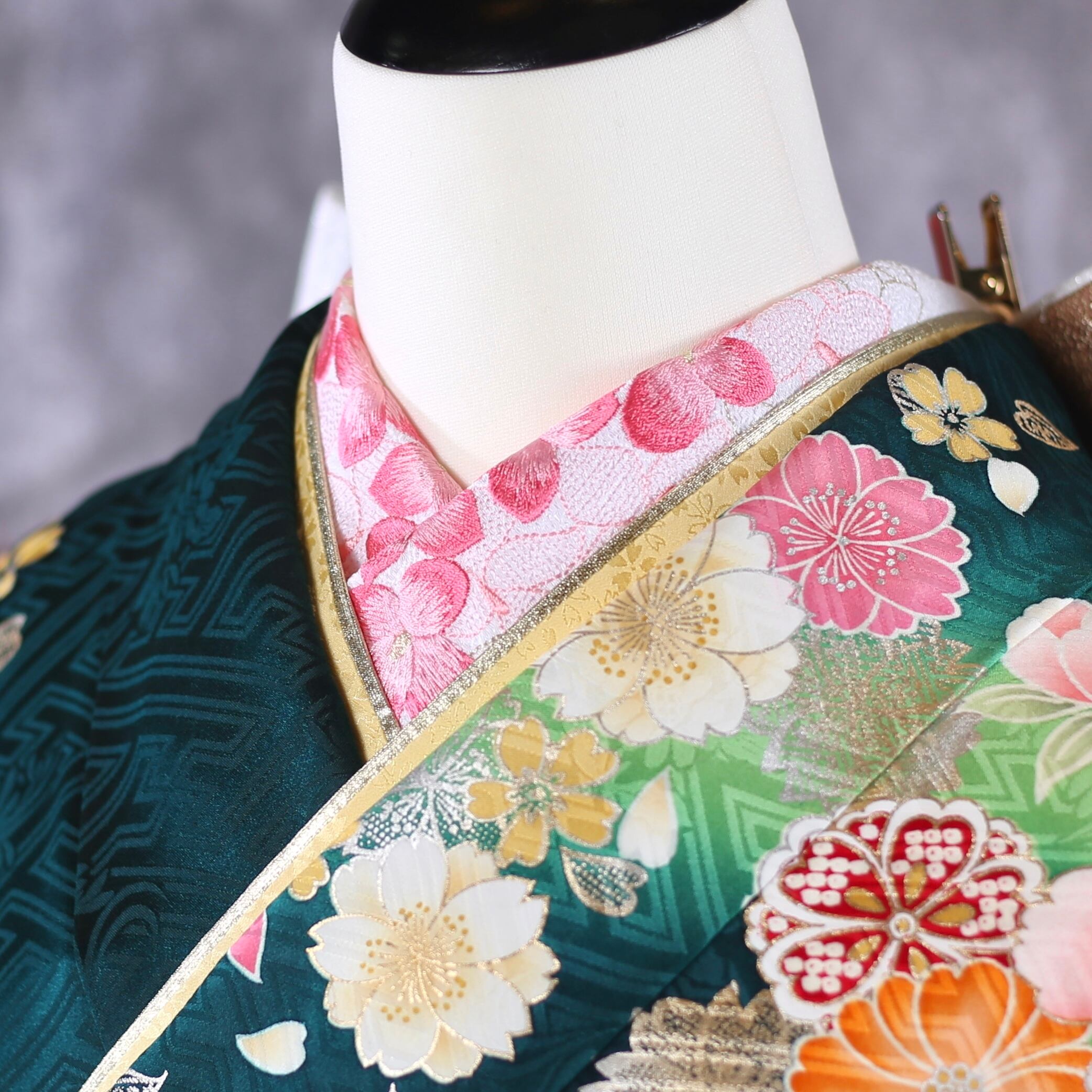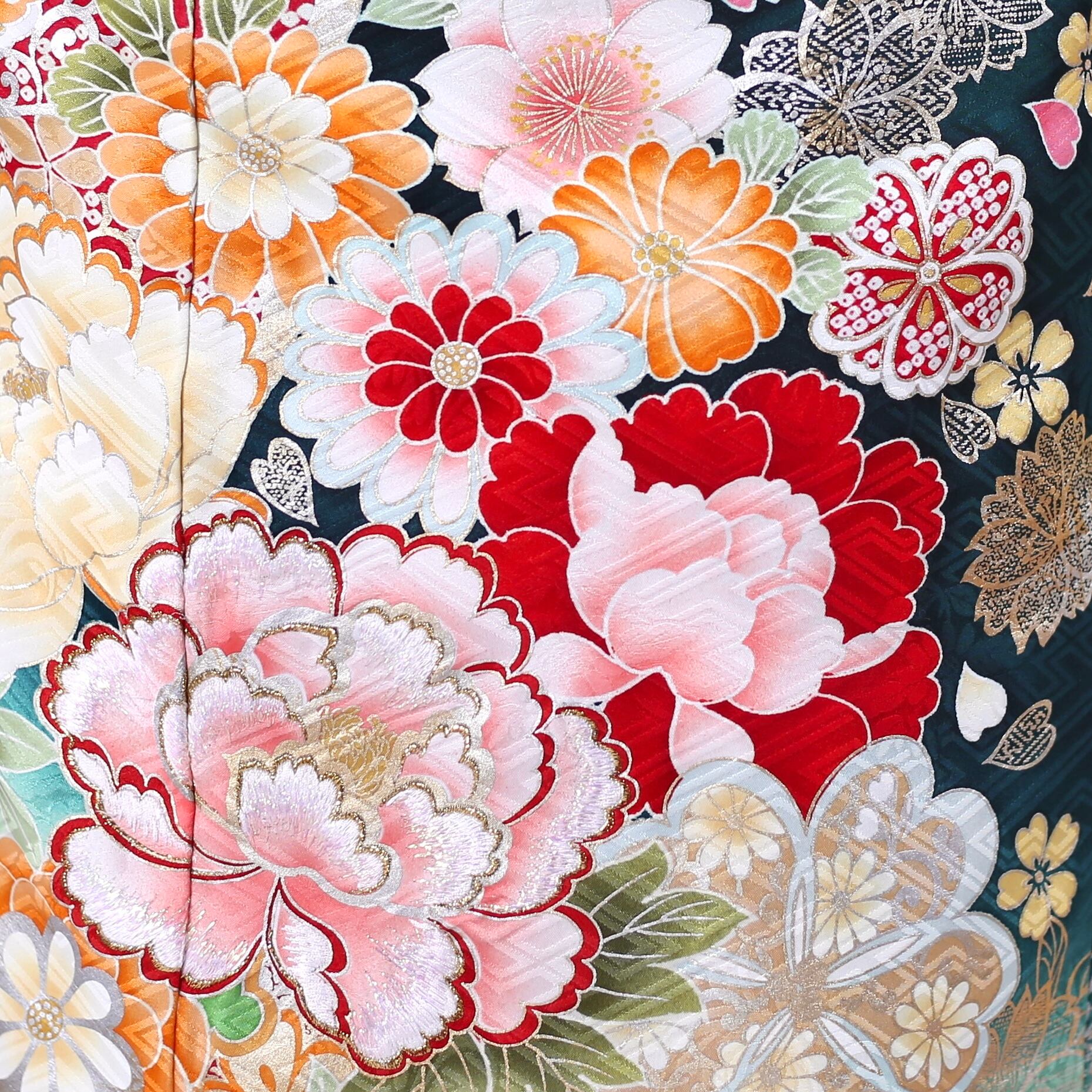 落ち着いた深緑地に明るく柔らかい柄のコントラストが華やかで上品な一枚。