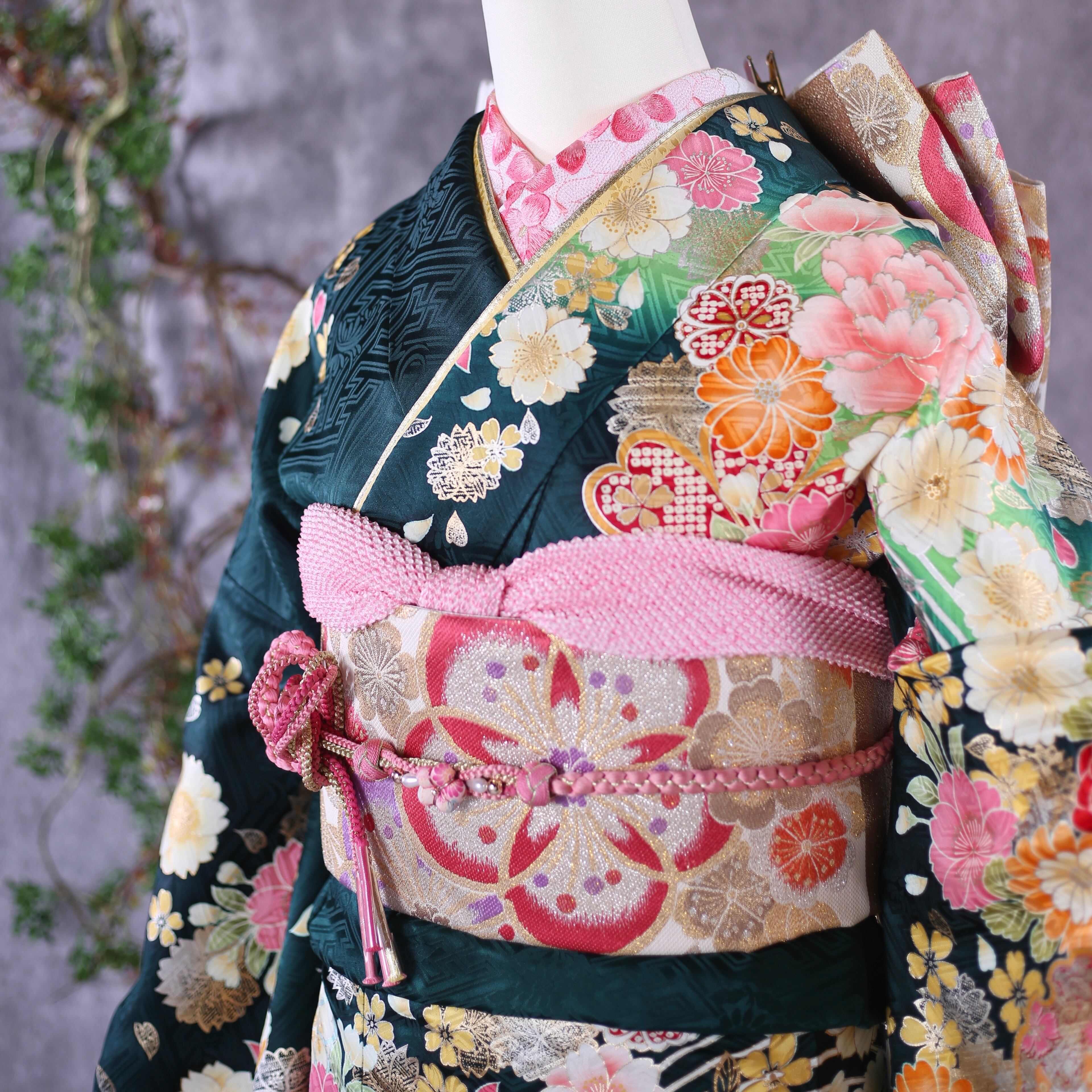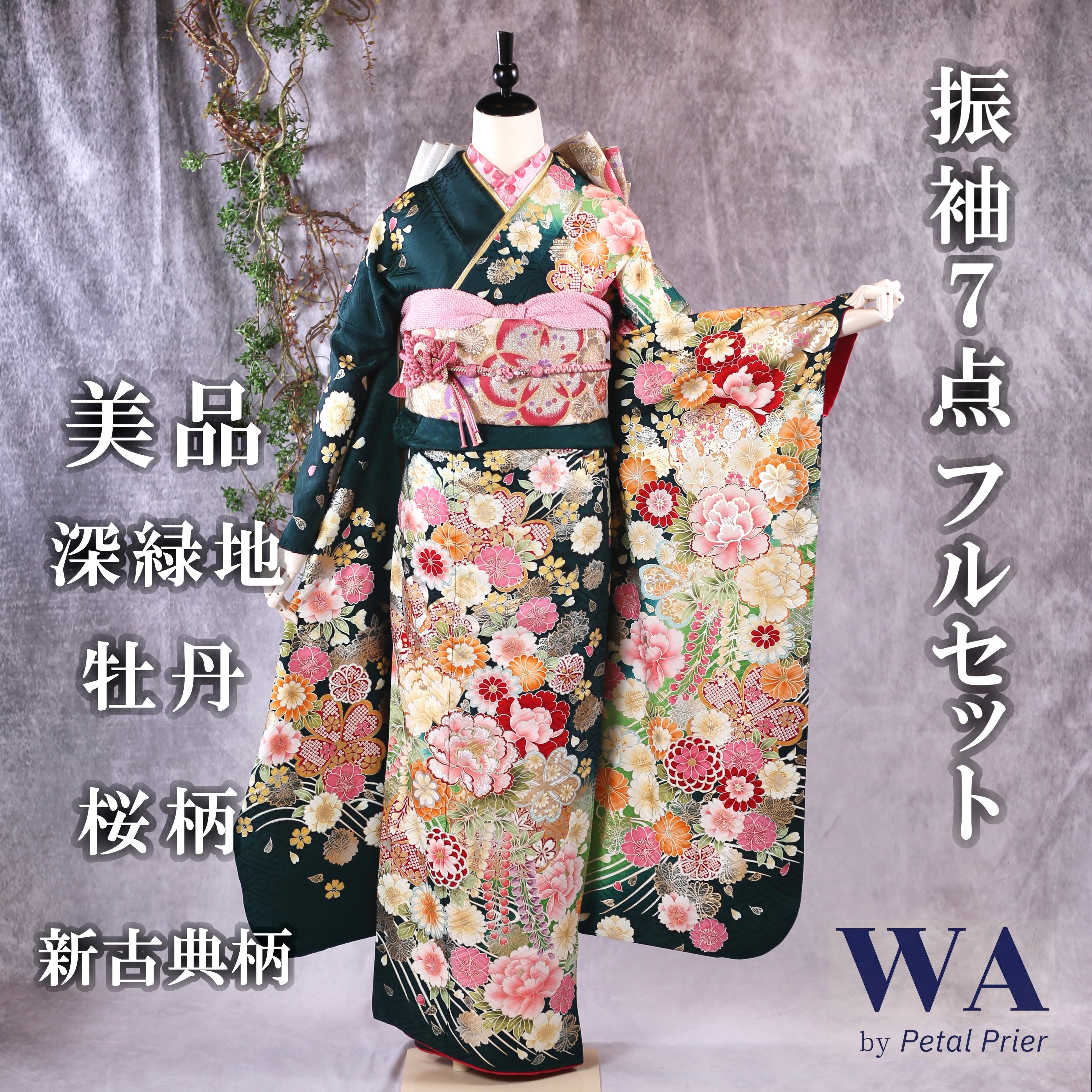 振袖フルセット 振袖セット 振袖 Lサイズ 深緑×新古典 美品 成人式 着物 晴れ着 7点フルセット F-136