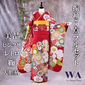 振袖フルセット 振袖セット 振袖 LLサイズ 赤×レトロポップ 美品 成人式 着物 晴れ着 7点フルセット F-168