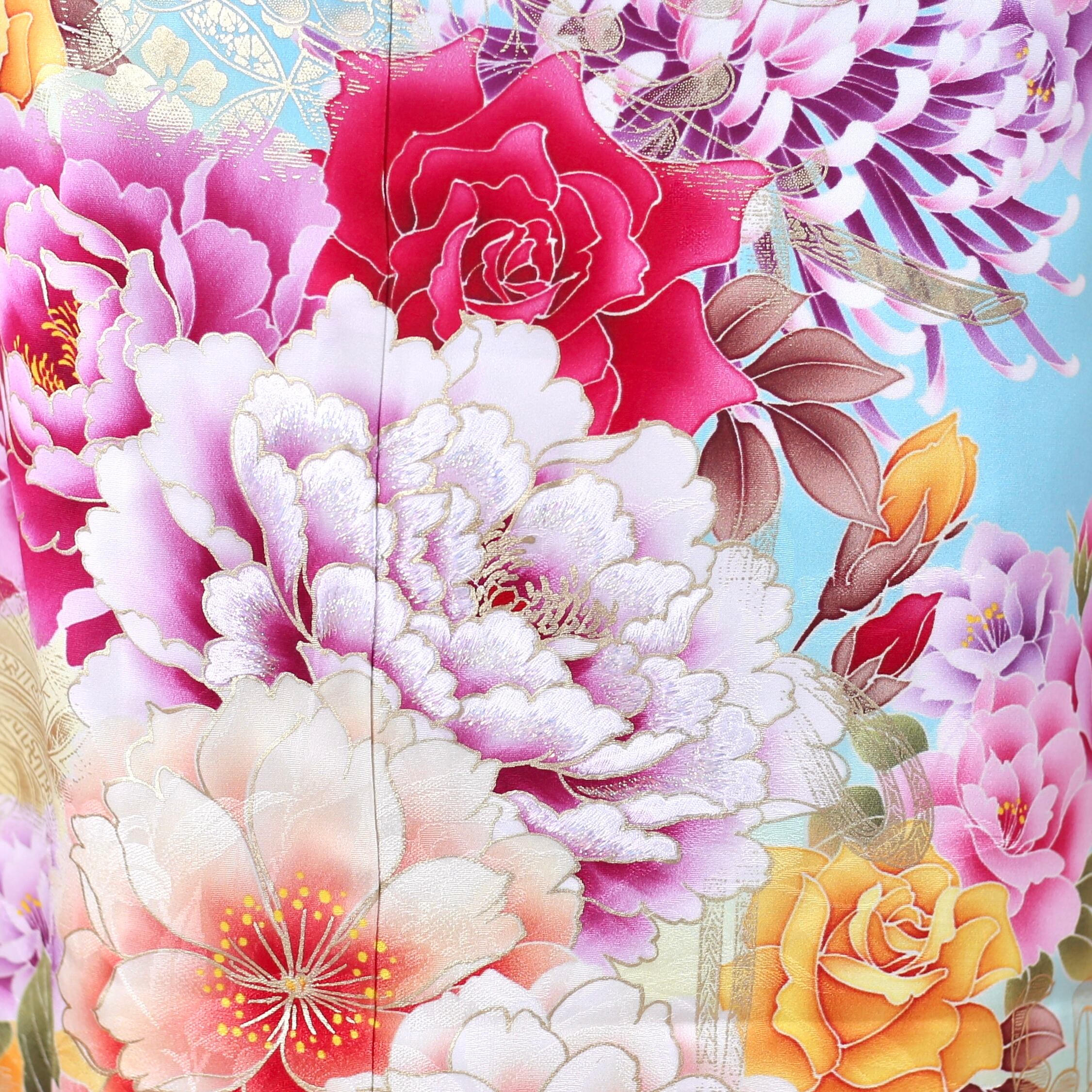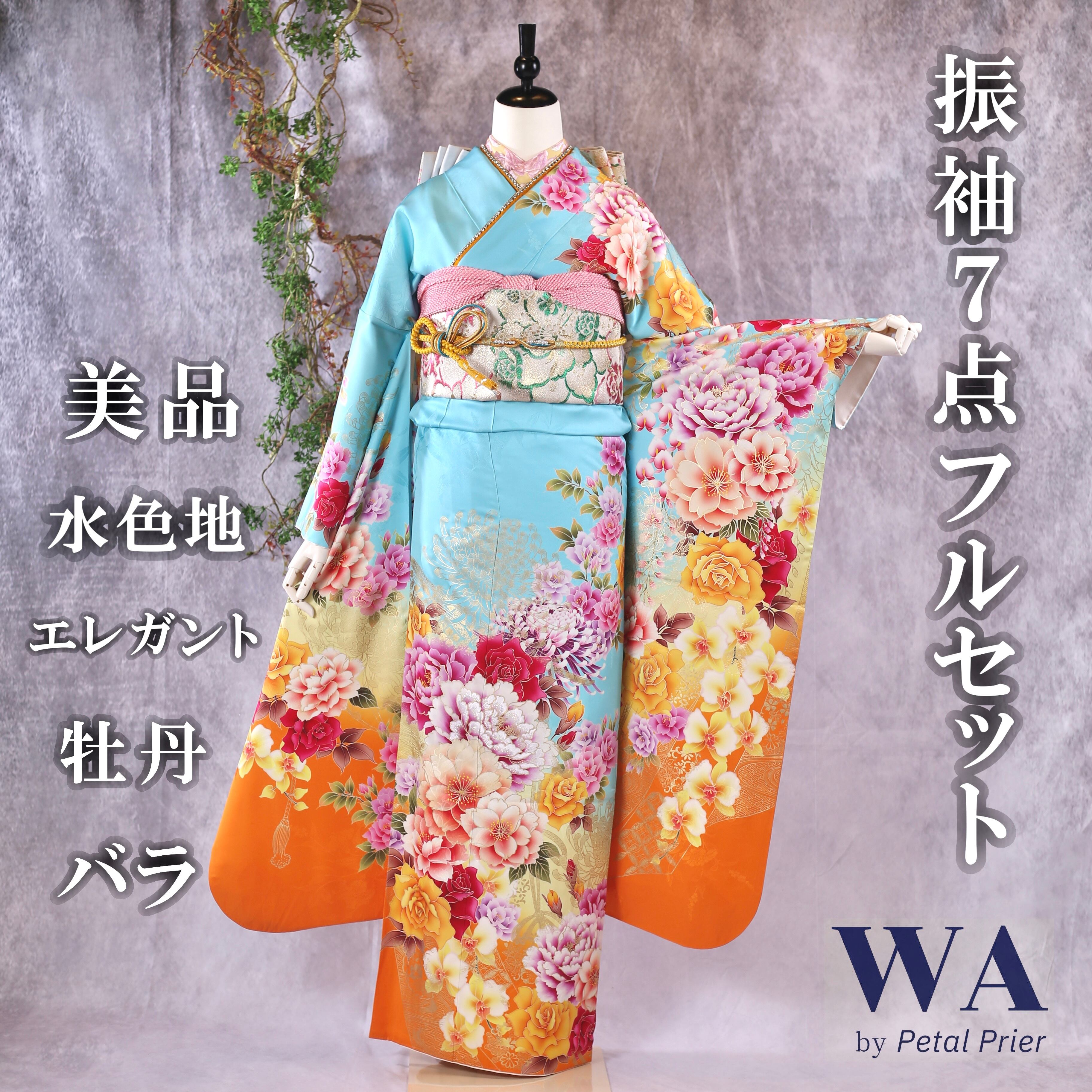振袖フルセット 振袖セット 振袖 M〜Lサイズ 水色×エレガント 美品 成人式 着物 晴れ着 7点フルセット F-176