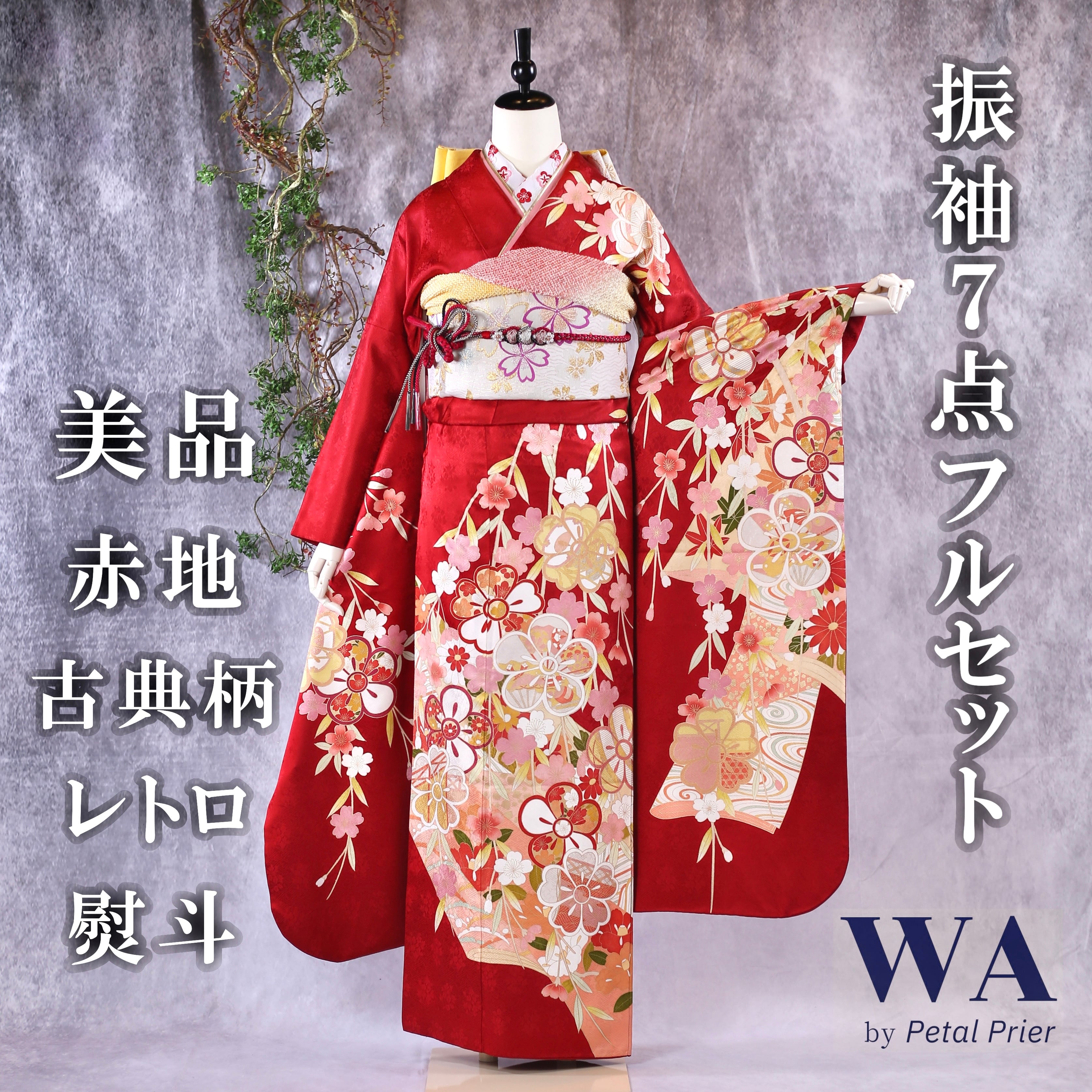 振袖フルセット 振袖セット 振袖 Lサイズ 赤×レトロ 美品 成人式 着物 晴れ着 7点フルセット F-109