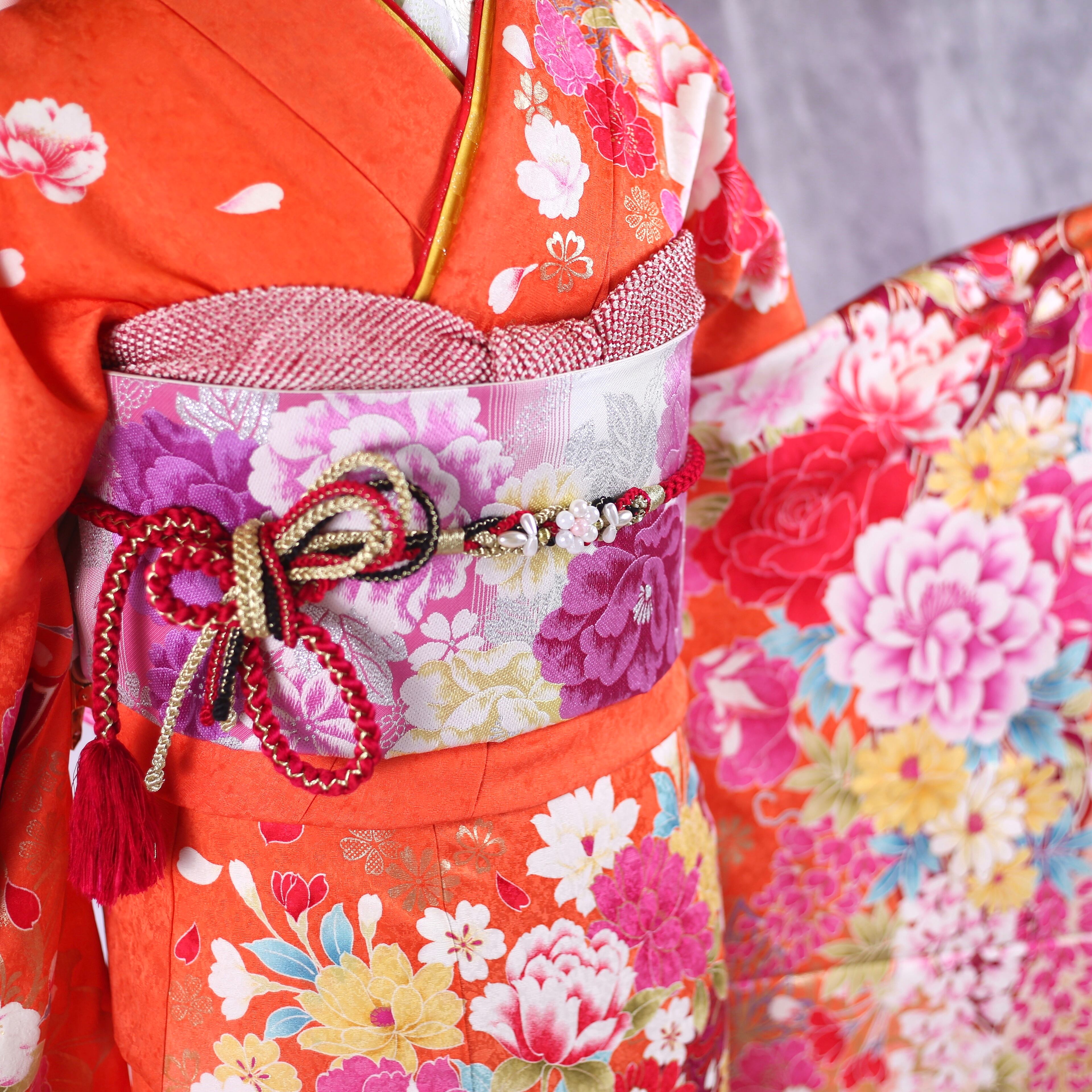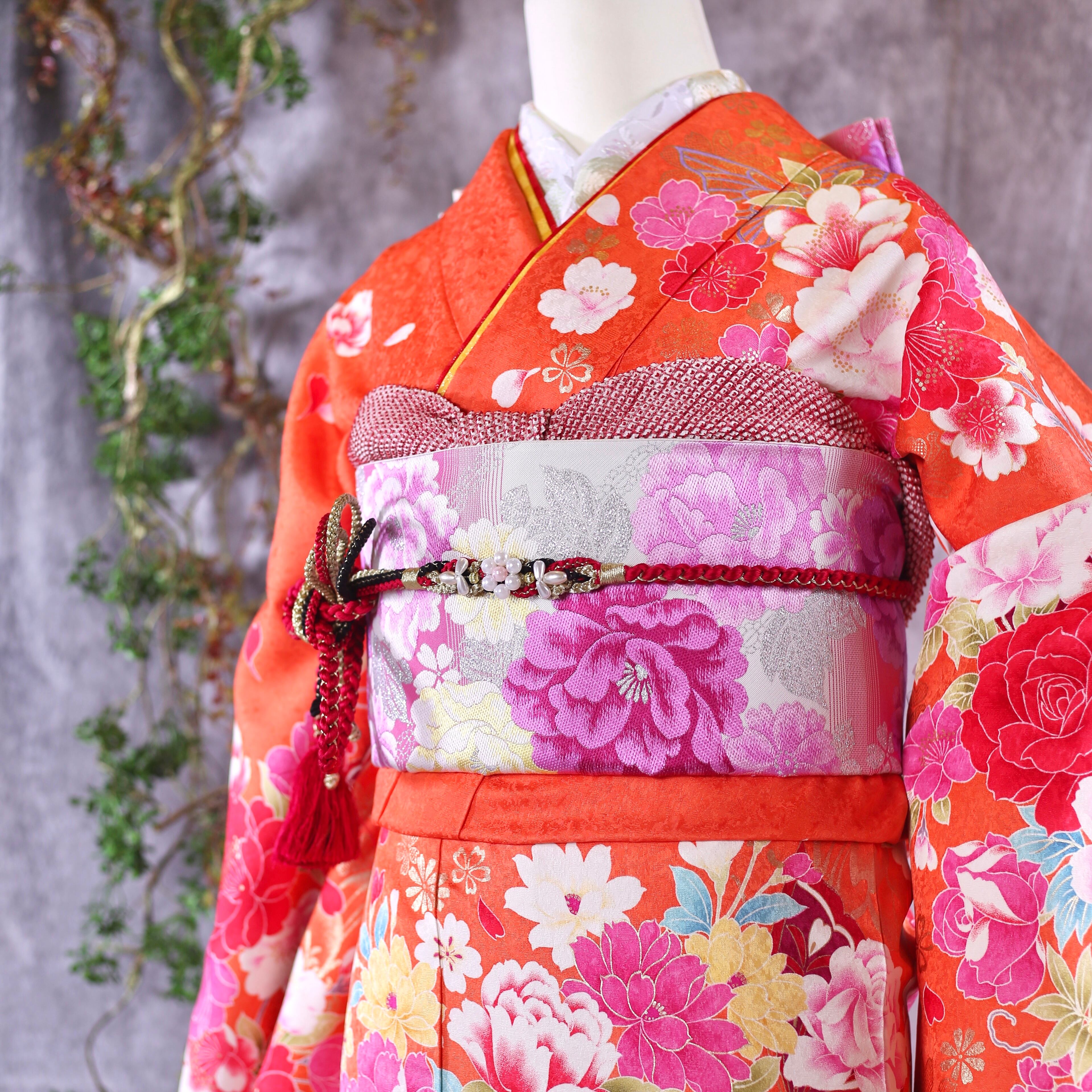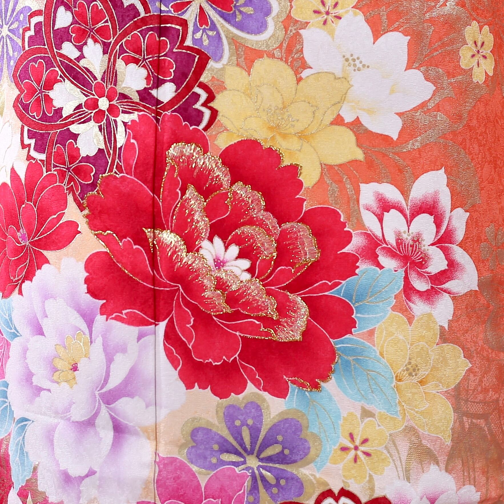 鮮麗なオレンジ地に牡丹柄が大胆に描かれた振袖です。