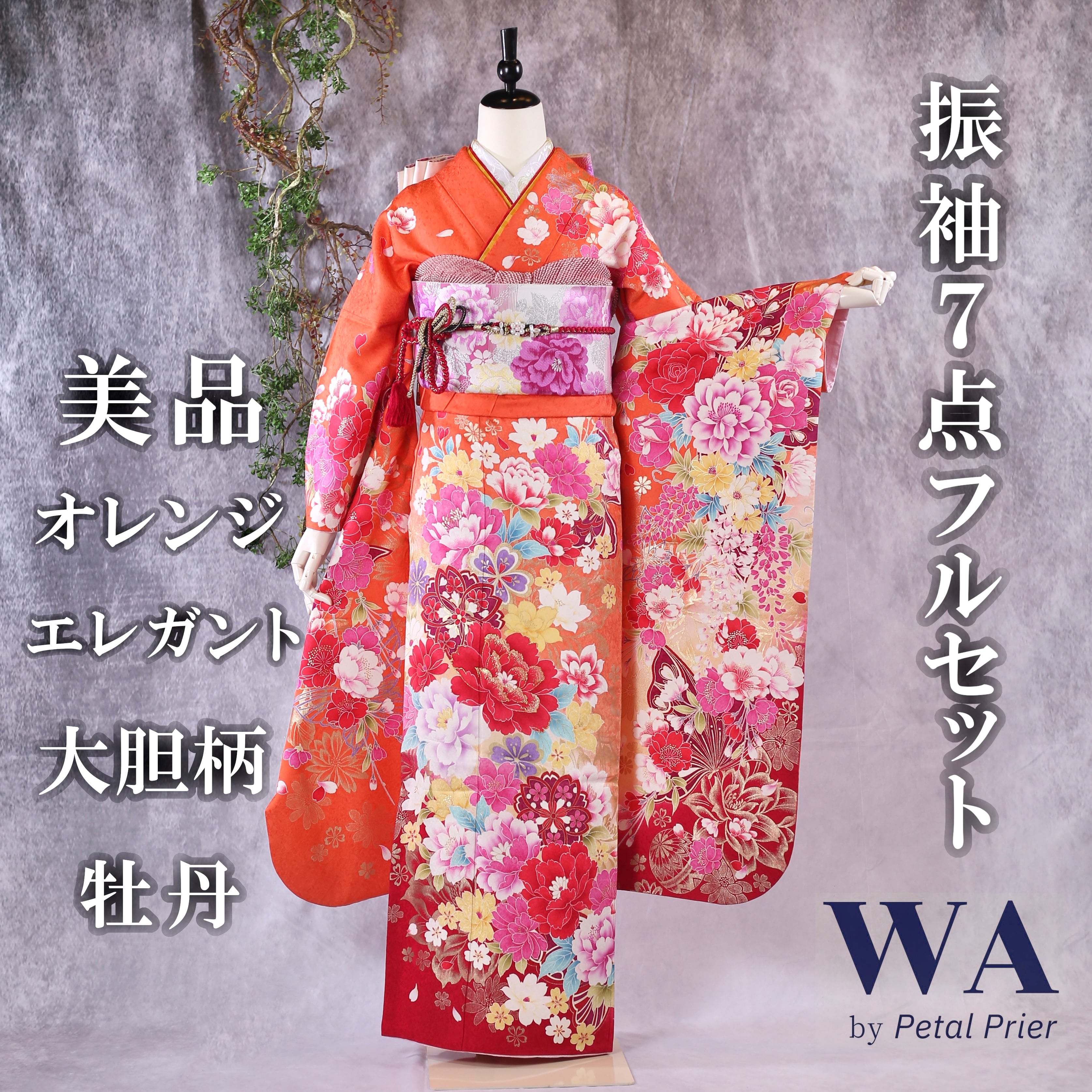 振袖フルセット 振袖セット 振袖 M〜Lサイズ オレンジ×大胆柄 美品 成人式 着物 晴れ着 7点フルセット F-115