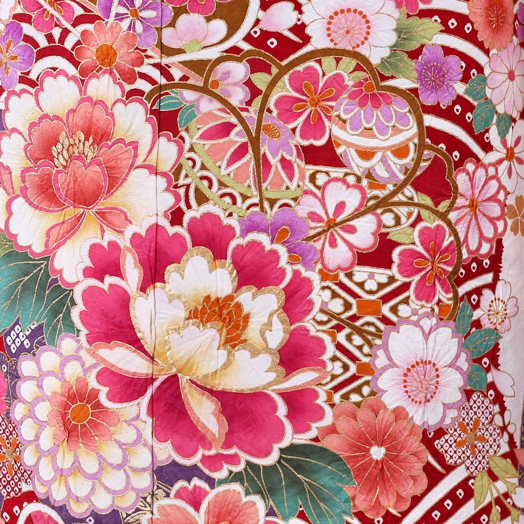 鹿の子柄をベースに牡丹柄が広がる印象的な古典振袖です。