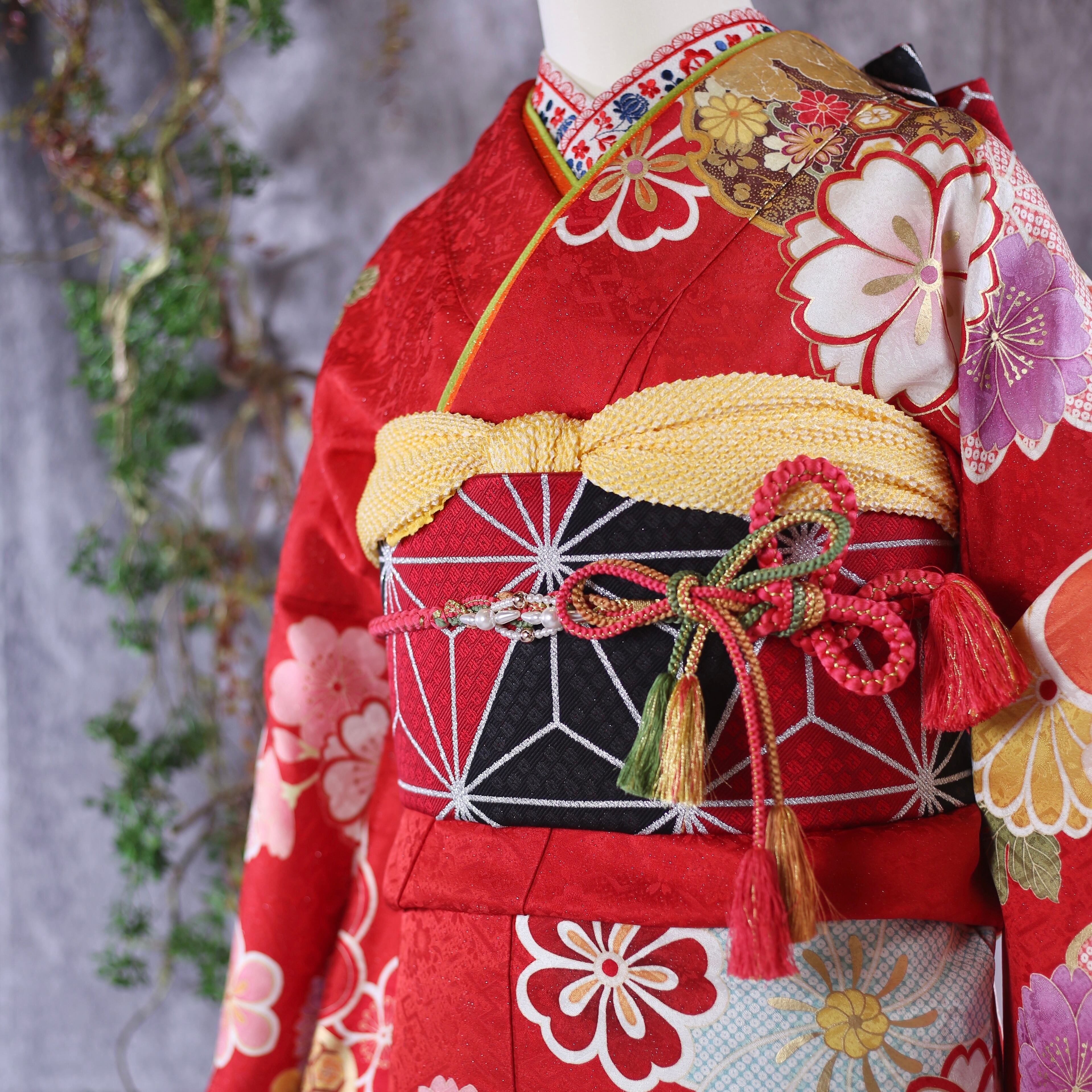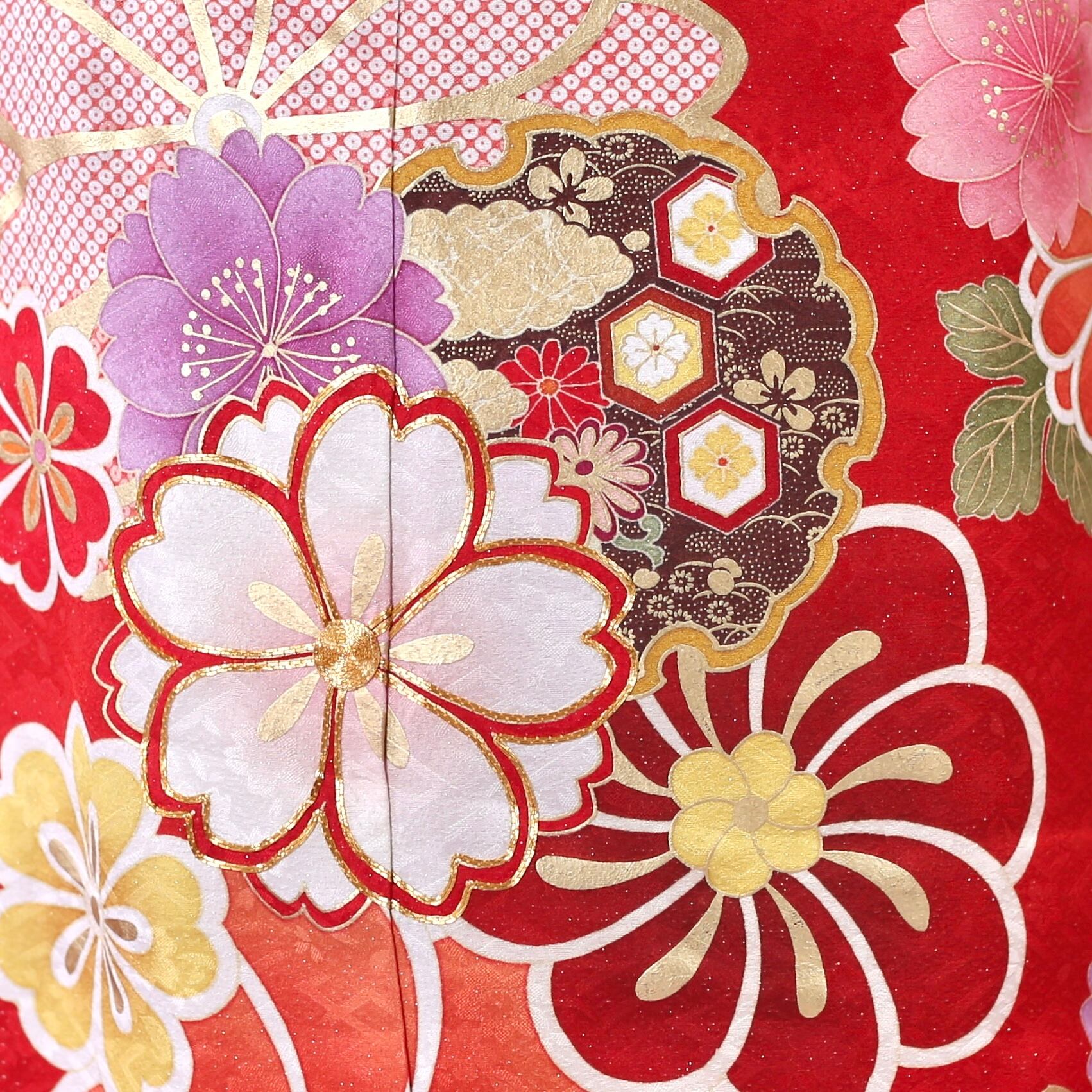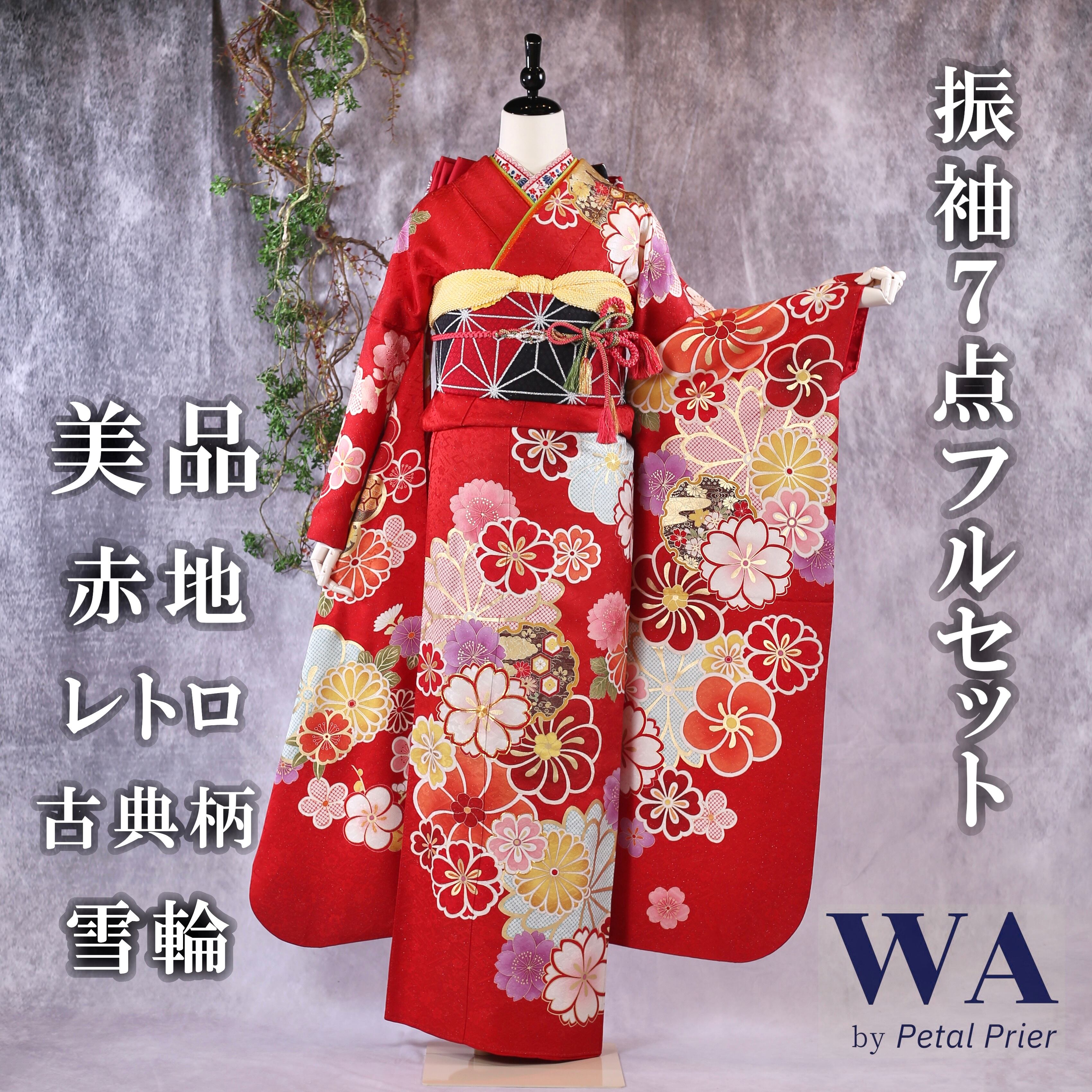 振袖フルセット 振袖セット 振袖 L〜LLサイズ 赤×レトロ 美品 成人式 着物 晴れ着 7点フルセット F-137