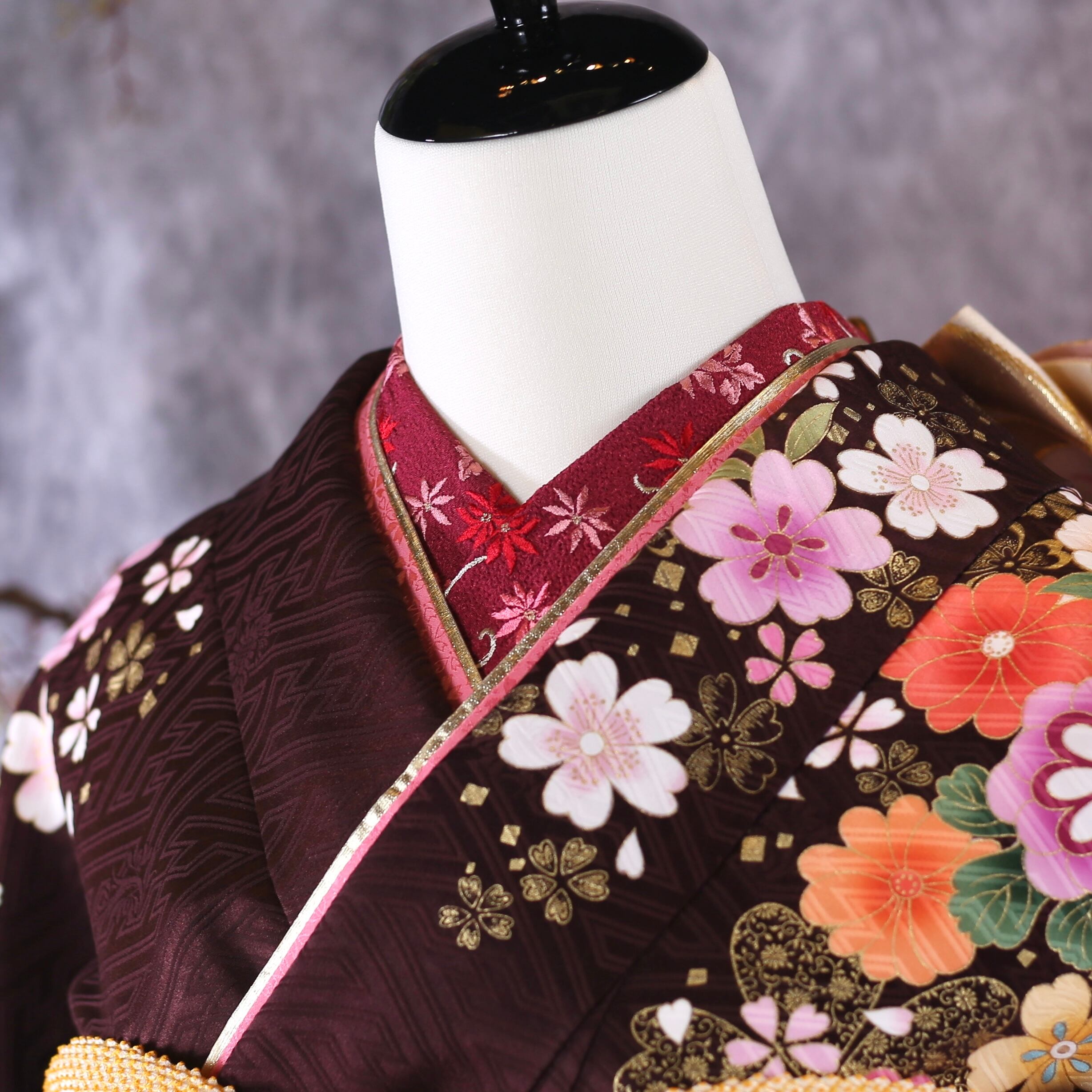 赤みのある茶色地に美しい桜吹雪が舞うように描かれた古典振袖です。