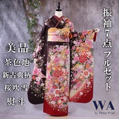振袖フルセット 振袖セット 振袖 L〜LLサイズ 茶×新古典 美品 成人式 着物 晴れ着 7点フルセット F-144