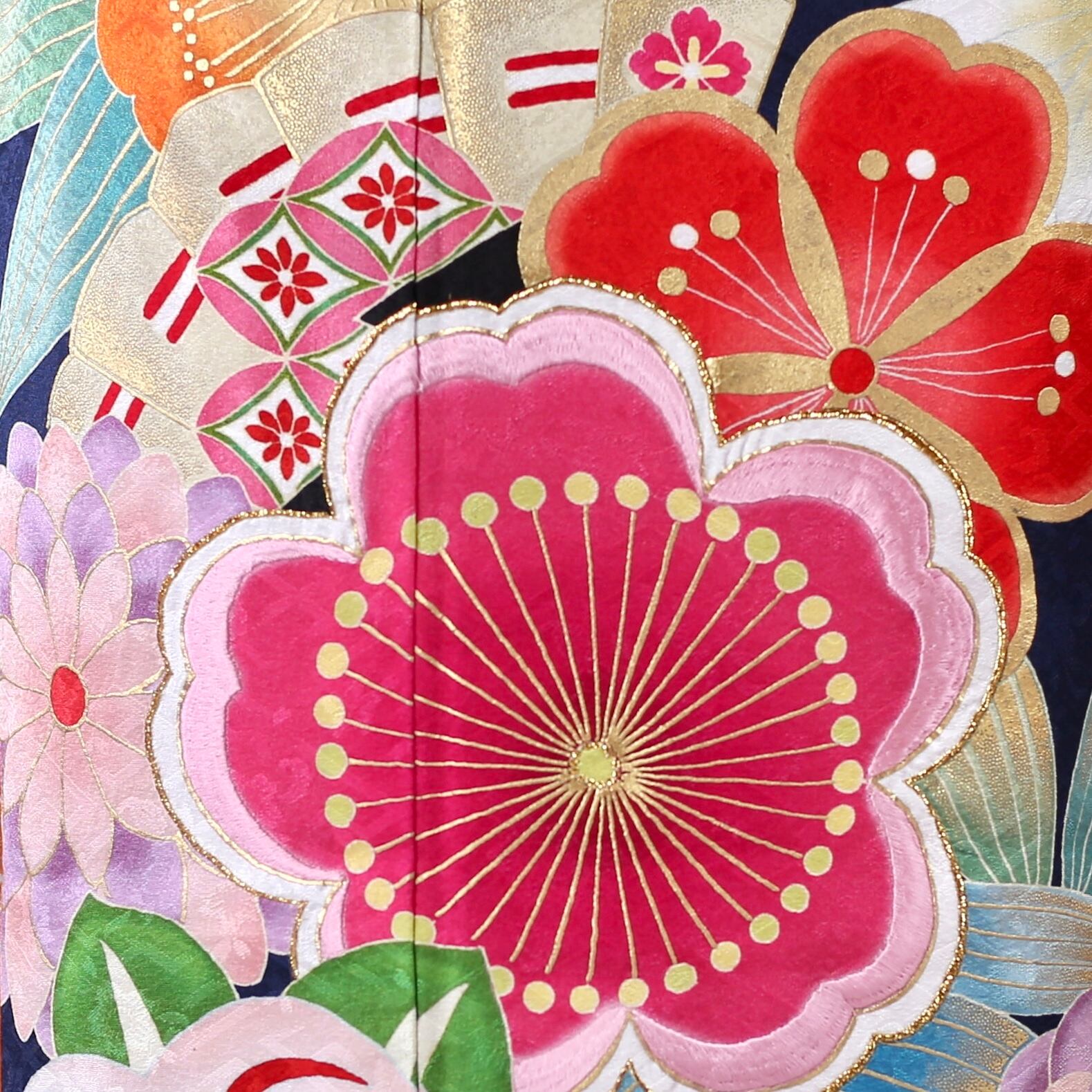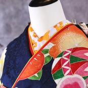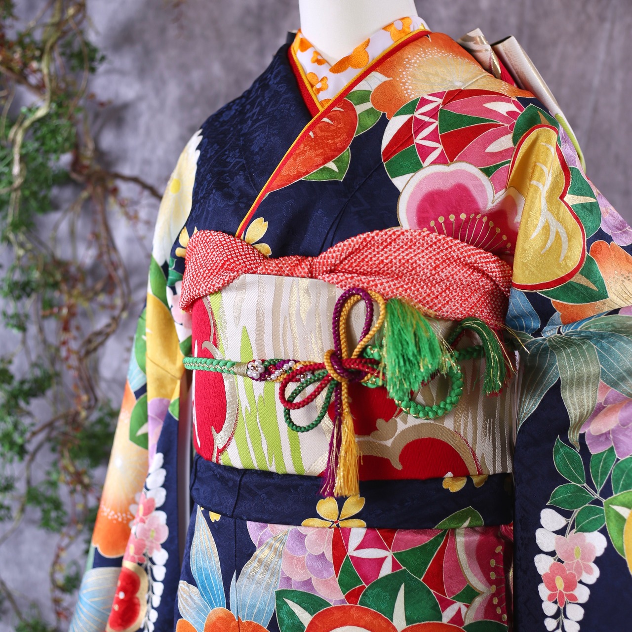 落ち着いた紺地にカラフルな大胆柄のレトロモダンな振袖です。
