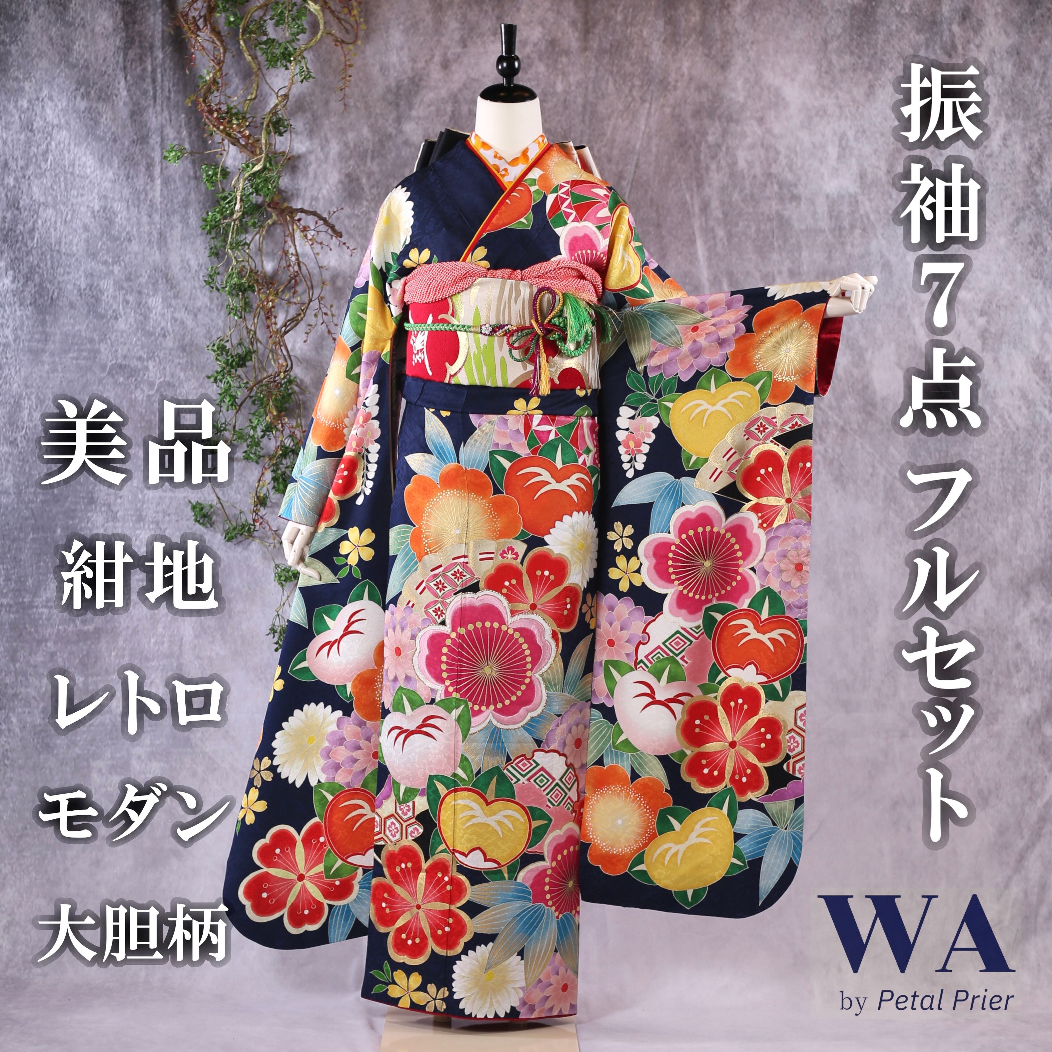 振袖フルセット 振袖セット 振袖 LLサイズ 紺×レトロモダン 美品 成人式 着物 晴れ着 7点フルセット F-162