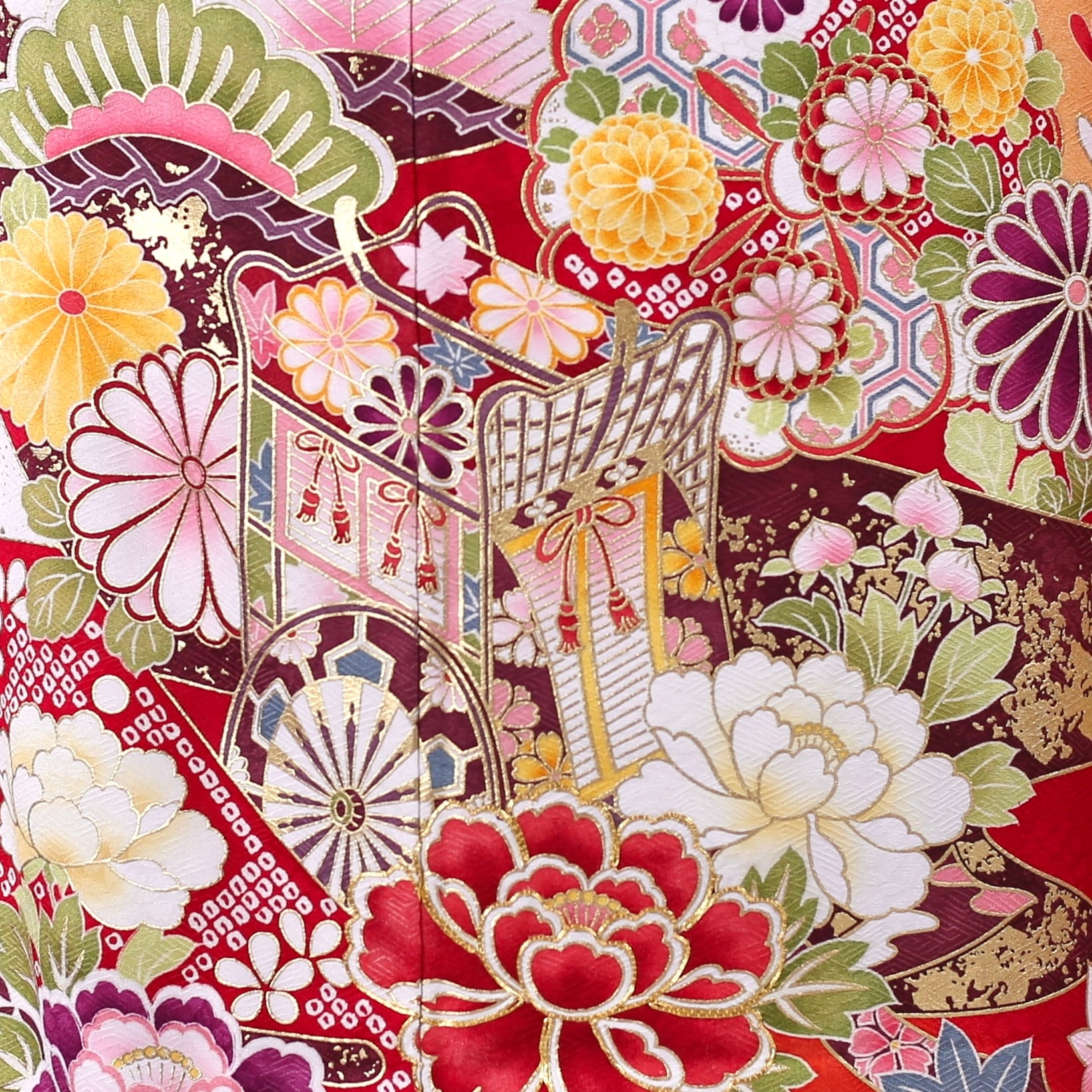 鮮やかな赤地に縁起の良い御所車や松竹梅が映える古典振袖です。