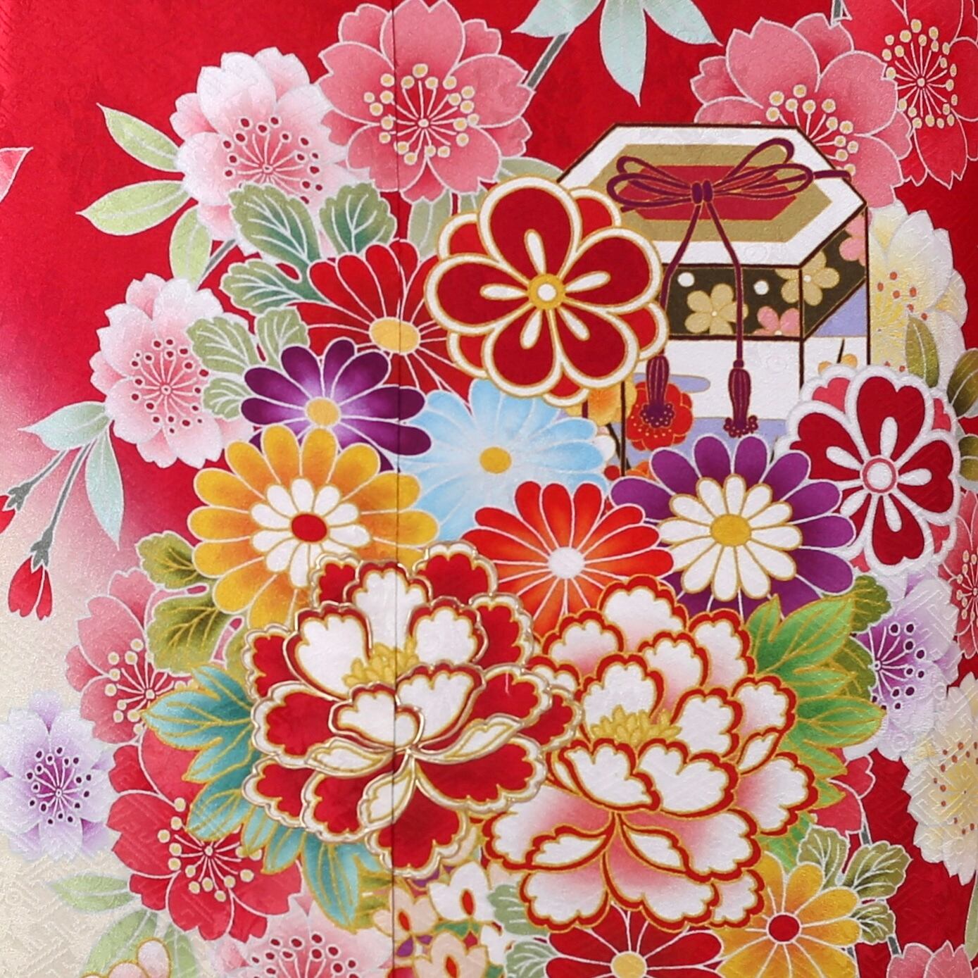 鮮やかな赤地に藤の花や桜吹雪が舞っている振袖です。