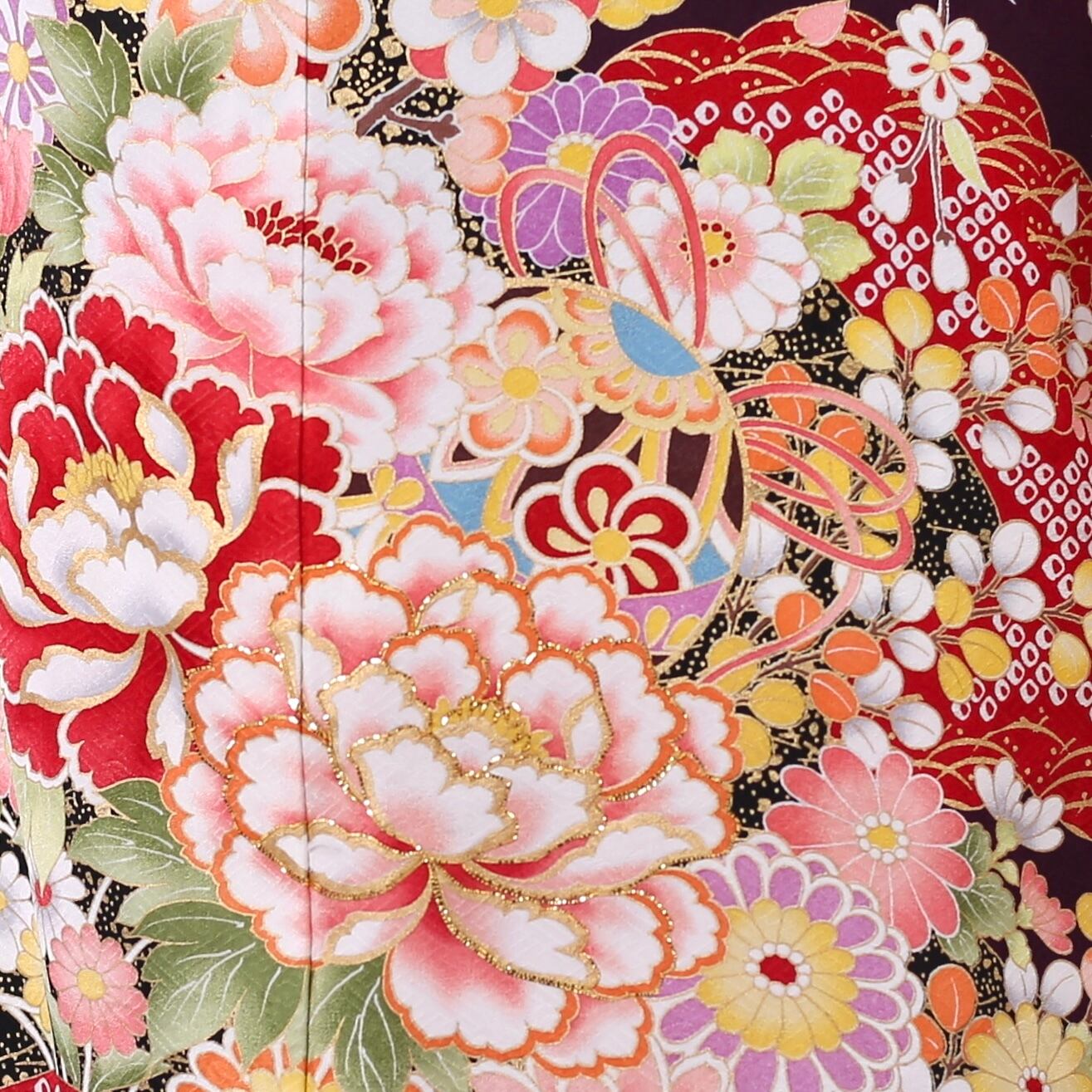 落ち着いた紫地に鹿の子柄や松竹梅が映える古典振袖です。