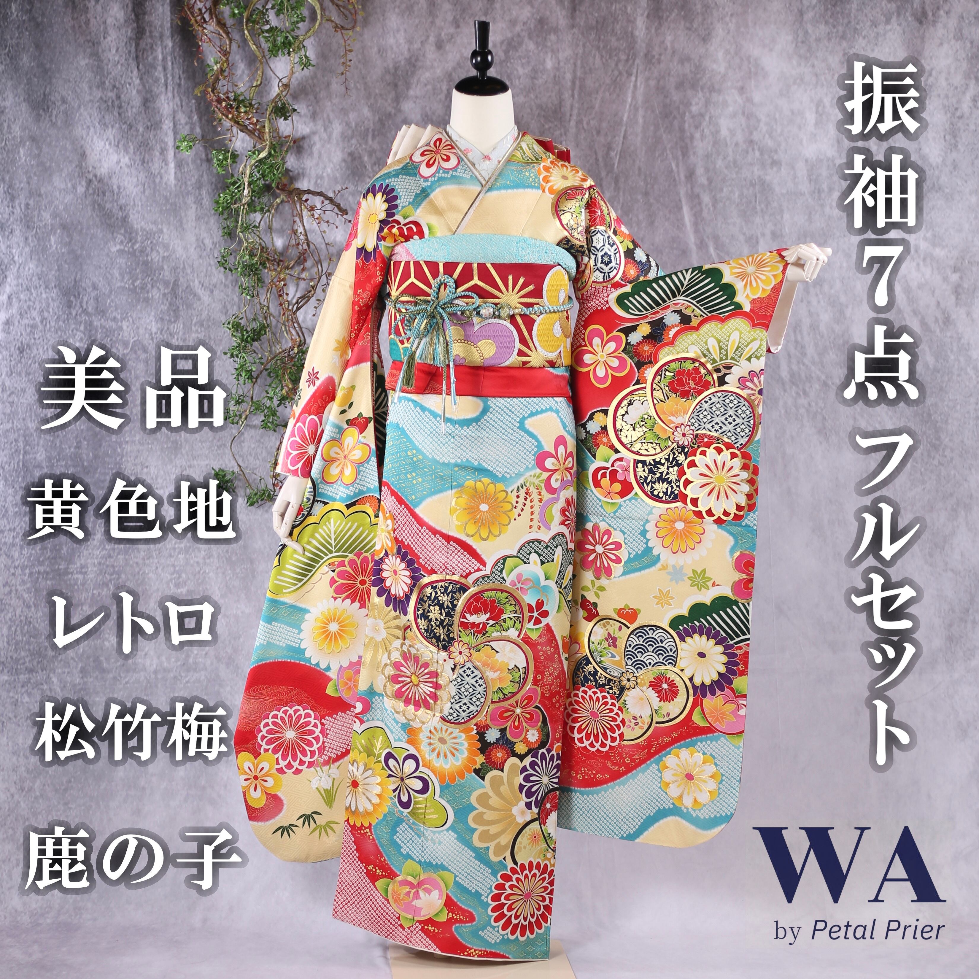 振袖フルセット 振袖セット 振袖 M〜Lサイズ 黄×レトロ 美品 成人式 着物 晴れ着 7点フルセット F-216