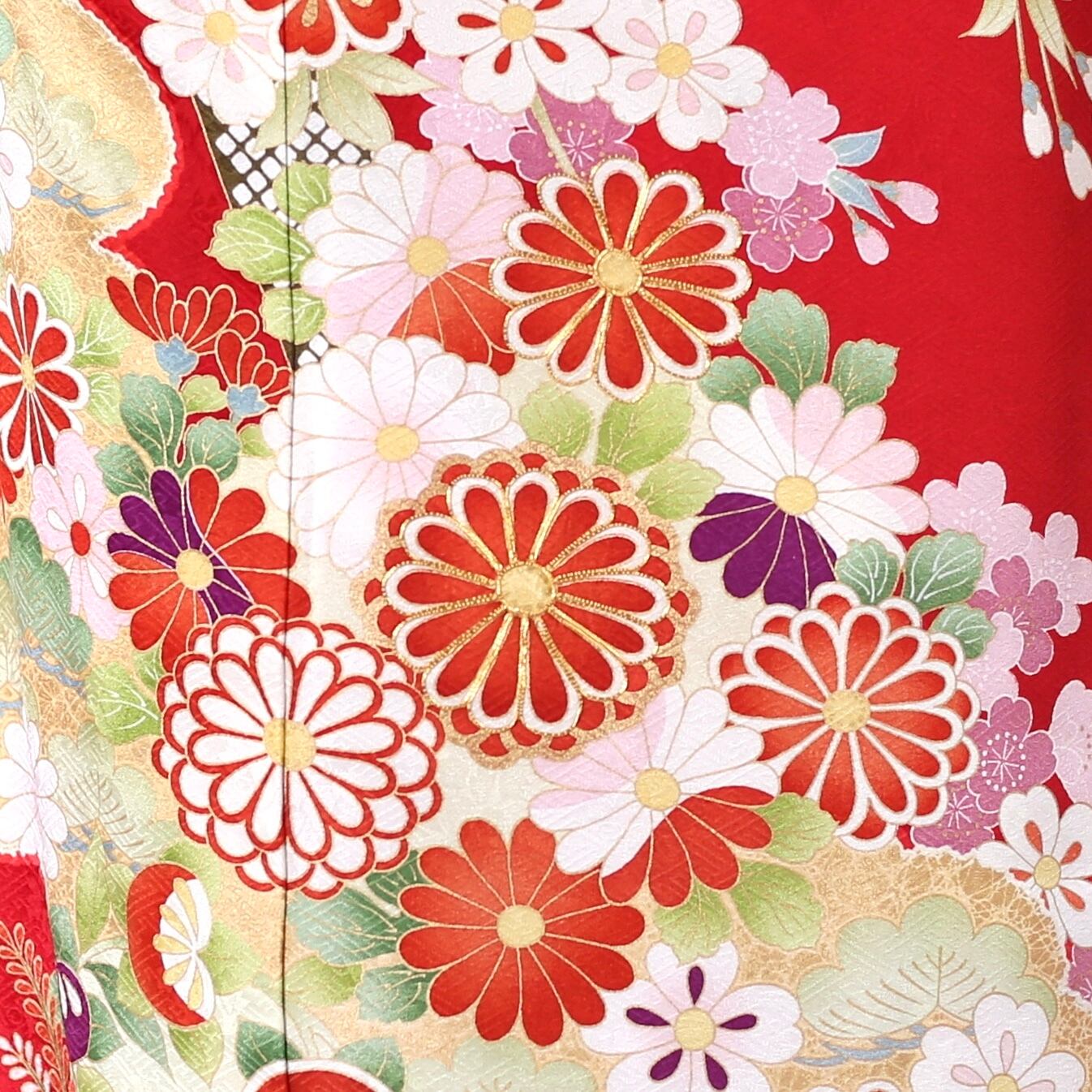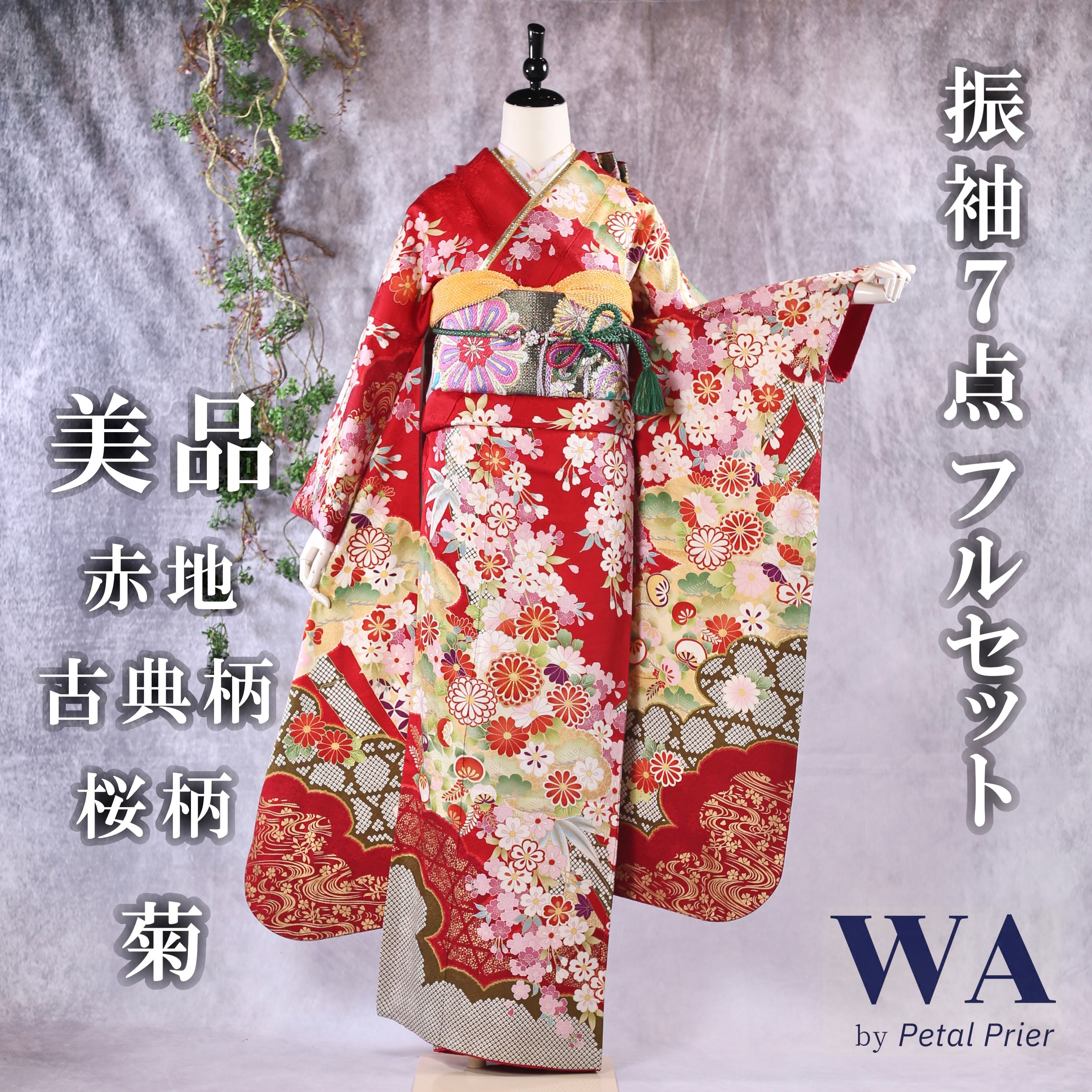 振袖フルセット 振袖セット 振袖 M〜Lサイズ 赤×古典 美品 成人式 着物 晴れ着 7点フルセット F-98