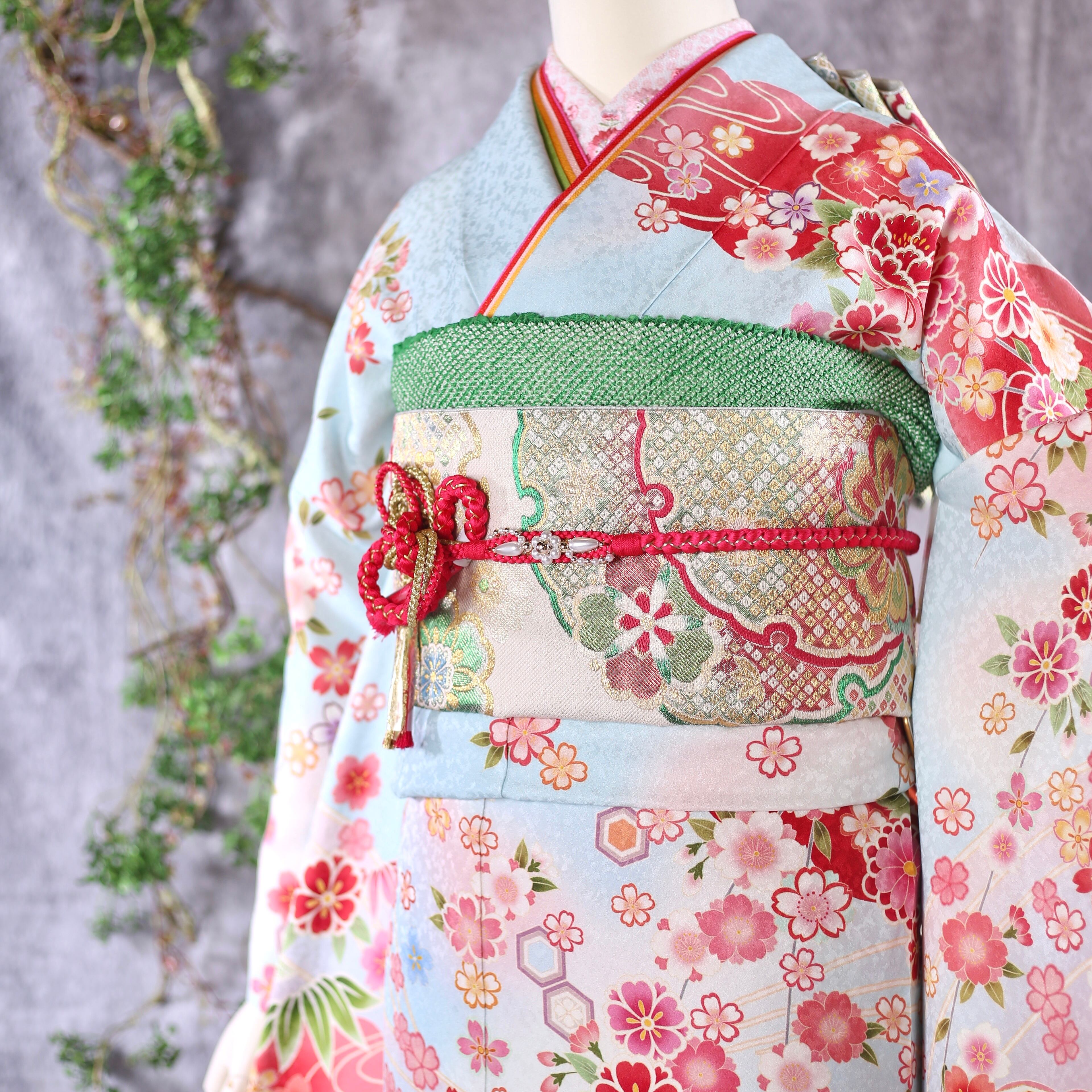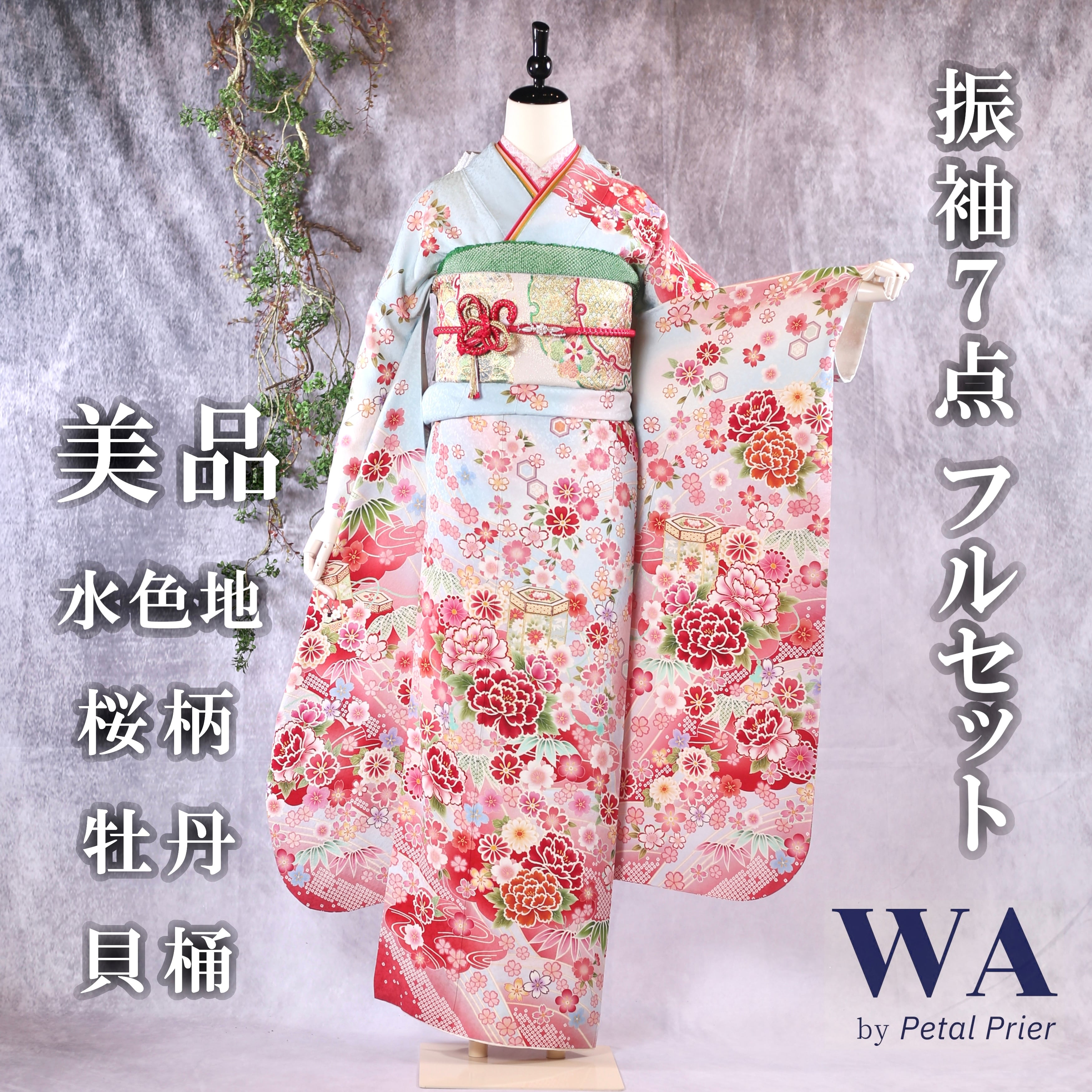振袖フルセット 振袖セット 振袖 Mサイズ 水色×桜 美品 成人式 着物 晴れ着 7点フルセット F-100