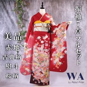 振袖フルセット 振袖セット 振袖 Lサイズ 赤×古典 美品 成人式 着物 晴れ着 7点フルセット KF-24
