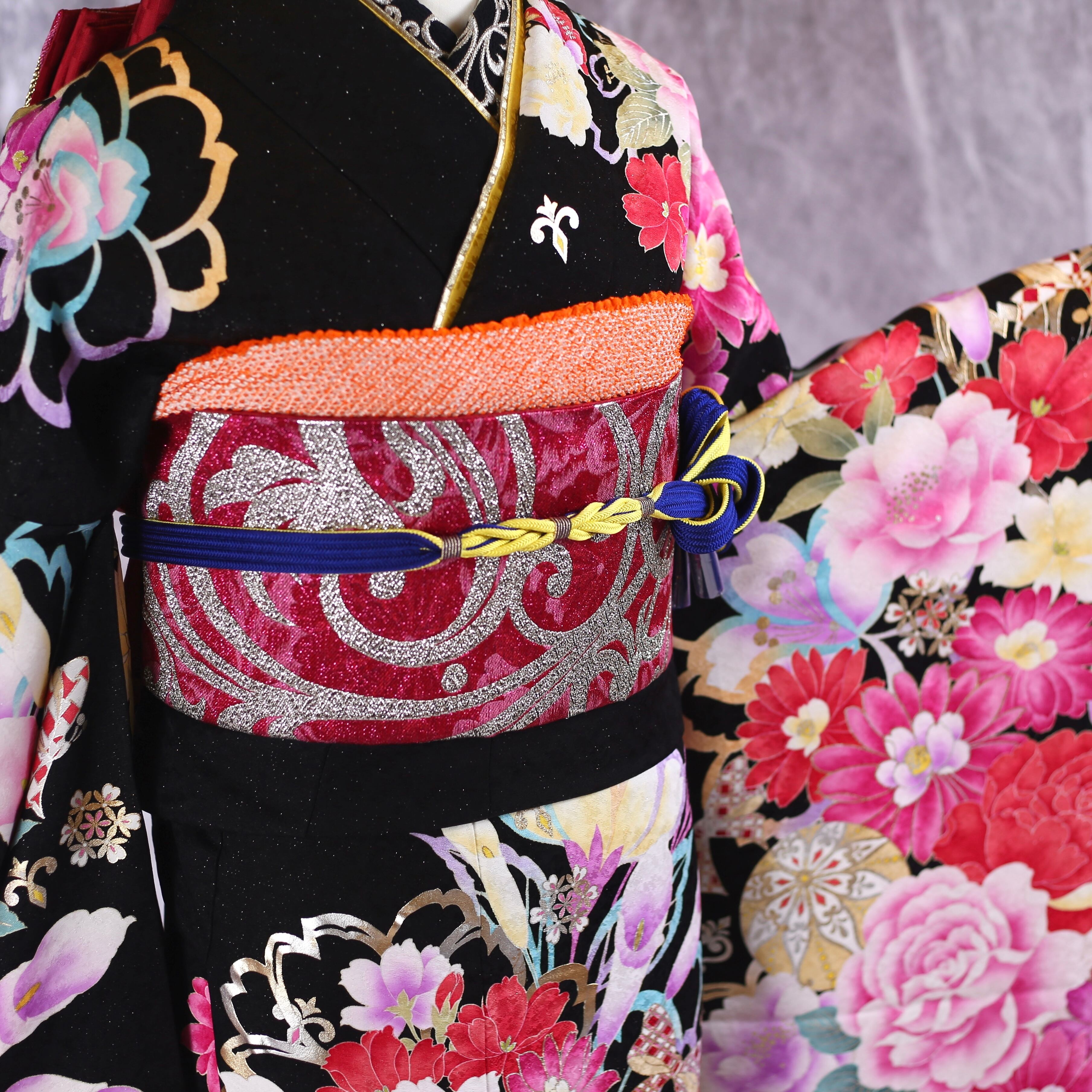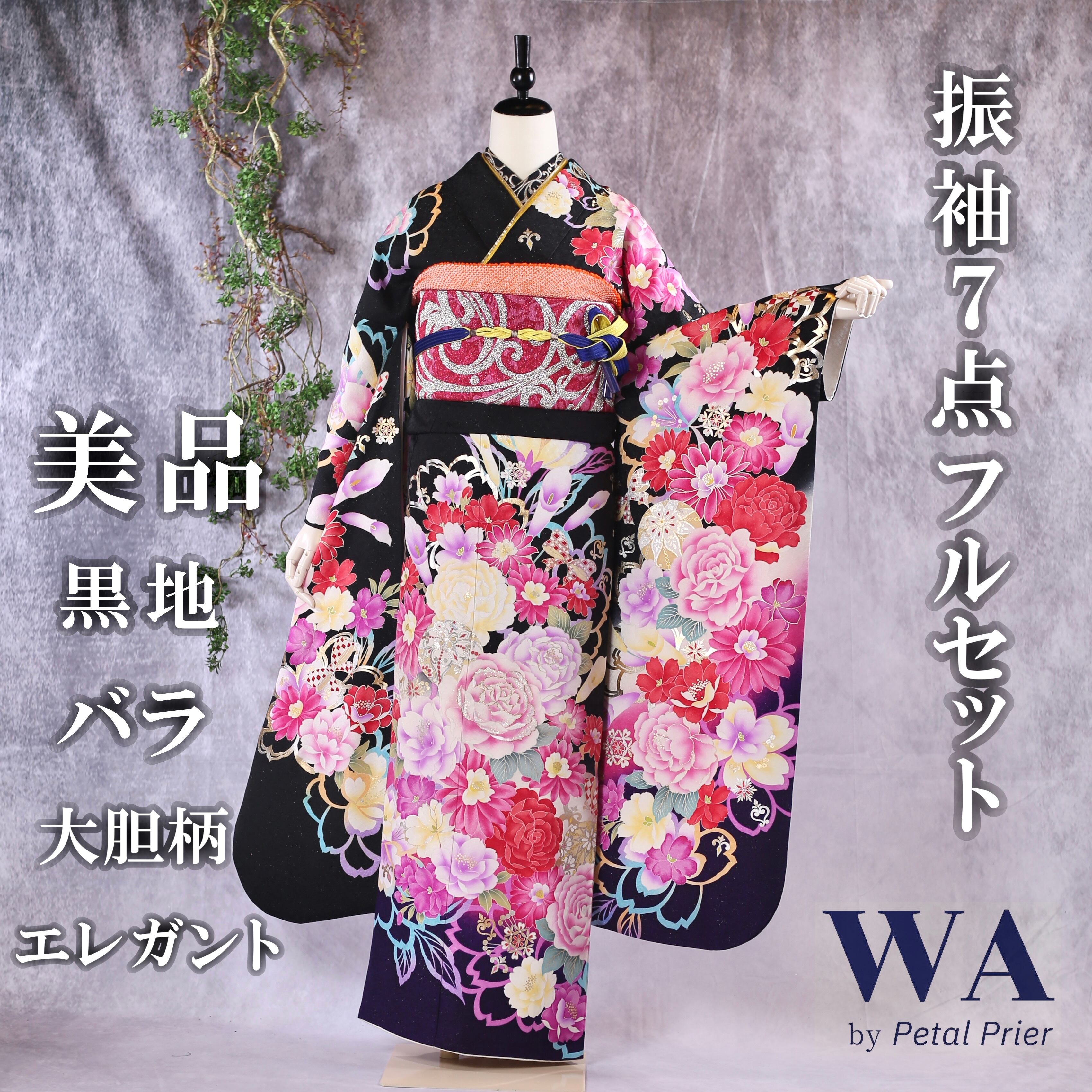 振袖フルセット 振袖セット 振袖 Lサイズ 黒×バラ 美品 成人式 着物 晴れ着 7点フルセット KF-35