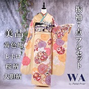振袖フルセット 振袖セット 振袖 Mサイズ 黄×レトロ 美品 成人式 着物 晴れ着 7点フルセット KF-46
