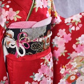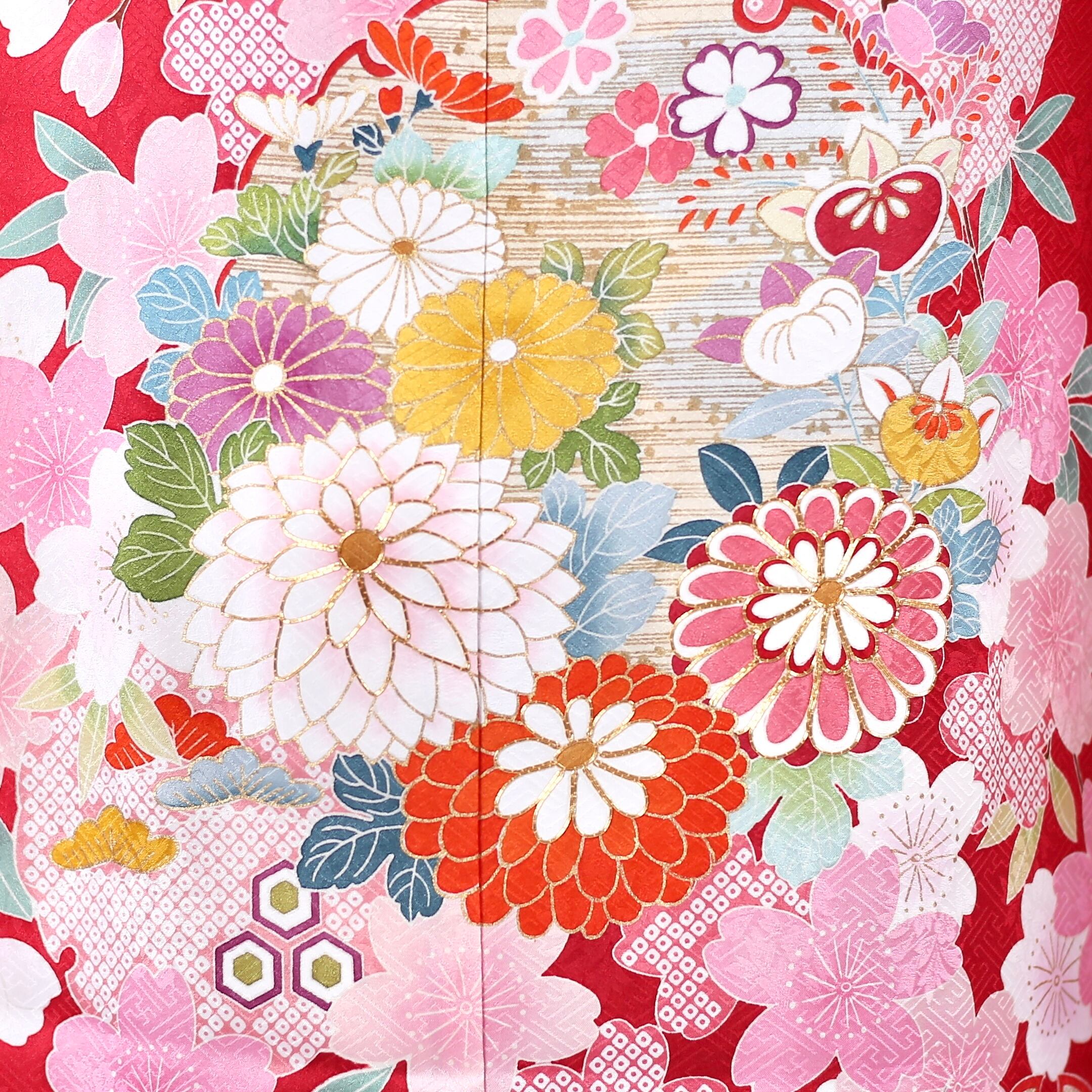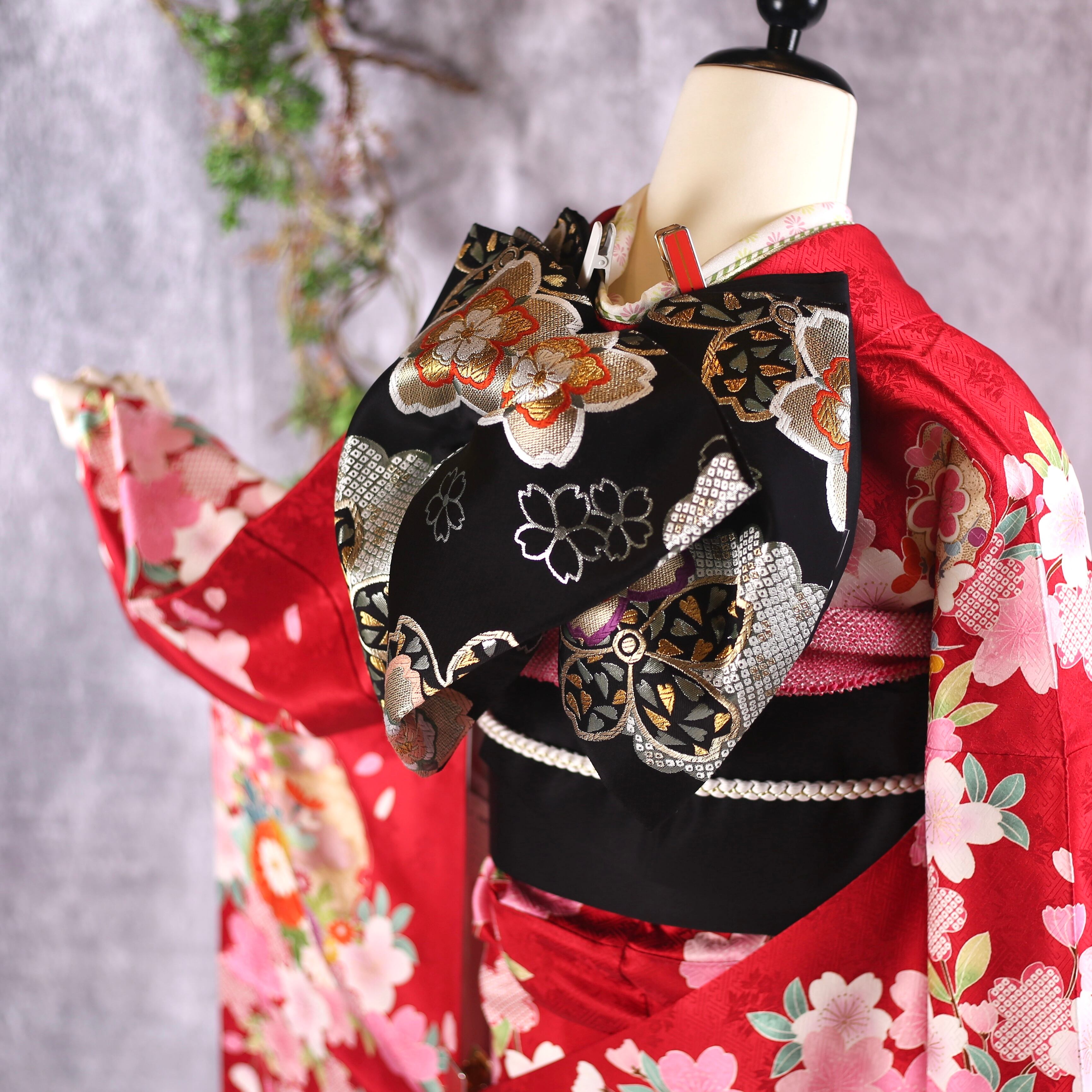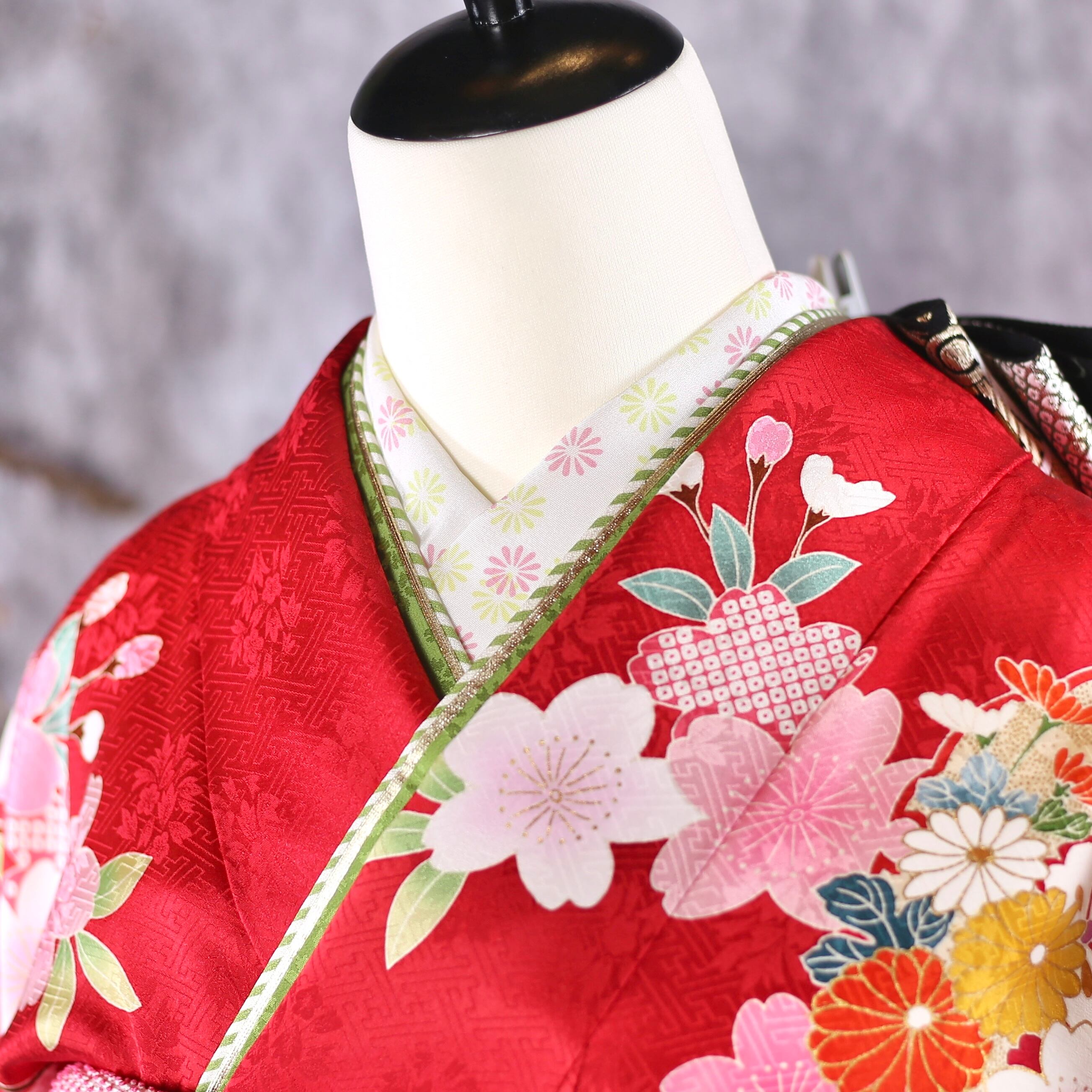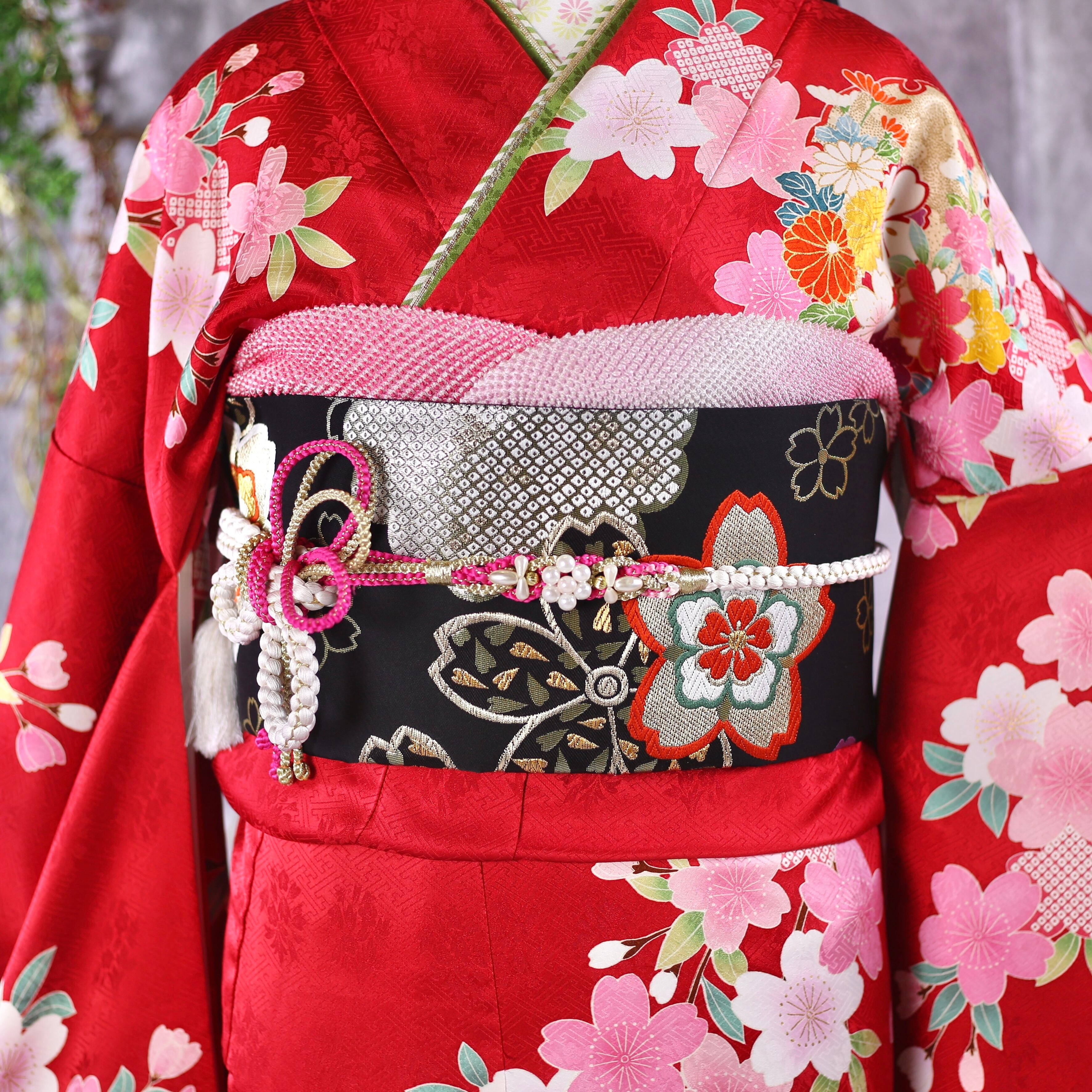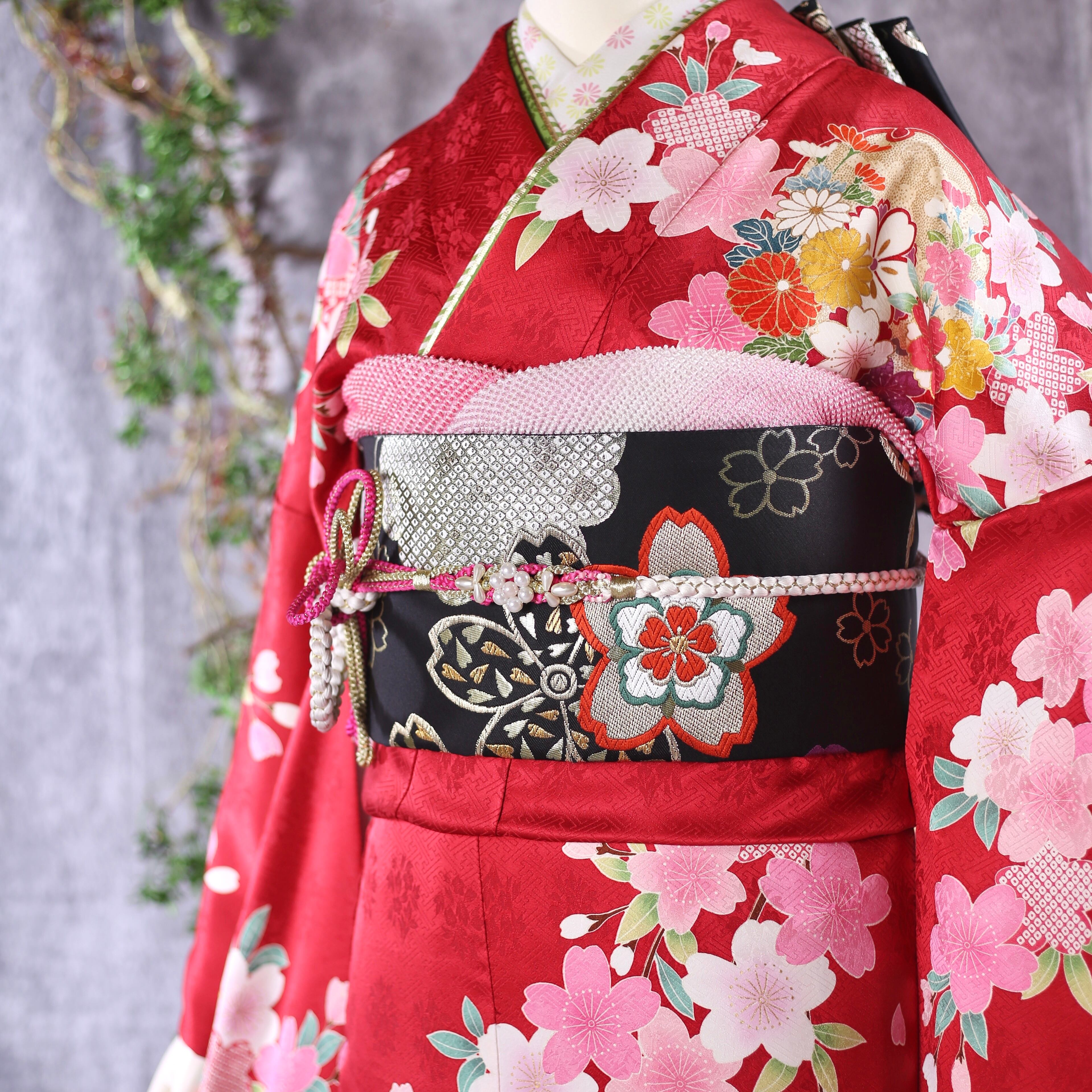 赤地に鮮やかな鹿の子柄の桜吹雪が散りばめられた古典振袖です。
