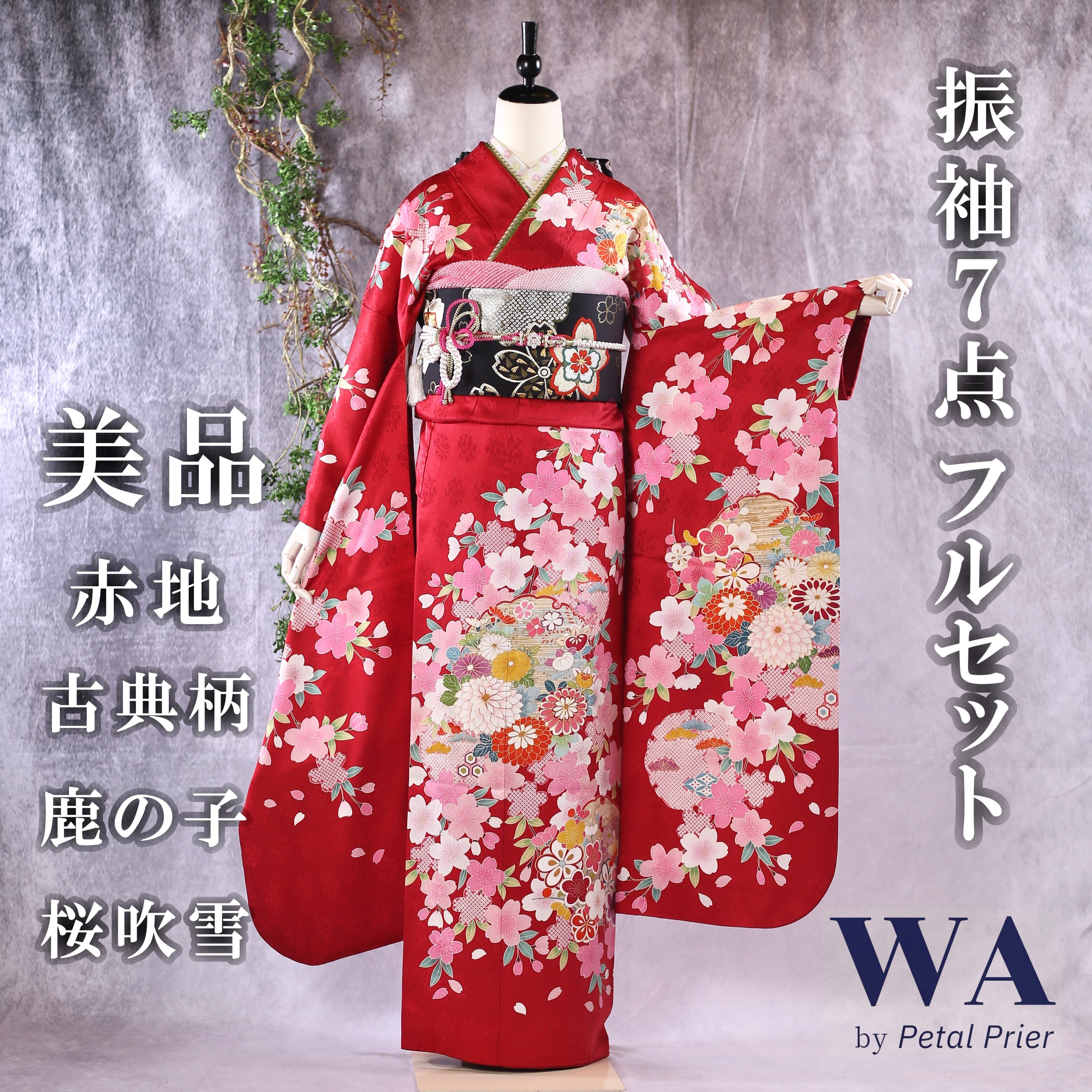 振袖フルセット 振袖セット 振袖 Lサイズ 赤×古典 美品 成人式 着物 晴れ着 7点フルセット F-105
