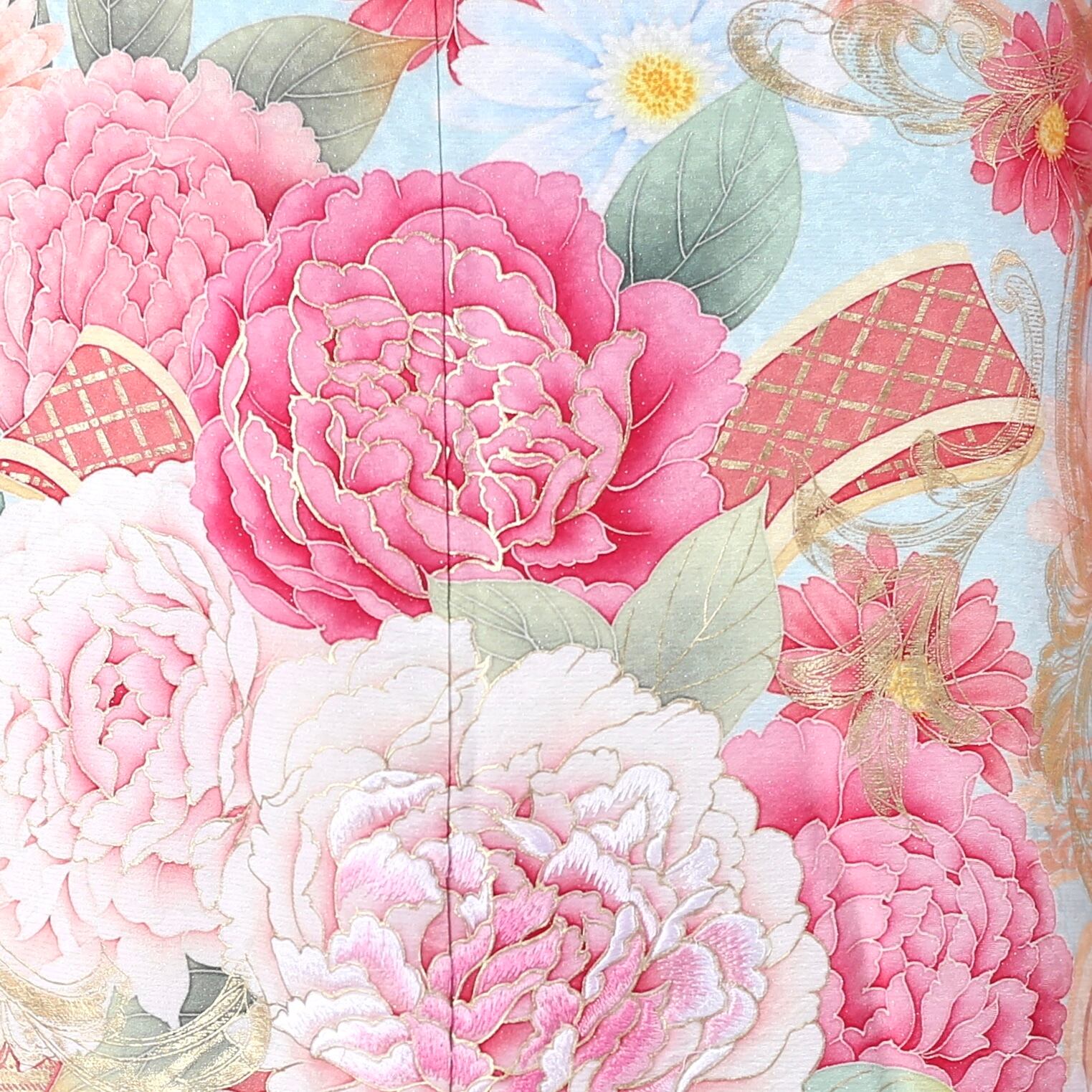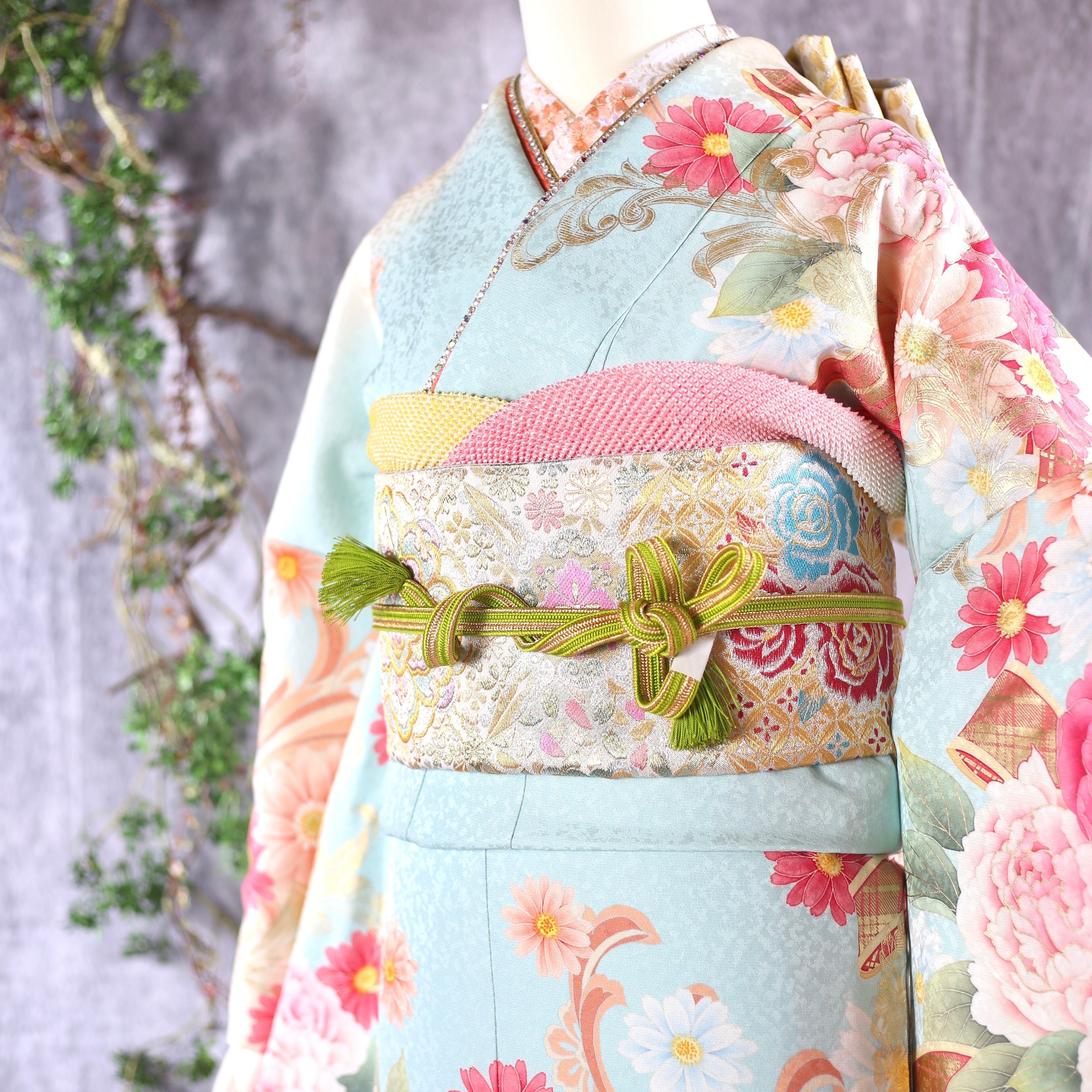 優しく淡い水色地に牡丹と熨斗柄が映える振袖です。